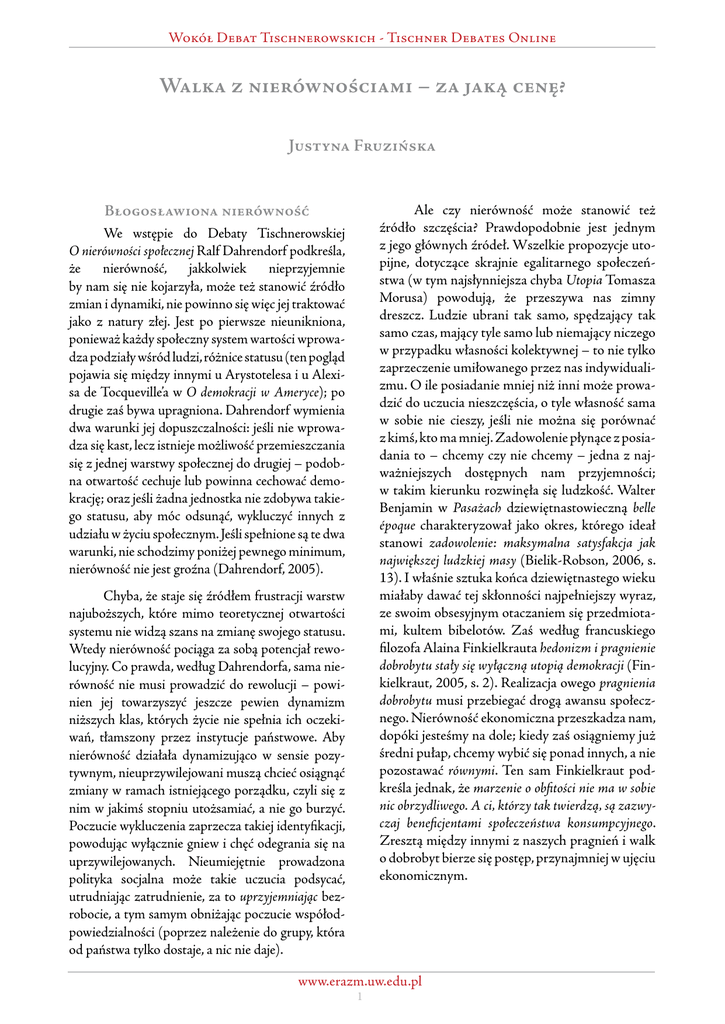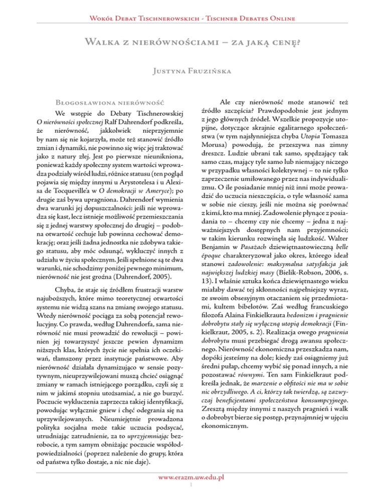Wokół Debat Tischnerowskich - Tischner Debates Online Walka z nierównościami – za jaką cenę? Justyna Fruzińska Błogosławiona nierówność Ale czy nierówność może stanowić też źródło szczęścia? Prawdopodobnie jest jednym z jego głównych źródeł. Wszelkie propozycje utopijne, dotyczące skrajnie egalitarnego społeczeństwa (w tym najsłynniejsza chyba Utopia Tomasza Morusa) powodują, że przeszywa nas zimny dreszcz. Ludzie ubrani tak samo, spędzający tak samo czas, mający tyle samo lub niemający niczego w przypadku własności kolektywnej – to nie tylko zaprzeczenie umiłowanego przez nas indywidualizmu. O ile posiadanie mniej niż inni może prowadzić do uczucia nieszczęścia, o tyle własność sama w sobie nie cieszy, jeśli nie można się porównać z kimś, kto ma mniej. Zadowolenie płynące z posiadania to – chcemy czy nie chcemy – jedna z najważniejszych dostępnych nam przyjemności; w takim kierunku rozwinęła się ludzkość. Walter Benjamin w Pasażach dziewiętnastowieczną belle époque charakteryzował jako okres, którego ideał stanowi zadowolenie: maksymalna satysfakcja jak największej ludzkiej masy (Bielik-Robson, 2006, s. 13). I właśnie sztuka końca dziewiętnastego wieku miałaby dawać tej skłonności najpełniejszy wyraz, ze swoim obsesyjnym otaczaniem się przedmiotami, kultem bibelotów. Zaś według francuskiego filozofa Alaina Finkielkrauta hedonizm i pragnienie dobrobytu stały się wyłączną utopią demokracji (Finkielkraut, 2005, s. 2). Realizacja owego pragnienia dobrobytu musi przebiegać drogą awansu społecznego. Nierówność ekonomiczna przeszkadza nam, dopóki jesteśmy na dole; kiedy zaś osiągniemy już średni pułap, chcemy wybić się ponad innych, a nie pozostawać równymi. Ten sam Finkielkraut podkreśla jednak, że marzenie o obfitości nie ma w sobie nic obrzydliwego. A ci, którzy tak twierdzą, są zazwyczaj beneficjentami społeczeństwa konsumpcyjnego. Zresztą między innymi z naszych pragnień i walk o dobrobyt bierze się postęp, przynajmniej w ujęciu ekonomicznym. We wstępie do Debaty Tischnerowskiej O nierówności społecznej Ralf Dahrendorf podkreśla, że nierówność, jakkolwiek nieprzyjemnie by nam się nie kojarzyła, może też stanowić źródło zmian i dynamiki, nie powinno się więc jej traktować jako z natury złej. Jest po pierwsze nieunikniona, ponieważ każdy społeczny system wartości wprowadza podziały wśród ludzi, różnice statusu (ten pogląd pojawia się między innymi u Arystotelesa i u Alexisa de Tocqueville’a w O demokracji w Ameryce); po drugie zaś bywa upragniona. Dahrendorf wymienia dwa warunki jej dopuszczalności: jeśli nie wprowadza się kast, lecz istnieje możliwość przemieszczania się z jednej warstwy społecznej do drugiej – podobna otwartość cechuje lub powinna cechować demokrację; oraz jeśli żadna jednostka nie zdobywa takiego statusu, aby móc odsunąć, wykluczyć innych z udziału w życiu społecznym. Jeśli spełnione są te dwa warunki, nie schodzimy poniżej pewnego minimum, nierówność nie jest groźna (Dahrendorf, 2005). Chyba, że staje się źródłem frustracji warstw najuboższych, które mimo teoretycznej otwartości systemu nie widzą szans na zmianę swojego statusu. Wtedy nierówność pociąga za sobą potencjał rewolucyjny. Co prawda, według Dahrendorfa, sama nierówność nie musi prowadzić do rewolucji – powinien jej towarzyszyć jeszcze pewien dynamizm niższych klas, których życie nie spełnia ich oczekiwań, tłamszony przez instytucje państwowe. Aby nierówność działała dynamizująco w sensie pozytywnym, nieuprzywilejowani muszą chcieć osiągnąć zmiany w ramach istniejącego porządku, czyli się z nim w jakimś stopniu utożsamiać, a nie go burzyć. Poczucie wykluczenia zaprzecza takiej identyfikacji, powodując wyłącznie gniew i chęć odegrania się na uprzywilejowanych. Nieumiejętnie prowadzona polityka socjalna może takie uczucia podsycać, utrudniając zatrudnienie, za to uprzyjemniając bezrobocie, a tym samym obniżając poczucie współodpowiedzialności (poprzez należenie do grupy, która od państwa tylko dostaje, a nic nie daje). www.erazm.uw.edu.pl Wokół Debat Tischnerowskich - Tischner Debates Online Nie mówiąc o tym, że w świecie egalitarnym zmuszeni bylibyśmy, jak pisze Tocqueville, do odkrycia prawdy o sobie samych, nie zawsze przyjemnej. Kiedy pewien porządek społeczny uznawano za naturalny i święty, nierówności co prawda nie dawało się strząsnąć, ale za to istniała zbawienna możliwość przypisywania jej własnych porażek. Dziś podobna wymówka wydaje się znacznie trudniejsza do zaakceptowania. Również Ralf Dahrendorf zwrócił uwagę na różnicę pomiędzy statusem dziedziczonym a akademickim. Ten pierwszy zależy wyłącznie od szczęścia, zatem nie wiadomo, do kogo kierować pretensje o przynależność do warstwy nieuprzywilejowanej. Natomiast ten drugi charakteryzuje się większą podmiotowością i za jego brak w przypadku demokracji powinno się obwiniać tylko siebie i własną nieudolność. Równość może być kubłem zimnej wody, bardzo nieprzyjemnym dla naszej nieutulonej miłości własnej. W definicji Leszka Kołakowskiego nasze poczucie równości sprowadza się do godności ludzkiej, intelektu i wolnej woli czy też sumienia. Według Finkielkrauta zaczął ją promować judaizm, stawiając wszystkich przed obliczem Jedynego Boga (Finkielkraut, 1999, s. 11), a za nim poszło chrześcijaństwo głoszące jedność ludzi w Chrystusie. W różnych momentach naszej historii religia faktycznie bywała gwarantem przynajmniej pojęcia równości: Jeśli Bóg nie zajmuje określonego miejsca – pisze Finkielkraut za Bartolomé de Las Casas – wszystkie miejsca są jednakowo usytuowane względem Boga. Każdy lud jest równie bliski i równie oddalony od niebiańskiego źródła (Finkielkraut, 1999, s. 18). Później z