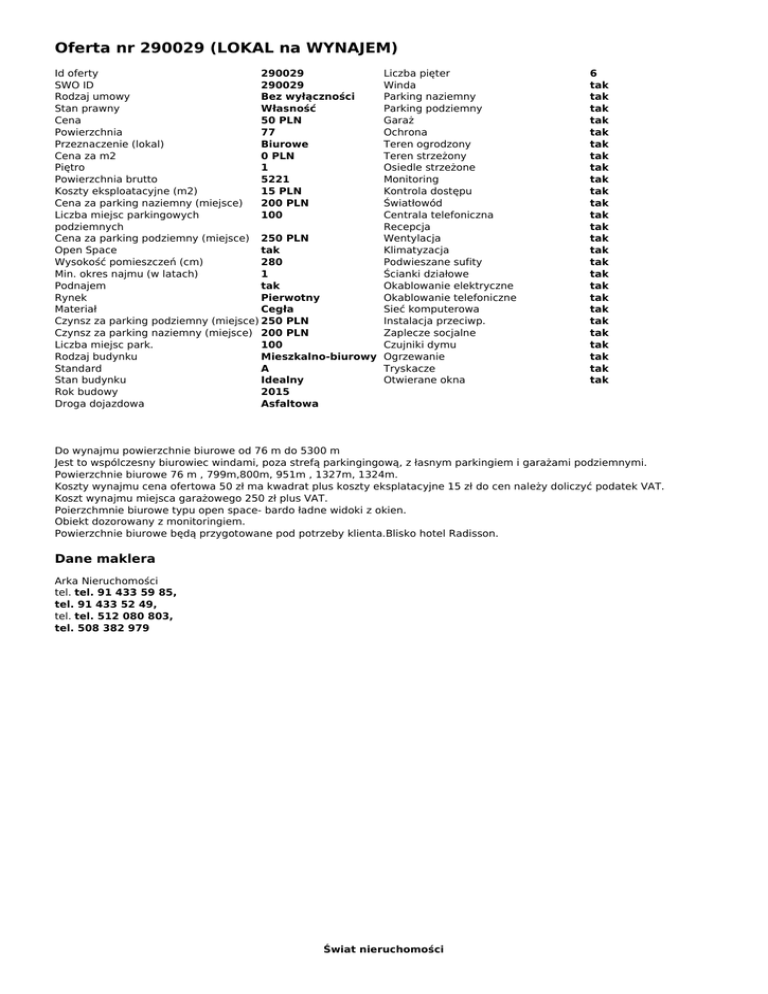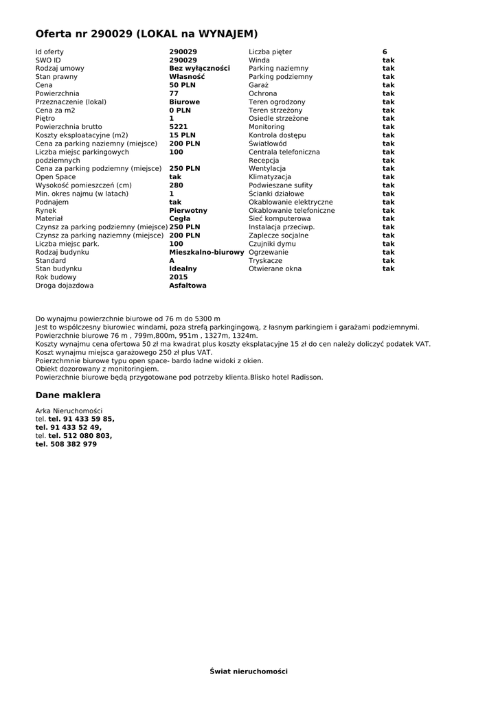 Oferta nr 290029 (LOKAL na WYNAJEM) Id oferty 290029 SWO ID 290029 Rodzaj umowy Bez wyłączności Stan prawny Własność Cena 50 PLN Powierzchnia 77 Przeznaczenie (lokal) Biurowe Cena za m2 0 PLN Piętro 1 Powierzchnia brutto 5221 Koszty eksploatacyjne (m2) 15 PLN Cena za parking naziemny (miejsce) 200 PLN Liczba miejsc parkingowych 100 podziemnych Cena za parking podziemny (miejsce) 250 PLN Open Space tak Wysokość pomieszczeń (cm) 280 Min. okres najmu (w latach) 1 Podnajem tak Rynek Pierwotny Materiał Cegła Czynsz za parking podziemny (miejsce) 250 PLN Czynsz za parking naziemny (miejsce) 200 PLN Liczba miejsc park. 100 Rodzaj budynku Mieszkalno-biurowy Standard A Stan budynku Idealny Rok budowy 2015 Droga dojazdowa Asfaltowa Liczba pięter Winda Parking naziemny Parking podziemny Garaż Ochrona Teren ogrodzony Teren strzeżony Osiedle strzeżone Monitoring Kontrola dostępu Światłowód Centrala telefoniczna Recepcja Wentylacja Klimatyzacja Podwieszane sufity Ścianki działowe Okablowanie elektryczne Okablowanie telefoniczne Sieć komputerowa Instalacja przeciwp. Zaplecze socjalne Czujniki dymu Ogrzewanie Tryskacze Otwierane okna 6 tak tak tak tak tak tak tak tak tak tak tak tak tak tak tak tak tak tak tak tak tak tak tak tak tak tak Do wynajmu powierzchnie biurowe od 76 m do 5300 m Jest to wspólczesny biurowiec windami, poza strefą parkingingową, z łasnym parkingiem i garażami podziemnymi. Powierzchnie biurowe 76 m , 799m,800m, 951m , 1327m, 1324m. Koszty wynajmu cena ofertowa 50 zł ma kwadrat plus koszty eksplatacyjne 15 zł do cen należy doliczyć podatek VAT. Koszt wynajmu miejsca garażowego 250 zł plus VAT. Poierzchmnie biurowe typu open space- bardo ładne widoki z okien. Obiekt dozorowany z monitoringiem. Powierzchnie biurowe będą przygotowane pod potrzeby klienta.Blisko hotel Radisson. Dane maklera Arka Nieruchomości tel. tel. 91 433 59 85, tel. 91 433 52 49, tel. tel. 512 080 803, tel. 508 382 979 Świat nieruchomości Powered by TCPDF (www.tcpdf.org)