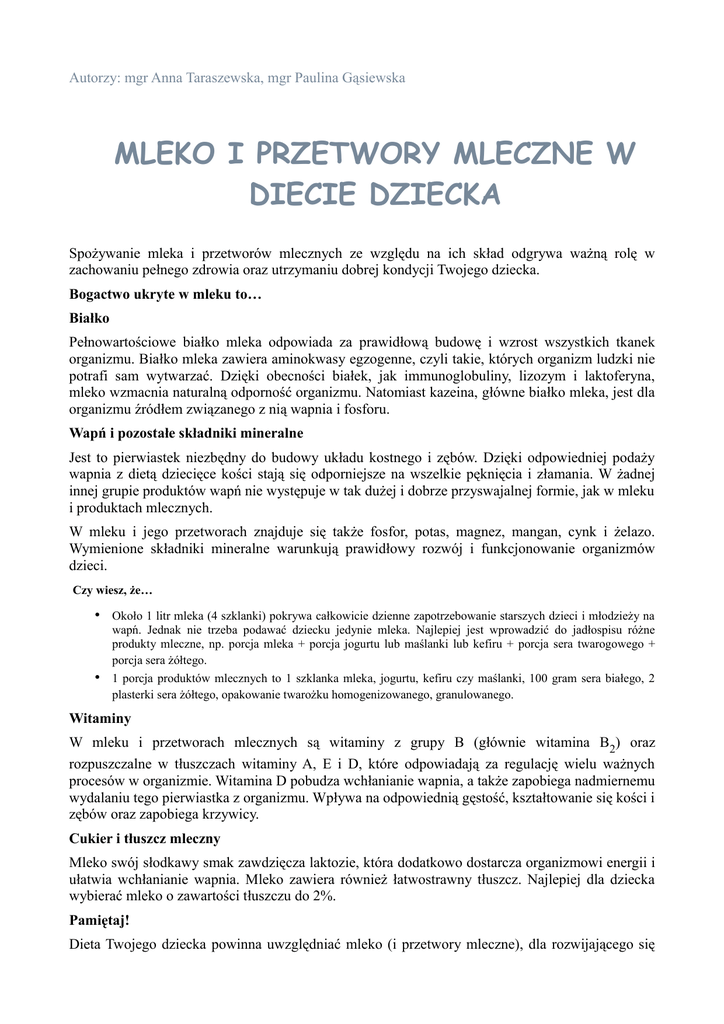 MLEKO I PRZETWORY MLECZNE W DIECIE DZIECKA