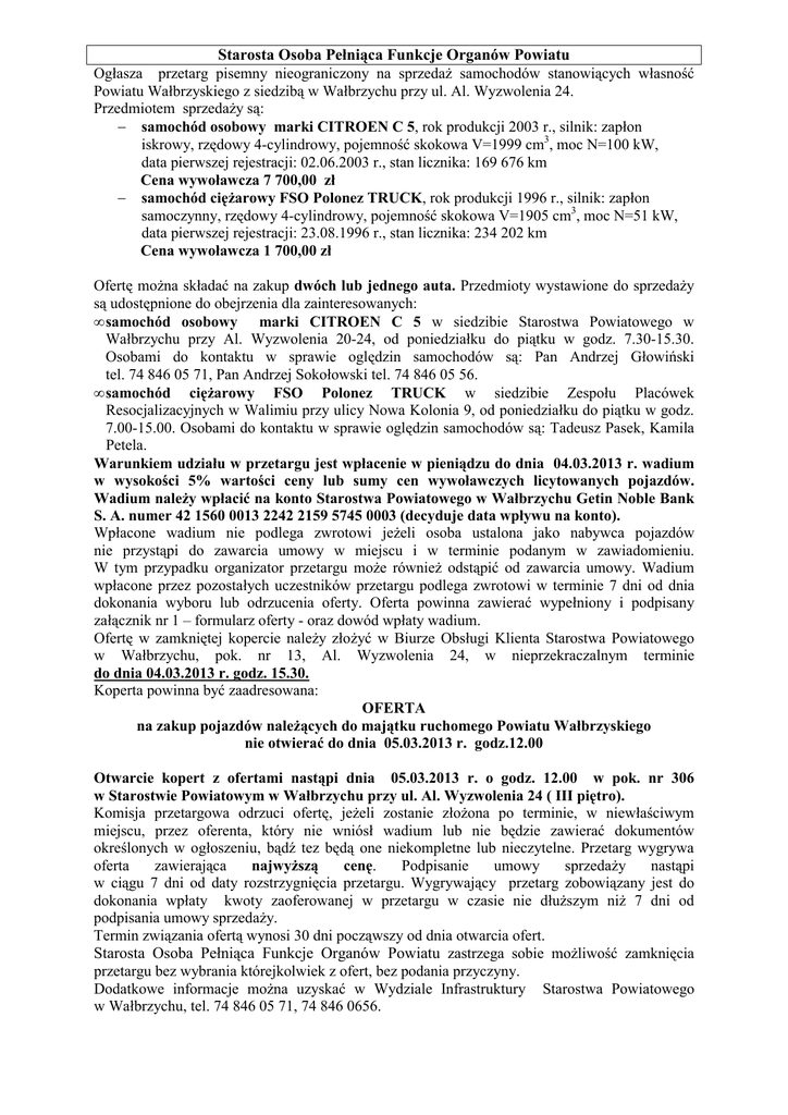 Starosta Osoba Pełniąca Funkcje Organów Powiatu Ogłasza przetarg pisemny nieograniczony na sprzedaż samochodów stanowiących własność Powiatu Wałbrzyskiego z siedzibą w Wałbrzychu przy ul. Al. Wyzwolenia 24. Przedmiotem sprzedaży są: − samochód osobowy marki CITROEN C 5, rok produkcji 2003 r., silnik: zapłon iskrowy, rzędowy 4-cylindrowy, pojemność skokowa V=1999 cm3, moc N=100 kW, data pierwszej rejestracji: 02.06.2003 r., stan licznika: 169 676 km Cena wywoławcza 7 700,00 zł − samochód ciężarowy FSO Polonez TRUCK, rok produkcji 1996 r., silnik: zapłon samoczynny, rzędowy 4-cylindrowy, pojemność skokowa V=1905 cm3, moc N=51 kW, data pierwszej rejestracji: 23.08.1996 r., stan licznika: 234 202 km Cena wywoławcza 1 700,00 zł Ofertę można składać na zakup dwóch lub jednego auta. Przedmioty wystawione do sprzedaży są udostępnione do obejrzenia dla zainteresowanych: • samochód osobowy marki CITROEN C 5 w siedzibie Starostwa Powiatowego w Wałbrzychu przy Al. Wyzwolenia 20-24, od poniedziałku do piątku w godz. 7.30-15.30. Osobami do kontaktu w sprawie oględzin samochodów są: Pan Andrzej Głowiński tel. 74 846 05 71, Pan Andrzej Sokołowski tel. 74 846 05 56. • samochód ciężarowy FSO Polonez TRUCK w siedzibie Zespołu Placówek Resocjalizacyjnych w Walimiu przy ulicy Nowa Kolonia 9, od poniedziałku do piątku w godz. 7.00-15.00. Osobami do kontaktu w sprawie oględzin samochodów są: Tadeusz Pasek, Kamila Petela. Warunkiem udziału w przetargu jest wpłacenie w pieniądzu do dnia 04.03.2013 r. wadium w wysokości 5% wartości ceny lub sumy cen wywoławczych licytowanych pojazdów. Wadium należy wpłacić na konto Starostwa Powiatowego w Wałbrzychu Getin Noble Bank S. A. numer 42 1560 0013 2242 2159 5745 0003 (decyduje data wpływu na konto). Wpłacone wadium nie podlega zwrotowi jeżeli osoba ustalona jako nabywca pojazdów nie przystąpi do zawarcia umowy w miejscu i w terminie podanym w zawiadomieniu. W tym przypadku organizator przetargu może również odstąpić od zawarcia umowy. Wadium wpłacone przez pozostałych uczestników przetargu podlega zwrotowi w terminie 7 dni od dnia dokonania wyboru lub odrzucenia oferty. Oferta powinna zawierać wypełniony i podpisany załącznik nr 1 – formularz oferty - oraz dowód wpłaty wadium. Ofertę w zamkniętej kopercie należy złożyć w Biurze Obsługi Klienta Starostwa Powiatowego w Wałbrzychu, pok. nr 13, Al. Wyzwolenia 24, w nieprzekraczalnym terminie do dnia 04.03.2013 r. godz. 15.30. Koperta powinna być zaadresowana: OFERTA na zakup pojazdów należących do majątku ruchomego Powiatu Wałbrzyskiego nie otwierać do dnia 05.03.2013 r. godz.12.00 Otwarcie kopert z ofertami nastąpi dnia 05.03.2013 r. o godz. 12.00 w pok. nr 306 w Starostwie Powiatowym w Wałbrzychu przy ul. Al. Wyzwolenia 24 ( III piętro). Komisja przetargowa odrzuci ofertę, jeżeli zostanie złożona po terminie, w niewłaściwym miejscu, przez oferenta, który nie wniósł wadium lub nie będzie zawierać dokumentów określonych w ogłoszeniu, bądź tez będą one niekompletne lub nieczytelne. Przetarg wygrywa oferta zawierająca najwyższą cenę. Podpisanie umowy sprzedaży nastąpi w ciągu 7 dni od daty rozstrzygnięcia przetargu. Wygrywający przetarg zobowiązany jest do dokonania wpłaty kwoty zaoferowanej w przetargu w czasie nie dłuższym niż 7 dni od podpisania umowy sprzedaży. Termin związania ofertą wynosi 30 dni począwszy od dnia otwarcia ofert. Starosta Osoba Pełniąca Funkcje Organów Powiatu zastrzega sobie możliwość zamknięcia przetargu bez wybrania którejkolwiek z ofert, bez podania przyczyny. Dodatkowe informacje można uzyskać w Wydziale Infrastruktury Starostwa Powiatowego w Wałbrzychu, tel. 74 846 05 71, 74 846 0656.