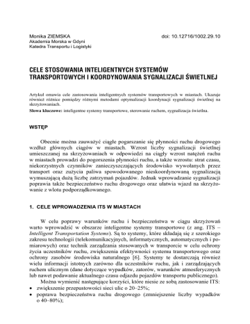 Monika ZIEMSKA doi: 10.12716/1002.29.10 Akademia Morska w Gdyni Katedra Transportu i Logistyki CELE STOSOWANIA INTELIGENTNYCH SYSTEMÓW TRANSPORTOWYCH I KOORDYNOWANIA SYGNALIZACJI ŚWIETLNEJ Artykuł omawia cele zastosowania inteligentnych systemów transportowych w miastach. Ukazuje również różnice pomiędzy różnymi metodami optymalizacji koordynacji sygnalizacji świetlnej na skrzyżowaniach. Słowa kluczowe: inteligentne systemy transportowe, sterowanie ruchem, sygnalizacja świetlna. WSTĘP Obecnie można zauważyć ciągłe pogarszanie się płynności ruchu drogowego wzdłuż głównych ciągów w miastach. Wzrost liczby sygnalizacji świetlnej umieszczanej na skrzyżowaniach w odpowiedzi na ciągły wzrost natężeń ruchu w miastach prowadzi do pogorszenia płynności ruchu, a także wzrostu: strat czasu, niekorzystnych czynników zanieczyszczających środowisko wywołanych przez transport oraz zużycia paliwa spowodowanego nieskoordynowaną sygnalizacją wymuszającą dużą liczbę zatrzymań pojazdów. Jednak wprowadzanie sygnalizacji poprawia także bezpieczeństwo ruchu drogowego oraz ułatwia wjazd na skrzyżowanie z wlotu podporządkowanego. 1. CELE WPROWADZENIA ITS W MIASTACH W celu poprawy warunków ruchu i bezpieczeństwa w ciągu skrzyżowań warto wprowadzić w obszarze inteligentne systemy transportowe (z ang. ITS – Intelligent Transportation Systems). Są to systemy, które składają się z szerokiego zakresu technologii (telekomunikacyjnych, informatycznych, automatycznych i pomiarowych) oraz technik zarządzania stosowanych w transporcie w celu ochrony życia uczestników ruchu, zwiększenia efektywności systemu transportowego oraz ochrony zasobów środowiska naturalnego [6]. Systemy te dostarczają również wielu informacji istotnych zarówno dla uczestników ruchu, jak i zarządzających ruchem ulicznym (dane dotyczące wypadków, zatorów, warunków atmosferycznych lub nawet podawanie aktualnego czasu odjazdu pojazdów transportu publicznego). Można wymienić następujące korzyści, które niesie ze sobą zastosowanie ITS: • zwiększenie przepustowości sieci ulic o 20–25%; • poprawa bezpieczeństwa ruchu drogowego (zmniejszenie liczby wypadków o 40–80%); 108 PRACE WYDZIAŁU NAWIGACYJNEGO AKADEMII MORSKIEJ W GDYNI, nr 29, 2014 • zmniejszenie czasów podróży i zużycia energii (o 45–70%); • poprawa komfortu podróżowania i warunków ruchu kierowców, podróżujących transportem zbiorowym oraz pieszych; • redukcja kosztów zarządzania taborem drogowym; • poprawa jakości środowiska naturalnego (redukcja emisji spalin o 30–50%); • zwiększenie korzyści ekonomicznych w regionie [4]. W przypadku gdy dwa lub więcej skrzyżowań położonych jest w niedalekiej odległości (według literatury od 700 do 1000 m [3]), a nie są wprowadzane inteligentne systemy transportowe, warto koordynować pracę ciągu skrzyżowań. Najważniejsze cele koordynacji to między innymi zapewnienie płynności ruchu poprzez: minimalizację strat czasu, minimalizację liczby zatrzymań, maksymalizację sygnału zielonego, minimalizację czasu podróży, minimalizację zużycia paliwa, minimalizację długości kolejek i inne. 1.1. Generacje ITS Na przestrzeni lat powstawało coraz to więcej metod sterowania ruchem. Dzięki każdej z nich inżynierowie ruchu nie musieli poświęcać wiele czasu na zbieranie i analizowanie danych. Poniższa tabela 1 przedstawia porównanie generacji metod sterowania ruchem. Tabela 1 Generacje metod sterowania ruchem [3] Charakterystyka Generacje systemów i metod sterowania I II III IV Okres uaktualniania parametrów 15 min 5÷10 min 3÷6 min z cyklu na cykl Generacja planów sygnalizacji optymalizacja off-line optymalizacja on-line optymalizacja on-line optymalizacja on-line Liczba planów sygnalizacji do 40 bez ograniczeń programowanie bez ograniczeń nie występują Dane o ruchu historyczne wg danych historycznych prognozowanie bieżące Obliczany parametr sterowania (na skrzyżowaniach) split split i offset split, offset, cykl moment zmiany faz Sposób realizacji sterowania selekcja planów generacja planów generacja planów akomodacja Czas trwania cyklu stały w podobszarze stały dla grupy skrzyżowań zmienny zmienny w czasie i na obszarze Przykładowe metody optymalizacji i sterowania SIGOP, TRANSYT zmodyfikowany, SIGOR, RTOP SIGOP-U, CYRANO, SCATS SCOOT, TRACS Źródło: S. Gaca, W. Suchorzewski, M. Tracz, Inżynieria ruchu drogowego. Teoria i praktyka, WŁK, Warszawa 2011. M. Ziemska, Cele stosowania inteligentnych systemów transportowych i koordynowania sygnalizacji świetlnej 109 2. RODZAJE SYSTEMÓW STEROWANIA RUCHEM 2.1. UTOPIA SPOT Koncepcja systemu powstała w wyniku wspólnych badań krajów Unii Europejskiej. Polega ona na połączeniu optymalizacji sterownika adaptacyjnego (SPOT – Signal Progression Optimisation Technology) z programem nadzorująco-diagnostycznym (UTOPIA – Urban Traffic Optimisation by Integrated Automation). UTOPIA SPOT posiada następujące elementy [3]: • lokalny sterownik – odpowiedzialny za sterowanie sygnalizacją na odpowiednim skrzyżowaniu zgodnie z poleceniami otrzymanymi z nadrzędnego sterownika; • nadrzędny sterownik (SPOT) – optymalizuje sterowanie na skrzyżowaniach izolowanych oraz małych sieciach za pomocą matematycznych algorytmów; • moduł centralny (UTOPIA) – nadzorujący i monitorujący pracę całej sieci transportowej; • detektory (wejściowe, wyjściowe, dodatkowe). Zestaw sygnałów Rys. 1. Schemat działania systemu UTOPIA SPOT Źródło: www.wegenwiki.nl. Pierwszy raz system został zainstalowany w 1984 r. w Turynie i objął 30 skrzyżowań z sygnalizacją (w 2004 r. obejmował już 400 skrzyżowań). W Polsce system UTOPIA SPOT został wprowadzony w Malborku oraz na obwodnicy Gdańska. System UTOPIA SPOT pozwala na monitorowanie ruchu środków transportu publicznego oraz optymalizowanie ich, powodując jak najmniejszą lic