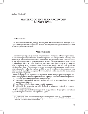 Andrzej Chodyński* MACIERZ OCENY SZANS ROZWOJU MIAST I GMIN STRESZCZENIE W artykule wskazano na funkcję miast i gmin. Określono mierniki rozwoju miast. Zaproponowano macierz oceny szans rozwoju miast i gmin z uwzględnieniem czynników wewnętrznych i zewnętrznych. WPROWADZENIE Teorie rozwoju organizacji znalazły swoje najszersze praktyczne odbicie w problematyce zarządzania przedsiębiorstwami. Ważnym impulsem dla rozwijania tych koncepcji była globalizacja. Powodowała ona bowiem konieczność podjęcia rozważań o szansach strategicznych przedsiębiorstw na rynku światowym. Równocześnie próbowano określić czynniki, powodujące sukces na rynku globalnym. Tworzono różne kombinacje tych czynników, które zmieniły się wraz z upływem czasu. Dokonywano również różnych prób określenia pojęcia „sukces firmy”. Akcentowano przy tym w szczególności na osiągane wyniki ekonomiczne i udział w rynku. Ze względu na fakt, że rozwój przedsiębiorstw następował przy różnym udziale czynników zewnętrznych i wewnętrznych próbowano określić ich znaczenie dla rozwoju przedsiębiorstw. Próbę oceny zgodności czynników zewnętrznych i wewnętrznych, przydatnych przy tworzeniu strategii przedsiębiorstw zaprezentowano w pracy1. Analiza obejmowała zgodność: A) cyklu życia sektora z cyklem życia organizacji; B) kluczowych czynników sukcesu branży (sektora) z wyznacznikami orientacji marketingowej firmy; C) portfela produktów firmy na tle portfela idealnego; D) zdolności do tworzenia wartości dodanej w łańcuchu wartości w porównaniu z konkurentami. Celem niniejszego artykułu jest odpowiedź na pytanie, na ile powyższe rozważania są przydatne przy tworzeniu strategii miast i gmin. 1 Prof. nadzw. dr hab., Wyższa Szkoła Humanitas w Sosnowcu, Krakowska Szkoła Wyższa im. A. F. Modrzewskiego. A. Chodyński, Macierz oceny szans strategicznych firm, [w:] „Zeszyty naukowe WSZiM, Seria: Zarządzanie i Marketing” 7-1/2005, pod red. A.Chodyńskiego, s. 23. 45 Andrzej Chodyński – Macierz oceny szans rozwoju miast i gmin ROZWÓJ MIASTA Dziedziny (rodzaje) działalności gmin obejmują zarówno produkcję, jak i usługi. Funkcje pełnione przez miasta obejmują każdą działalność społeczno-gospodarczą wykonywaną w mieście, np.: realizację potrzeb żywnościowych, związanych z miejscami pracy, potrzeb oświatowych, mieszkaniowych, komunikacyjnych, kulturalnych, w zakresie opieki zdrowotnej, rekreacyjnych i sportowych czy pomocy społecznej2. Dynamika rozwoju miast nawiązuje do cyklu życia organizacji; mamy miasta w fazie rozwoju, stagnacji i schyłku. Idzie za tym zmiana relacji między funkcjami, w tym – w odniesieniu do funkcji dominującej. Działania te mogą odnosić się do wzrostu konkurencyjności gospodarki lokalnej. Strategiczne cele rozwoju lokalnego obejmują: – zapewnienie maksymalnej aktywności gospodarczej podmiotów gospodarki lokalnej; – zapewnienie możliwie najwyższego poziomu warunków bytowych oraz możliwości konsumpcyjnych społeczności lokalnej; – wykorzystanie zasobów lokalnego ekosystemu (w tym również dóbr wolnych) zgodnie z zasadami ekorozwoju3. Rozwój miast może być oceniany w oparciu o określone mierniki. Mierniki rozwoju miast obejmują4: – zmianę liczby mieszkańców; – zmianę cech mieszkańców (zamożność, wykształcenie, wiek); – zmianę warunków życia mieszkańców – jakość życia; ilość i cechy mieszkań, infrastruktura techniczna, opieka medyczna, edukacja, rozrywka, kultura, pomoc społeczna, bezpieczeństwo, obiekty sportowe, usługi bytowe; – zmianę ilości obiektów i majątku trwałego wyróżniających miasto; – zmianę wartości majątku trwałego zlokalizowanego w mieście; – zmianę ilości obiektów użyteczności publicznej; – wzrost ilości jednostek gospodarczych, głównie usługowych; – wartość produktu globalnego, wytworzonego w mieście; – dochody (władz) miasta; – liczbę zatrudnionych, wydajność na jednego zatrudnionego; – dochody na jedno gospodarstwo domowe; – rangę miasta; – produktywność terenu miasta, odnoszona do 1m2 powierzchni. Analizując czynniki zewnętrzne i wewnętrzne należy podkreślić, że cele rozwoju miast i gmin są odmienne niż dla przedsiębiorstw. Mają one charakter społeczny, związany z poprawą jakości życia mieszkańców. Jednak osiągnięcie tego celu jest możliwe przy zabezpieczeniu dopływu niezbędnych środków finansowych. Miasto i gmina mogą zyskiwać lub tracić na atrakcyjności i przechodzić przez specyficzny cykl swojego życia. Można go rozpatrywać na tle cyklu życia całego regionu. Kluczowe czynniki sukcesu wiążą się w znacznej mierze z położeniem geograficznym. Nastawienie marketingowe może z powodzeniem służyć wyeksponowaniu walorów geograficznych, ale również 2 3 4 46 M. Czornik, Miasto: ekonomiczne aspekty funkcjonowania, Katowice 2004, s. 36. R. Brol i inni, Ekonomika zarządzania miastem, Wrocław 2001. P. Bury, T. Markowski, J. Regulski, Podstawy ekonomiki miasta, Fundacja Rozwoju Przedsiębiorczości, Łódź 1993. Zeszyty Naukowe Wyższej Szkoły Humanitas korzyści wynikających z roli tego miejsca w realizacji działalności gospodarczej. Ważna jest możliwość określenia kluczowych czynników sukcesu na tle rozwoju regionu. Produkt miasta i gminy (głównie o charakterze usługowym w odniesieniu do mieszkańców, ale także np.: turystów czy inwestorów) będzie związany z lokalizacją i szansą tworzenia infrastruktury. Miasta i gminy w oparciu o przyjętą strategię opartą o oczekiwania mieszkańców mogą tworzyć portfel usług najbardziej zbliżony do oczekiwań. Zdolność do tworzenia wartości dodanej będzie opierać się na tworzeniu i wykorzystaniu posiadanych kompetencji. Mając na uwadze współczesne koncepcje zarządzania szczególna rola w tym procesie przypada uczeniu się i zarządzaniu wiedzą. Prowadzi to bowiem d