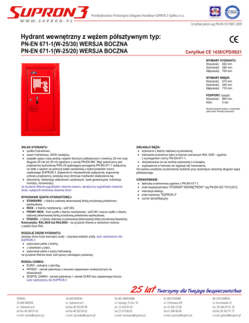 SYSTEM WWW.SUPRON.PL ZARZĄDZANIA Przedsiębiorstwo Produkcyjno Usługowo Handlowe SUPRON 3 Spółka z o.o. Certyfikowany na zgodność z: PN-EN ISO 9001:2009 Certyfikat jakości wg PN-EN ISO 9001:2009 Hydrant wewnętrzny z wężem półsztywnym typ: PN-EN 671-1(W-25/30) WERSJA BOCZNA PN-EN 671-1(W-25/20) WERSJA BOCZNA Certyfikat CE 1438/CPD/0021 WYMIARY HYDRANTU: Wysokość: 650 mm Szerokość: 280 mm Głębokość: 700 mm WYMIARY WNĘKI: Wysokość: 670 mm Szerokość: 300 mm Głębokość: 710 mm PODPORY: (opcja) Wysokość: 800 mm Ilość: 2 szt. Sposób łączenia podpór z hydrantem patrz karta “Montaż hydrantów” SKŁAD HYDRANTU: · szafka hydrantowa, · zawór hydrantowy: ZH25 mosiężny, · zwijadło węża z osią wodną i wężem tłocznym półsztywnym o średnicy 25 mm oraz długości 20 mb lub 30 mb zgodnym z normą PN-EN 694. Wąż zakończony jest prądownicą hydrantową PWh-25 spełniającą wymagania PN-EN 671-1 połączoną na stałe z wężem za pomocą tulejki zaciskowej z wykorzystaniem wzoru użytkowego SUPRON 3. Zapewnia to niezawodność połączenia, ergonomię uchwytu prądownicy, estetykę oraz eliminuje możliwość skaleczenia się, · dokumenty: deklaracja właściwości użytkowych, karta gwarancyjna, instrukcje: montażu, konserwacji, na życzenie Klienta sygnalizator otwarcia zaworu, akustyczny sygnalizator otwarcia drzwi, wyłącznik krańcowy otwarcia drzwi WYKONANIE SZAFKI HYDRANTOWEJ: · STANDARD - z blachy stalowej lakierowanej farbą proszkową poliestrowoepoksydową · INOX - z blachy nierdzewnej - szlif 240, · FRONT INOX - front szafki z blachy nierdzewnej - szlif 240, korpus szafki z blachy stalowej lakierowanej farbą proszkową poliestrowo-epoksydową · FASADA - z blachy stalowej ocynkowanej lakierowanej farbą proszkową fasadową Kolorystyka: RAL3000 lub RAL9003 - na życzenie Klienta w dowolnym kolorze z palety barw RAL ZWIJADŁO WĘŻA: · wykonane z blachy stalowej ocynkowanej, · malowane proszkowo tylko w kolorze czerwonym RAL 3000 - zgodnie z wymaganiem normy PN-EN 671-1, · ułożyskowane na osi wodnej wykonanej z mosiądzu, · wyposażone w hamulec do regulacji siły hamowania, Oś wodna umożliwia uruchomienie hydrantu przy rozwinięciu dowolnej długości węża półsztywnego. OZNAKOWANIE: · tabliczka znamionowa zgodnie z PN-EN 671-1, · znak bezpieczeństwa "HYDRANT WEWNĘTRZNY" wg PN-EN ISO 7010:2012, · instrukcja obsługi, · znak towarowy "SUPRON 3" · numer identyfikacyjny RODZAJE DRZWI HYDRANTU: zawiasy drzwi kryte wewnątrz szafy – poprawa estetyki szafy, wzór zastrzeżony dla SUPRON 3 · wykonanie pełne z blachy, · z okienkiem z plexi, · wykonanie pełne z szyby hartowanej na życzenie Klienta otwór pod ręczny ostrzegacz pożarowy RODZAJ ZAMKA: · EURO - pokrętny z plombą, · PATENT - zamek patentowy z kluczem zapasowym umieszczonym na drzwiczkach, · ZESPÓŁ ZAMKA - zamek patentowy + zamek EURO bez zapasowego klucza wzór zastrzeżony dla SUPRON 3 25 lat Tworzymy dla Twojego bezpieczeństwa SERWIS: 26-600 RADOM ul. Sadownicza 6 tel/fax 48 340 01 65 e-mail: [email protected] 26-600 RADOM ul. Sadownicza 6 tel/fax 48 363 89 98 tel/fax 48 363 99 65 e-mail: [email protected] 03-481 WARSZAWA ul. Szanajcy 16 lok. 56 tel. 22 618 93 63 fax 22 619 80 05 e-mail: [email protected] 61-003 POZNAŃ ul. Chlebowa 4/8 tel. 61 842 23 00 fax 61 840 06 88 e-mail: [email protected] 80-530 GDAŃSK ul. Uczniowska 52 tel. 58 340 03 55, 56 tel/fax 58 342 91 75 e-mail: [email protected] WŁAŚCIWOŚCI HYDRAULICZNE Ciśnienie robocze: od 0,2 MPa do 1,2 MPa Prąd wody rozproszony stożkowy - nie mniejszy niż 45 stopni. UWAGA: Zależność natężenia przepływu Q od ciśnienia P przedstawia równanie: Q=K 10P, gdzie Q wyraża się w litrach/minutę,a P w megapaskalach. PRZYKŁADY WYKONANIA SZAFEK STANDARD INOX FRONT INOX FASADA szafka przykładowa - kolor RAL 3000 szafka przykładowa - szlif 240 szafka przykładowa - szlif 240 szafka przykładowa - kolor RAL 9006 RODZAJ ZAMKA EURO PATENT ZESPÓŁ ZAMKA