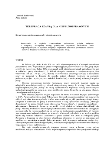 Dominik Sankowski, Anna Bąkała TELEPRACA SZANSĄ DLA NIEPEŁNOSPRAWNYCH Słowa kluczowe: telepraca, osoby niepełnosprawne Streszczenie: w artykule przedstawiono podstawowe pojęcia związane z telepracą. Szczególną uwagę poświęcono aspektowi zatrudnienia osób niepełnosprawnych w systemie telepracy. Wykazano znaczenie prowadzenia szkoleń i kursów z dziedziny informatyki w świetle uzyskania pracy. WSTĘP W Polsce żyje około 4 mln 300 tys. osób niepełnosprawnych. Czynnych zawodowo jest zaledwie 20%. Najliczniejsza grupa osób pracujących jest w wieku 45-54 lata, przy czym aż 62% to mężczyźni. Tylko 20% pracujących osób niepełnosprawnych zatrudnionych jest w zakładach pracy chronionej [15]. Wśród biernych zawodowo – zarejestrowanych jako bezrobotni jest ok. 150 tys. (3%). Barierą w zdobywaniu ciekawego zawodu i znalezieniu pracy są trudności w dostępie do szeroko pojętej edukacji (zarówno na poziomie podstawowym jak i wyższym, oraz szkoleń, kursów itp.), a także pełnej informacji o rynku pracy. Obecnie nowoczesne techniki (komputery nowej generacji, internet, nauka na odległość) pozwalają na większy, niemal nieograniczony dostęp do wiedzy, która dla osób niepełnosprawnych jest „furtką” do reszty społeczeństwa. Ogromny rozwój nowoczesnych technologii przyniósł ze sobą m.in. nowe możliwości pracy. Pojawiła się idea pracy zdalnej, zwanej popularnie telepracą. Idea telepracy pojawiła się już trzydzieści lat temu, w czasach kryzysu paliwowego w USA. Amerykański fizyk, Jack Nilles, który kierował pracami projektowymi pierwszych rakiet i pojazdów kosmicznych dla NASA, zastanawiał się w jaki sposób ograniczyć koszty związane z dotarciem do pracy i przebywaniem w niej, opracował koncepcję „zdalnego dojeżdżania” do pracy. Nadał swojej idei nazwę "praca zdalna", w oryginale angielskim telecommute. Dosłownie tłumacząc na polski chodzi właśnie o "zdalne dojeżdżanie" do pracy. Niestety, trudność w dosłownym przetłumaczeniu terminu telecommute na inne języki spowodowała, że rozpowszechnił się on jedynie na kontynencie amerykańskim. W Europie jego narodowymi odpowiednikami są telework, télétravail, telearbeit, a w języku polskim używa się terminu "telepraca" zamiennie z "praca zdalna" lub "praca na odległość".[19i] Związane z telepracą są także terminy określające otoczenie, w którym jej realizacja jest możliwa oraz sam telepracownik. Telecentrum to z kolei korzystnie ulokowane miejsce (np. z łatwym dojazdem komunikacją miejską), w którym znajdują się liczne stanowiska telepracy wyposażone w sieci elektroniczne. Dla osób niepełnosprawnych telepraca stanowi nową, a bardzo często jedyną możliwość podjęcia zatrudnienia. Wielu niepełnosprawnych posiada dobrą znajomość obsługi komputera, co jednak nie jest wystarczającym atutem w konkurencji z osobami, które bez problemu mogą fizycznie dotrzeć do miejsca pracy. A praca to „coś co robisz, a nie gdzieś, dokąd idziesz” [21i]. Aby zwiększyć szanse osób niepełnosprawnych na rynku pracy należy umożliwić im przede wszystkim szerszy dostęp do edukacji poprzez kursy i szkolenia. Ważne jest również dostosowanie stanowiska pracy do potrzeb osób niepełnosprawnych. Do nich kierowane są programy celowe związane z telepracą, mające na celu zapoznanie z jej ideą oraz umożliwienie zdobycia odpowiednich do niej kwalifikacji. Pracodawcy natomiast powinni mieć pełną informację jakie ulgi podatkowe przysługują im z tytułu zatrudniania osób niepełnosprawnych. TELEPRACOWNIK Z uwagi na miejsce wykonywania telepracy i częstotliwość oraz sposób kontaktowania się telepracownika z telepracodawcą, wyróżnia się [5]: 1. telepracę wykonywaną całkowicie w domu telepracownika (tele - homeworking), 2. telepracę wykonywana po części w domu telepracownika, a po części w biurze telepracodawcy (home – based teleworking, multilocations teleworking), 3. telepracę wykonywaną w różnych, zmiennych miejscach, zazwyczaj zarówno poza domem telepracownika, jak i poza biurem telepracodawcy (nomadic teleworking), 4. telepracę wykonywaną sporadycznie w domu (ad hoc teleworking), polegającą na tym, że telepracownik wykonuje pracę zazwyczaj w biurze telepracodawcy, a niekiedy tylko w swoim domu. TELECENTRUM Telecentrum może być własnością jednej firmy, a może należeć do kilku instytucji, z których każda posiada kilka stanowisk roboczych (biurek). Coraz popularniejsza jest idea tzw. gorących biurek, wyposażonych w niezbędne łącza, z których w dowolnej chwili może skorzystać inny telepracownik. Specjalnym rodzajem telecentrum są telechatki (tłumaczenie słowa „telecottage”, zawarte w Raporcie Komisji Europejskiej [11]), zwane tak z powodu powiązania z obszarami wiejskimi. Inne nazwy telechatek to teledomki, infocentrum, a znaczą dokładnie to samo - pracownię multimedialną pełniącą szereg funkcji, usytuowaną w miejscu, w którym skupia się społeczność lokalna. Krótko mówiąc ma to być - internetowy Dom Kultury na wsi. W Europie pierwsze ogólnodostępne biuro powstało we Francji w 1980 roku, następne w Szwecji w 1982 roku i w Szwajcarii w 1985 roku. Od tamtej pory idea publicznych biur rozpowszechnia się na całym świecie. W 1999 roku najwięcej telechatek działało w Kanadzie - ok. 5000, w USA i na Węgrzech - ok. 260, w Wielkiej Brytanii - ok. 200. Telechatki powstawały również w państwach, w których dostęp do najnowszych technologii nie jest zadowalający, a mianowicie w Rumunii, Estonii i Ghanie. Również w Polsce idea telechatek zyskuje na popularności. Powstaje wiele inicjatyw ukierunkowanych na rozwiązywanie problemów społeczności lokalnych. Na Mazowszu Wojewódzki Urząd Pracy przyjął program budowy Gminnych Centrów Informacji, które zrealizowano już w Strzegowie, Iłży i Szydłowcu. Jednak Infocentra-telechatki inicjowane przez Wojewód