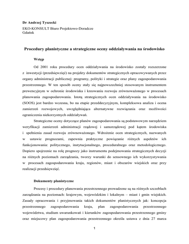 Dr Andrzej Tyszecki EKO-KONSULT Biuro Projektowo-Doradcze Gdańsk Procedury planistyczne a strategiczne oceny oddziaływania na środowisko Wstęp Od 2001 roku procedury ocen oddziaływania na środowisko zostały rozszerzone z inwestycji (przedsięwzięć) na projekty dokumentów strategicznych opracowywanych przez organy administracji publicznej: programy, polityki i strategie oraz plany zagospodarowania przestrzennego. W ten sposób oceny stały się najpowszechniej stosowanym instrumentem prewencyjnym w ochronie środowiska i kreowaniu rozwoju zrównoważonego w procesach planowania zagospodarowania. Istotą strategicznych ocen oddziaływania na środowisko (SOOS) jest bardzo wczesna, bo na etapie przeddecyzyjnym, kompleksowa analiza i ocena zamierzeń rozwojowych, uwzględniająca alternatywne rozwiązania oraz możliwości ograniczenia niekorzystnych oddziaływań. Strategiczne oceny dotyczące planów zagospodarowania są podstawowym narzędziem weryfikacji zamierzeń administracji rządowej i samorządowej pod kątem środowiska i spełnienia zasad rozwoju zrównoważonego. Wdrożenie ocen strategicznych, nazwanych w ustawie prognozami, zapewnia praktyczne powiązanie różnych aspektów ich funkcjonowania: politycznego, instytucjonalnego, proceduralnego oraz metodologicznego. Dopiero spojrzenie na rolę prognozy jako instrumentu podejmowania strategicznych decyzji na różnych poziomach zarządzania, tworzy warunki do sensownego ich wykorzystywania w procesach zagospodarowania kraju, regionów, miast i obszarów wiejskich oraz przy realizacji przedsięwzięć. Dokumenty planistyczne Procesy i procedury planowania przestrzennego prowadzone są na różnych szczeblach zarządzania na poziomach: krajowym, wojewódzkim i lokalnym – miast i gmin wiejskich. Zasady opracowania i przyjmowania takich dokumentów planistycznych jak: koncepcja przestrzennego zagospodarowania kraju, plan zagospodarowania przestrzennego województwa, studium uwarunkowań i kierunków zagospodarowania przestrzennego gminy oraz miejscowy plan zagospodarowania przestrzennego określa ustawa z dnia 27 marca 1 2003 r. o planowaniu i zagospodarowaniu przestrzennym (tekst jednolity: Dz. U., 2012, poz. 647, z późn. zm.) – zwana dalej „ustawą pizp”. Tezy o tym, że przestrzeń należy do nieodnawialnych zasobów środowiska oraz o prewencyjnej roli planowania przestrzennego w ochronie środowiska zyskały powszechne uznanie w Europie w latach 70. i 80. ubiegłego stulecia. Towarzyszyło temu zintegrowanie na różnych szczeblach wybranych zagadnień gospodarki przestrzennej z procedurami ochrony środowiska. Skojarzenie procedur planistycznych oraz ocen środowiskowych nastąpiło w Polsce z opóźnieniem w stosunku do większości państw europejskich. Nie zdołano przy tym w pełni wykorzystać prewencyjnego charakteru skojarzonych mechanizmów planistycznych oraz strategicznych ocen oddziaływania na środowisko w kreowaniu zrównoważonego rozwoju struktur przestrzennych, w tym na obszarach miejskich. Strategiczna ocena oddziaływania na środowisko Instytucja strategicznej oceny oddziaływania na środowisko, czyli postępowanie w sprawie oceny oddziaływania na środowisko projektów nie tylko dokumentów planistycznych, ale również projektów niektórych programów, polityk i strategii, funkcjonuje w niezmienionym kształcie od kilkunastu lat. Procedurę strategicznej oceny oddziaływania na środowisko reguluje ustawa z dnia 3 października 2008 r. o udostępnianiu informacji o środowisku i jego ochronie, udziale społeczeństwa w ochronie środowiska oraz o ocenach oddziaływania na środowisko (tekst jednolity: Dz. U., 2013, 1235, ze zm.) – zwana dalej „ustawą ooś”. Celem strategicznej oceny oddziaływania na środowisko jest zapewnienie integracji wymagań ochrony środowiska w opracowywanych dokumentach planistycznych. Istotą oceny strategicznej jest na wczesnym etapie planowania zagospodarowania, zidentyfikowanie oraz określenie charakteru i skali skutków środowiskowych realizacji planowanego zagospodarowania. Założeniem strategicznej oceny oddziaływania na środowisko jest możliwość porównania, oceny i wyboru wariantu – najbardziej korzystnego lub najmniej niekorzystnego dla środowiska. Identyfikacja potencjalnych zagrożeń, na wczesnym etapie planowania zagospodarowania umożliwia również podjęcie skoordynowanych działań zmierzających do ograniczenia negatywnych oddziaływań na środowisko w wyniku realizacji ustaleń planu. 2 Poziom regionalny Planowanie przestrzenne realizowane przez samorząd wojewódzki integruje politykę przestrzenną państwa oraz województwa samorządowego. Chociaż dokument ten nie ma cech prawa lokalnego, jak np. miejscowe plany zagospodarowania przestrzennego, to jego ważną rolą jest spełnianie roli dokumentu koordynującego pomiędzy różnymi poziomami zarządzania i administrowania. Plan zagospodarowania przestrzennego obligatoryjnie uwzględnia ustalenia dokumentów przyjętych przez Sejm RP, rząd, ministerstwa. W planie wojewódzkim przesądza się również o rozmieszczeniu wybranych inwestycji celu publicznego o znaczeniu ponadlokalnym, takich jak np. autostrady, magistralne rurociągi, linie elektroenergetyczne najwyższych napięć oraz obiekty militarne. Strategiczną ocenę oddziaływania na środowisko do regionach opracowań planistycznych, opracowywanych przez zarząd województwa i uchwalonych przez sejmik samorządowy przeprowadza się z wykorzystaniem przepisów ustawy ooś oraz przepisów innych ustaw. W odniesieniu do podstawowych dokumentów planistycznych przyjmowanych na poziomie wojewódzkim znajdują zastosowanie przepisy różnych ustaw, m.in.: ustawy z dnia 27 marca 2003 r. o planowaniu i zagospodarowaniu przestrzennym w odniesieniu do planu zagospodarowania przestrzennego województwa, ustawy z dnia 6 grudnia 2006 r. o zasadach prowadzenia polityki rozwoju w odniesieniu do strategii ponadregionalnej
