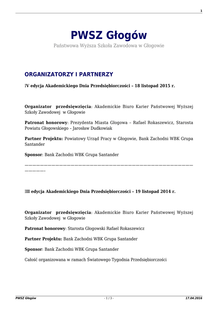 1 PWSZ Głogów Państwowa Wyższa Szkoła Zawodowa w Głogowie ORGANIZATORZY I PARTNERZY IV edycja Akademickiego Dnia Przedsiębiorczości – 18 listopad 2015 r. Organizator przedsięwzięcia: Akademickie Biuro Karier Państwowej Wyższej Szkoły Zawodowej w Głogowie Patronat honorowy: Prezydenta Miasta Głogowa – Rafael Rokaszewicz, Starosta Powiatu Głogowskiego – Jarosław Dudkowiak Partner Projektu: Powiatowy Urząd Pracy w Głogowie, Bank Zachodni WBK Grupa Santander Sponsor: Bank Zachodni WBK Grupa Santander ———————————————————————————————————————————— —————– III edycja Akademickiego Dnia Przedsiębiorczości – 19 listopad 2014 r. Organizator przedsięwzięcia: Akademickie Biuro Karier Państwowej Wyższej Szkoły Zawodowej w Głogowie Patronat honorowy: Starosta Głogowski Rafael Rokaszewicz Partner Projektu: Bank Zachodni WBK Grupa Santander Sponsor: Bank Zachodni WBK Grupa Santander Całość organizowana w ramach Światowego Tygodnia Przedsiębiorczości PWSZ Głogów -1/3- 17.04.2016 2 ———————————————————————————————————————————— ———————————————————————————————————————————— ———————————II edycja Akademickiego Dnia Przedsiębiorczości nt. “Twoja droga do sukcesu” – 20 września 2013r. ORGANIZATOR: Akademickie Biuro Karier i biuro projektu: “Wizualizacje w nauce i sztuce – nowa jakość kształcenia” PATRONAT HONOROWY: JM Rektor PWSZ w Głogowie dr Katarzyna Rusak, Prezydent Głogowa Jan Zubowski Starosta Powiatu Głogowskiego Rafael Rokaszewicz, Dyrektor zarządzający Sanden Manufacturing Poland Sp. z o.o. Dyrektor Regionalny Banku Zachodniego WBK w Głogowie Elżbieta Szefler – Lewandowska PARTNERZY: ———————————————————————————————————————————— ———————————————————————————————————————————— —————————Organizatorami przedsięwzięcia są: Akademickie Biuro Karier PWSZ w Głogowie wraz z projektem Wizualizacje w przemyśle PWSZ Głogów -2/3- 17.04.2016 3 i sztuce- nowa jakość kształcenia Partnerem Organizacyjnym jest: Centrum Edukacji i Pracy Młodzieży OHP w Legnicy Patronat honorowy: JM Rektor PWSZ w Głogowie prof. dr hab. Stanisław Czaja, Starosta Powiatu Głogowskiego Rafael Rokaszewicz, Dyrektor zarządzający ds. ekonomicznych Sitech Sp. z o. o – dr inż. Marcin Czyczerski Dyrektor II Oddziału Banku Zachodniego WBK w Głogowie Elżbieta Szefler – Lewandowska. Sponsor: Sitech Sp. z o. o. , Art & Glass Radosław Bernaciak, Tomaszów Mazowiecki, Bank Zachodni WBK II Oddział w Głogowie PWSZ Głogów -3/3- 17.04.2016