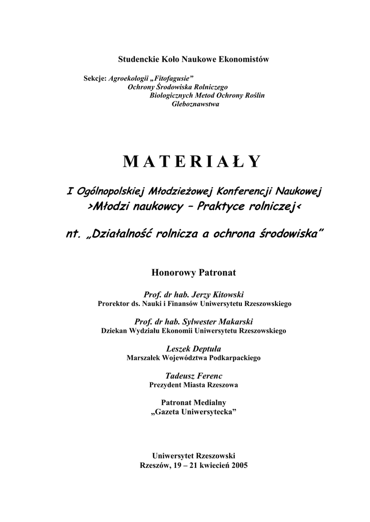 Studenckie Koło Naukowe Ekonomistów Sekcje: Agroekologii „Fitofagusie” Ochrony Środowiska Rolniczego Biologicznych Metod Ochrony Roślin Gleboznawstwa MATERIAŁY I Ogólnopolskiej Młodzieżowej Konferencji Naukowej >Młodzi naukowcy – Praktyce rolniczej< nt. „Działalność rolnicza a ochrona środowiska” Honorowy Patronat Prof. dr hab. Jerzy Kitowski Prorektor ds. Nauki i Finansów Uniwersytetu Rzeszowskiego Prof. dr hab. Sylwester Makarski Dziekan Wydziału Ekonomii Uniwersytetu Rzeszowskiego Leszek Deptuła Marszałek Województwa Podkarpackiego Tadeusz Ferenc Prezydent Miasta Rzeszowa Patronat Medialny „Gazeta Uniwersytecka” Uniwersytet Rzeszowski Rzeszów, 19 – 21 kwiecień 2005 Komitet Organizacyjny Konferencji Przewodniczący dr inż. Marta Pisarek Członkowie: lic. Beata Bazyl, dr inż. Janina Błażej, lic. Sandra Dudek, dr inż. Jan Gąsior, Paweł Germański, Magdalena Hipner, lic. Ewa Kaczor, Agata Lachor, lic. Ilona Legięć, lic. Jolanta Szarek, dr inż. Marian Woźniak Uniwersytet Rzeszowski, ul. M. Ćwiklińskiej 2, 35-601 Rzeszów Opracowanie redakcyjne materiałów konferencyjnych: dr inż. Marta Pisarek, lic. Beata Bazyl, lic. Sandra Dudek, Magdalena Hipner, lic. Ewa Kaczor, lic. Ilona Legięć Niniejszym opracowanie w całości ani we fragmentach nie może być powielane ani rozpowszechniane za pomocą urządzeń elektrycznych, kopiujących, nagrywających i innych bez pisemnej zgody posiadaczy praw autorskich. Komitet Organizacyjny Konferencji nie ponosi odpowiedzialności za treść zamieszczonych artykułów. Wydanie Materiałów Konferencyjnych zostało dofinansowane przez Uniwersytet Rzeszowski. Sponsorzy UNIWERSYTET RZESZOWSKI PREZYDENT MIASTA RZESZOWA BURMISTRZ MIASTA BŁAŻOWA BURMISTRZ MIASTA SANOK STAROSTA MIASTA SANOK MUZEUM BUDOWNICTWA LUDOWEGO W SANOKU SANOCKI ZAKŁAD GÓRNICTWA NAFTY I GAZU RSM „RESMLECZ” W TRZEBOWNISKU SPÓŁDZIELNIA ZAOPATRZENIA OGRODNICZEGO W RZESZOWIE ZPOW LEŻAJSK SP. Z O.O. HORTINO Druk: „Duet” Drukarnia 36-048 Przybyszówka 102