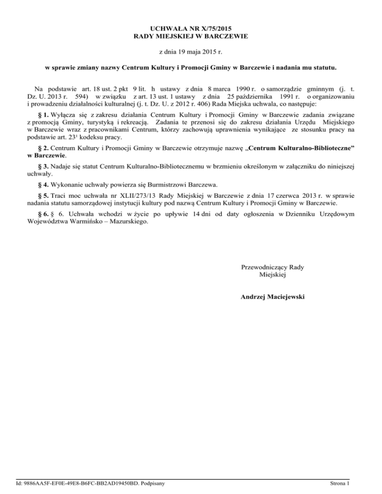 UCHWAŁA NR X/75/2015 RADY MIEJSKIEJ W BARCZEWIE z dnia 19 maja 2015 r. w sprawie zmiany nazwy Centrum Kultury i Promocji Gminy w Barczewie i nadania mu statutu. Na podstawie art. 18 ust. 2 pkt 9 lit. h ustawy z dnia 8 marca 1990 r. o samorządzie gminnym (j. t. Dz. U. 2013 r. 594) w związku z art. 13 ust. 1 ustawy z dnia 25 października 1991 r. o organizowaniu i prowadzeniu działalności kulturalnej (j. t. Dz. U. z 2012 r. 406) Rada Miejska uchwala, co następuje: § 1. Wyłącza się z zakresu działania Centrum Kultury i Promocji Gminy w Barczewie zadania związane z promocją Gminy, turystyką i rekreacją. Zadania te przenosi się do zakresu działania Urzędu Miejskiego w Barczewie wraz z pracownikami Centrum, którzy zachowują uprawnienia wynikające ze stosunku pracy na podstawie art. 23¹ kodeksu pracy. § 2. Centrum Kultury i Promocji Gminy w Barczewie otrzymuje nazwę „Centrum Kulturalno-Biblioteczne” w Barczewie. § 3. Nadaje się statut Centrum Kulturalno-Bibliotecznemu w brzmieniu określonym w załączniku do niniejszej uchwały. § 4. Wykonanie uchwały powierza się Burmistrzowi Barczewa. § 5. Traci moc uchwała nr XLII/273/13 Rady Miejskiej w Barczewie z dnia 17 czerwca 2013 r. w sprawie nadania statutu samorządowej instytucji kultury pod nazwą Centrum Kultury i Promocji Gminy w Barczewie. § 6. § 6. Uchwała wchodzi w życie po upływie 14 dni od daty ogłoszenia w Dzienniku Urzędowym Województwa Warmińsko – Mazurskiego. Przewodniczący Rady Miejskiej Andrzej Maciejewski Id: 9886AA5F-EF0E-49E8-B6FC-BB2AD19450BD. Podpisany Strona 1 Załącznik do Uchwały Nr X/75/2015 Rady Miejskiej w Barczewie z dnia 19 maja 2015 r. Statut Centrum Kulturalno - Bibliotecznego w Barczewie Rozdział 1. POSTANOWIENIA OGÓLNE § 1. Centrum Kulturalno – Biblioteczne w Barczewie, zwane dalej „Centrum”, jest samorządową instytucją kultury, której podstawowym celem statutowym jest prowadzenie działalności kulturalnej. § 2. Centrum działa w szczególności na podstawie: 1. Ustawy z dnia 25 października 1991 r. o organizowaniu i prowadzeniu działalności kulturalnej (t. jedn. z 2012 r. Dz. U. Nr 406), 2. Ustawy z dnia 27 czerwca 1997 r. o bibliotekach (t. jedn. z 2012 r. Dz. U. Nr 642) 3. Niniejszego statutu. § 3. 1. Siedzibą Centrum jest miasto Barczewo. 2. Terenem działania Centrum jest obszar Gminy Barczewo. 3. W celu pełnej realizacji zadań statutowych Centrum może prowadzić swoją działalność na obszarze kraju i poza jego granicami. § 4. 1. W skład Centrum wchodzą: a) Dom Kultury w Barczewie, b) Miejska Biblioteka Publiczna w Barczewie, c) Świetlice wiejskie z punktami bibliotecznymi w Barczewku, Bartołtach Wielkich, Jedzbarku, Lamkowie, Niedźwiedziu, Nikielkowie, Ramsowie, Wipsowie, d) Salon Muzyczny im. Feliksa Nowowiejskiego w Barczewie. § 5. 1. Organizatorem Centrum jest Gmina Barczewo. 2. Centrum wpisane jest do rejestru instytucji kultury prowadzonego przez Burmistrza Barczewa. 3. Centrum posiada osobowość prawną. Rozdział 2. CELE I ZAKRES DZIAŁANIA § 6. Celem Centrum jest prowadzenie wielokierunkowej działalności rozwijającej i zaspakajającej potrzeby kulturalne mieszkańców Gminy oraz upowszechnianie i promocja kultury lokalnej w kraju i zagranicą, a także pozyskiwanie i przygotowywanie społeczeństwa do aktywnego uczestnictwa w kulturze i współtworzenia jej wartości. Centrum realizuje zadania w dziedzinie upowszechniania kultury, wychowania i edukacji. § 7. Do zadań Centrum należy także koordynacja działań w zakresie imprez kulturalnych, sportowych, turystycznych i rekreacyjnych na terenie Gminy, w tym organizowanych przy udziale innych podmiotów. § 8. Do podstawowych zadań statutowych Centrum należy: 1) Rozpoznawanie, rozbudzanie i zaspokajanie potrzeb oraz zainteresowań kulturalnych. 2) Tworzenie warunków dla rozwoju amatorskiego ruchu artystycznego oraz zainteresowania kulturą i sztuką. 3) Tworzenie warunków dla rozwoju folkloru, a także rękodzieła ludowego i artystycznego. 4) Edukacja kulturalna i wychowanie przez sztukę. Id: 9886AA5F-EF0E-49E8-B6FC-BB2AD19450BD. Podpisany Strona 1 5) Współpraca w zakresie opieki nad obiektami i miejscami pamięci narodowej. 6) Zapewnienie mieszkańcom Gminy dogodnego dostępu do zbiorów bibliotecznych i popularyzacja czytelnictwa. 7) Podejmowanie działań proekologicznych. § 9. 1. Podstawowe zadania realizowane są w szczególności poprzez: Dom Kultury: 1. Organizację imprez artystycznych i rozrywkowych. 2. Inicjowanie i pomoc zespołowym formom twórczości i uczestnictwa w kulturze. 3. Organizację targów, przeglądów, wystaw, koncertów, konkursów, spektakli, projekcji filmowych i innych przedsięwzięć popularyzujących dorobek kulturalny. 4. Organizację i prowadzenie zespołowych form edukacji kulturalnej i wychowania w szczególności w formie ognisk, teatrzyków, zespołów artystycznych i kół zainteresowań. przez sztukę 5. Wspieranie imprez gminnych organizowanych przez inne podmioty i amatorskiego ruchu artystycznego. 6. Wspieranie i promocja zespołów muzycznych, rodzimego rękodzieła, sztuki i folkloru. 7. Wdrażanie innowacyjnych form działalności kulturalnej w środowisku lokalnym. 8. Prowadzenie nauki języków obcych, tańca, gry na instrumentach, plastyki, fotografiki i w miarę zapotrzebowania środowiskowego z innych dziedzin. 9. Wspieranie rozwoju społeczeństwa informatycznego w szczególności poprzez organizację nauki obsługi komputera, udostępnianie sprzętu komputerowego do powszechnego korzystania, w tym zapewnienie dostępu do Internetu. 10. Świadczenie usług poligraficznych, fotograficznych, filmowych, plastycznych i innych z zakresu kultury. 11. Prowadzenie impresariatu artystycznego i usług z zakresu imprez kulturalnych i artystycznych. 12. Organizowanie bali i zabaw tanecznych. 13. Prowadzenie wypożyczalni kostiumów, rekwizytów i sprzętu technicznego do obsługi imprez i widowisk. 14. Prowadzenie spr