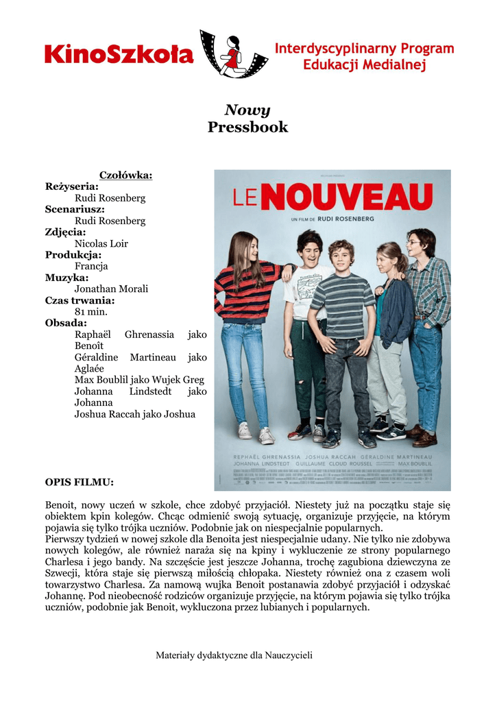 Nowy Pressbook Czołówka: Reżyseria: Rudi Rosenberg Scenariusz: Rudi Rosenberg Zdjęcia: Nicolas Loir Produkcja: Francja Muzyka: Jonathan Morali Czas trwania: 81 min. Obsada: Raphaël Ghrenassia jako Benoît Géraldine Martineau jako Aglaée Max Boublil jako Wujek Greg Johanna Lindstedt jako Johanna Joshua Raccah jako Joshua OPIS FILMU: Benoit, nowy uczeń w szkole, chce zdobyć przyjaciół. Niestety już na początku staje się obiektem kpin kolegów. Chcąc odmienić swoją sytuację, organizuje przyjęcie, na którym pojawia się tylko trójka uczniów. Podobnie jak on niespecjalnie popularnych. Pierwszy tydzień w nowej szkole dla Benoita jest niespecjalnie udany. Nie tylko nie zdobywa nowych kolegów, ale również naraża się na kpiny i wykluczenie ze strony popularnego Charlesa i jego bandy. Na szczęście jest jeszcze Johanna, trochę zagubiona dziewczyna ze Szwecji, która staje się pierwszą miłością chłopaka. Niestety również ona z czasem woli towarzystwo Charlesa. Za namową wujka Benoit postanawia zdobyć przyjaciół i odzyskać Johannę. Pod nieobecność rodziców organizuje przyjęcie, na którym pojawia się tylko trójka uczniów, podobnie jak Benoit, wykluczona przez lubianych i popularnych. Materiały dydaktyczne dla Nauczycieli NAGRODY: 2015 - nagroda publiczności na Międzynarodowym Festiwalu Filmów Frankofońskich w Namurze 2015 - Najlepszy debiut reżyserski Rudi Rosenberg na MFF w San Sebastián O TWÓRCACH: Rudi Rosenberg – reżyser Urodził się w 1979 r. we Francji. Od 14. do 24. roku życia był aktorem, lecz szybko poczuł potrzebę, by stanąć po drugiej stronie kamery. Uczył się reżyserii w Międzynarodowej Szkole Filmu i Telewizji w Paryżu. Na podstawie materiałów: http://www.filmweb.pl/film/Nowa+klasa-2015-738472 http://www.nhef.pl/edukacja/film.do?id=8368&ind=tytul%3dnowy#opis [dostęp: 16.08.2016 r.] Materiały dydaktyczne dla Nauczycieli