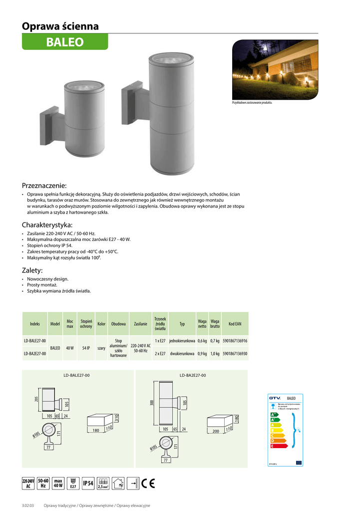 Oprawa ścienna BALEO Przykładowe zastosowanie produktu. Przeznaczenie: • Oprawa spełnia funkcję dekoracyjną. Służy do oświetlenia podjazdów, drzwi wejściowych, schodów, ścian budynku, tarasów oraz murów. Stosowana do zewnętrznego jak również wewnętrznego montażu w warunkach o podwyższonym poziomie wilgotności i zapylenia. Obudowa oprawy wykonana jest ze stopu aluminium a szyba z hartowanego szkła. Charakterystyka: • • • • • Zasilanie 220-240 V AC / 50-60 Hz. Maksymalna dopuszczalna moc żarówki E27 - 40 W. Stopień ochrony IP 54. Zakres temperatury pracy od -40°C do +50°C. Maksymalny kąt rozsyłu światła 100⁰. Zalety: • Nowoczesny design. • Prosty montaż. • Szybka wymiana źródła światła. Indeks Model Moc max Stopień ochrony BALEO 40 W 54 IP Kolor LD-BALE27-00 LD-BA2E27-00 Obudowa Trzonek źródła światła Zasilanie Typ LD-BA2E27-00 171 180 180 310 24 110 105 77 3.02.03 max 40 W E27 IP 54 2,5 mm2 Oprawy tradycyjne / Oprawy zewnętrzne / Oprawy elewacyjne 65 171 5 010 77 50-60 Hz BALEO 105 105 300 205 5 010 Kod EAN Stop 1 x E27 jednokierunkowa 0,6 kg 0,7 kg 5901867136916 220-240 V AC szary aluminium/ szkło 50-60 Hz 2 x E27 dwukierunkowa 0,9 kg 1,0 kg 5901867136930 hartowane LD-BALE27-00 105 65 Waga Waga netto brutto 24 200 110