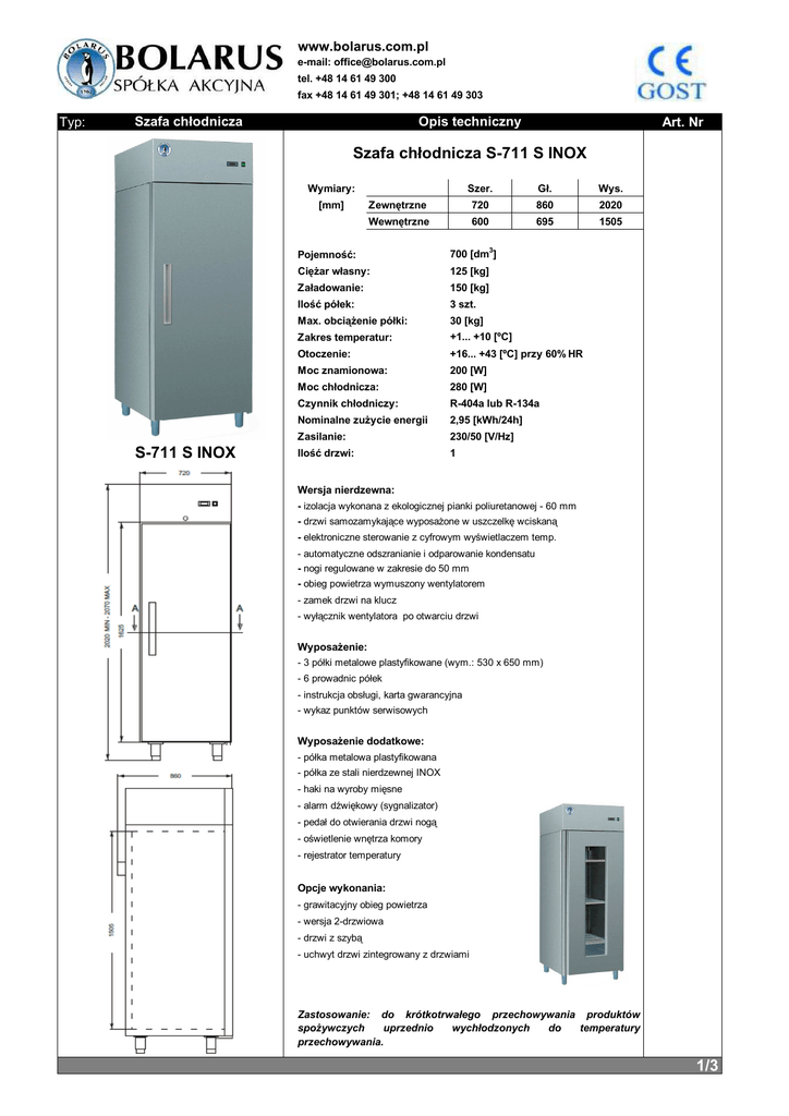 www.bolarus.com.pl e-mail: [email protected] tel. +48 14 61 49 300 fax +48 14 61 49 301; +48 14 61 49 303 Typ: Szafa chłodnicza Opis techniczny Art. Nr Szafa chłodnicza S-711 S INOX Wymiary: [mm] Szer. Gł. Wys. Zewnętrzne 720 860 2020 Wewnętrzne 600 695 1505 Pojemność: 700 [dm3] Ciężar własny: 125 [kg] Załadowanie: 150 [kg] Ilość półek: 3 szt. Max. obciążenie półki: 30 [kg] +1... +10 [ºC] Zakres temperatur: S-711 S INOX Otoczenie: +16... +43 [ºC] przy 60% HR Moc znamionowa: 200 [W] Moc chłodnicza: 280 [W] Czynnik chłodniczy: R-404a lub R-134a Nominalne zużycie energii 2,95 [kWh/24h] Zasilanie: 230/50 [V/Hz] Ilość drzwi: 1 Wersja nierdzewna: - izolacja wykonana z ekologicznej pianki poliuretanowej - 60 mm - drzwi samozamykające wyposażone w uszczelkę wciskaną - elektroniczne sterowanie z cyfrowym wyświetlaczem temp. - automatyczne odszranianie i odparowanie kondensatu - nogi regulowane w zakresie do 50 mm - obieg powietrza wymuszony wentylatorem - zamek drzwi na klucz - wyłącznik wentylatora po otwarciu drzwi Wyposażenie: - 3 półki metalowe plastyfikowane (wym.: 530 x 650 mm) - 6 prowadnic półek - instrukcja obsługi, karta gwarancyjna - wykaz punktów serwisowych Wyposażenie dodatkowe: - półka metalowa plastyfikowana - półka ze stali nierdzewnej INOX - haki na wyroby mięsne - alarm dźwiękowy (sygnalizator) - pedał do otwierania drzwi nogą - oświetlenie wnętrza komory - rejestrator temperatury Opcje wykonania: - grawitacyjny obieg powietrza - wersja 2-drzwiowa - drzwi z szybą - uchwyt drzwi zintegrowany z drzwiami Zastosowanie: do krótkotrwałego przechowywania produktów spożywczych uprzednio wychłodzonych do temperatury przechowywania. 1/3