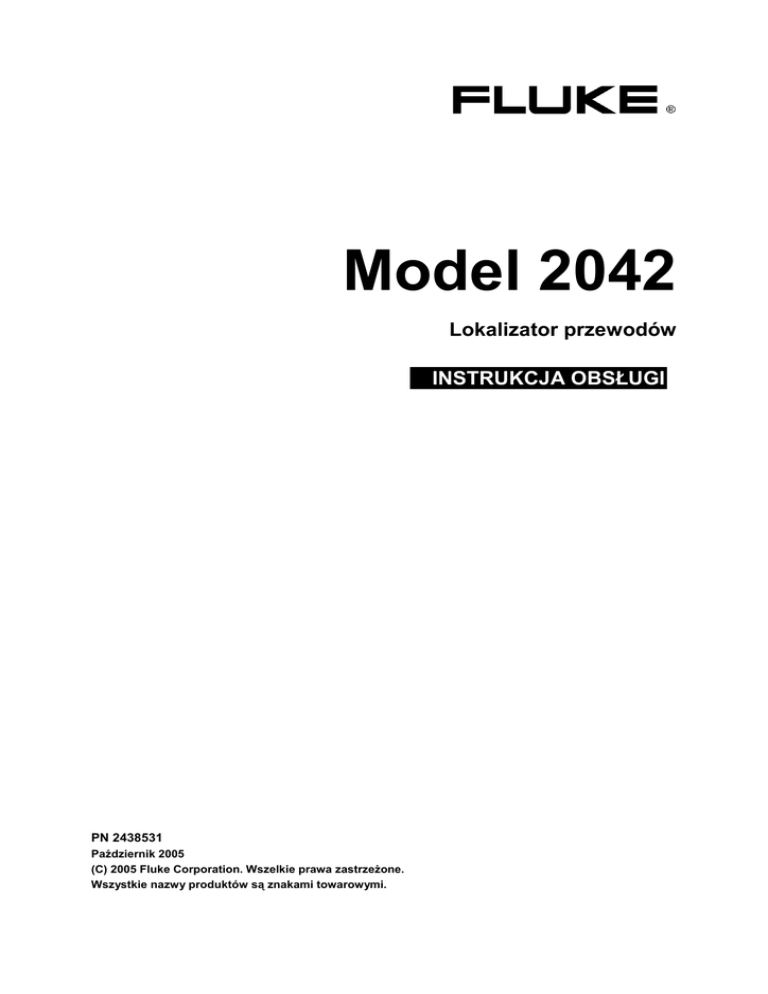 Model 2042 Lokalizator przewodów INSTRUKCJA OBSŁUGI PN 2438531 Październik 2005 (C) 2005 Fluke Corporation. Wszelkie prawa zastrzeŜone. Wszystkie nazwy produktów są znakami towarowymi. Lokalizator przewodów Fluke 2042 Ograniczona gwarancja i ograniczenie odpowiedzialności KaŜdy produkt firmy Fluke będzie wolny od usterek materiałowych i wykonawczych w warunkach normalnego, poprawnego uŜytkowania i serwisowania. Okres gwarancji – 1 rok rozpoczyna się z dniem dostarczenia miernika. Części zamienne, naprawy i usługi serwisowe są objęte 90-dniowym okresem gwarancji. Gwarancja niniejsza nie obejmuje bezpieczników, baterii jednorazowego uŜytku lub uszkodzenia w wyniku wypadku, zaniedbania, niewłaściwego uŜycia, dokonanych zmian, zanieczyszczenia, nienormalnych i niepoprawnych warunków uŜytkowania lub posługiwania się przyrządem. Sprzedawcy nie mają autoryzacji do rozszerzania jakiejkolwiek gwarancji w imieniu firmy Fluke. By skorzystać z obsługi gwarancyjnej w okresie gwarancyjnym naleŜy skontaktować się z najbliŜszym autoryzowanym punktem napraw firmy Fluke w celu uzyskania zwrotnego potwierdzenia prawa do naprawy gwarancyjnej, a następnie przesłać wyrób do tego autoryzowanego centrum wraz z opisem problemu. NINIEJSZA GWARANCJA JEST JEDYNYM ŚRODKIEM PRAWNYM PRZYSŁUGUJĄCYM NABYWCY. NIE ISTNIEJĄ INNE GWARANCJE, JAK PRZYDATNOŚĆ DO SZCZEGÓLNYCH ZASTOSOWAŃ, WYRAśONE LUB DOMNIEMANE. FIRMA FLUKE NIE PRZYJMUJE ODPOWIEDZIALNOŚCI ZA śADNE SZKODY LUB STRATY SZCZEGÓLNE, POŚREDNIE, UBOCZNE LUB WYNIKOWE, WŁĄCZAJĄC W TO UTRATĘ DANYCH WYNIKAJĄCE Z DOWOLNEJ PRZYCZYNY LUB INNEJ KONCEPCJI. Jako, Ŝe prawa niektórych państw lub stanów nie zezwalają na wykluczenia lub ograniczenia warunków rękojmi domniemanej lub odpowiedzialności za szkody uboczne lub wynikowe, wykluczenia niniejszej gwarancji mogą nie mieć zastosowania do wszystkich nabywców. Fluke Corporation P.O. BOX 9090 Everett, WA 98206-9090 U.S.A. Fluke Europe B.V. P.O. Box 1186 5602 BD Eindhiven The Netherlands 2 Lokalizator przewodów Fluke 2042 Spis treści Główne informacje / wstęp / zakres dostawy......................................................................................... Opis produktu......................................................................................................................................... Zakres dostawy...................................................................................................................................... Transport i przechowywanie.................................................................................................................. Bezpieczne pomiary............................................................................................................................... Poprawne uŜytkowanie.......................................................................................................................... Elementy i połączenia............................................................................................................................ Wykonywanie pomiarów........................................................................................................................ Teoretyczna zasada działania.......................................................................................................... Lokalizacja w zamkniętych obwodach.............................................................................................. WaŜne zastosowania........................................................................................................................ W otwartych obwodach (zastosowanie 1-biegunowe)...................................................................... W zamkniętych obwodach (zastosowanie 2-biegunowe)................................................................. Lokalizacja i wyszukiwanie przewodów, gniazdek, puszek i przełączników obwodów prądowych w instalacjach domowych (zastosowanie 1-biegunowe)................. Lokalizacja przerw w przewodach (zastosowanie 1-biegunowe)....................................... Dokładna lokalizacja przerw przy uŜyciu dwóch nadajników (zastosowanie 1-biegunowe)...................................................................................................................... Lokalizacja uszkodzeń w elektrycznym ogrzewaniu podłogowym (zastosowanie 1-biegunowe)...................................................................................................................... Lokalizacja zwęŜeń (miejsc zatkania) w rurach instalacyjnych (zastosowanie 1-biegunowe)...................................................................................................................... Lokalizacja zabezpieczeń (zastosowanie 2-biegunowe).................................................... Lokalizacja zwarć w przewodach (zastosowanie 2-biegunowe)........................................ Wyznaczanie tras rur wodociągowych i centralnego ogrzewania (zastosowanie 1-biegunowe)...................................................................................................................... Wyznaczanie trasy zainstalowanych rur wodociągowych i centralnego ogrzewania (zastosowanie 1-biegunowe).............................................................................................. Lokalizacja całej instalacji budynku (zastosowanie 1-biegunowe)..................................... Lokalizacja przewodów ułoŜonych na duŜej głębokości (zastosowanie 2-biegunowe)...... Lokalizacja przewodów w ziemi (zastosowanie 1-biegunowe)........................................... PodwyŜszanie zasięgu przy lokalizacji pod napięciem...................................................... Oznaczanie lub sortowanie zainstalowanych przewodów (zastosowanie 2-biegunowe)... Wykrywanie napięcia sieciowego poprzez lokalizację przerw............................................ Ustawianie kodów........