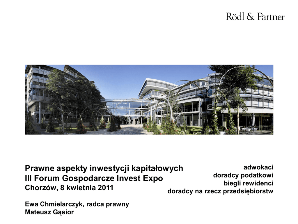 Prawne aspekty inwestycji kapitałowych III Forum Gospodarcze Invest Expo Chorzów, 8 kwietnia 2011 Ewa Chmielarczyk, radca prawny Mateusz Gąsior adwokaci doradcy podatkowi biegli rewidenci doradcy na rzecz przedsiębiorstw Prawne aspekty inwestycji kapitałowych Agenda papiery wartościowe: akcje obligacje inwestycje w nowe technologie finansowanie badań i rozwoju 2 Inwestycje kapitałowe Definicja Art. 3 ust. 1 pkt 17ustawy z dnia 29 września 1994 r. o rachunkowości (RachU) legalna definicja inwestycji Posiadane przez jednostkę aktywa finansowe (aktywa pieniężne, instrumenty kapitałowe, papiery wartościowe, nieruchomości, wartości niematerialne i prawne) użytkowane w celu osiągnięcia z nich korzyści ekonomicznych wynikających z przyrostu wartości tych aktywów finansowych, uzyskania przychodów w formie odsetek, dywidend (udziałów w zyskach) lub innych pożytków, w tym transakcji handlowej, a w szczególności aktywa finansowe oraz te nieruchomości i wartości niematerialne i prawne, które nie są użytkowane przez jednostkę, lecz są posiadane przez nią w celu osiągnięcia tych korzyści. 3 Papiery wartościowe Pojęcie brak definicji legalnej definicja zwyczajowa: Papier wartościowy, to kwalifikowany dokument stwierdzający istnienie określonego prawa majątkowego, utrwalony w takim brzmieniu i w taki sposób, że może stanowić samodzielny przedmiot obrotu. Posiadanie dokumentu stanowi niezbędną przesłankę przypisania prawa osobie formalnie uprawnionej z dokumentu oraz przesłankę realizacji przez nią tego prawa. Papierami wartościowymi są m.in. : akcje, czeki, obligacje, weksle, listy zastawne (uprawnione do ich emisji są banki hipoteczne), bony skarbowe (papiery wartościowe emitowane przez Skarb Państwa których celem jest pokrycie bieżących potrzeb budżetowych oraz zarządzanie płynnością budżetu). Papierami wartościowymi mogą być również dokumenty o charakterze handlowym, stanowiące podstawę do dysponowania towarami czy innymi składnikami majątkowymi i do przenoszenia tych uprawnień na inne podmioty tj. list przewozowy. 4 Papiery wartościowe Informacje ogólne Rodzaje papierów wartościowych/kryterium sposobu określenia osoby uprawnionej imienne – legitymują imiennie osobę uprawnionego na zlecenie – legitymują osobę imiennie wymienioną oraz osobę, na, którą uprawnienia z dokumentu zostały przeniesione indosem Indos – pisemne oświadczenie oznaczające przeniesienie praw na inną osobę, umieszczone na papierze wartościowym na zlecenie, opatrzone co najmniej podpisem zbywcy na okaziciela – legitymują, jako uprawnionego osobę, która przedstawia dokument jego wystawcy Rodzaje papierów wartościowych /kryterium przeniesienia praw majątkowych przeniesienie poprzez przelew połączony z wydaniem dokumentu (imienne), poprzez wydanie dokumentu oraz istnienie nieprzerwanego szeregu indosów (na zlecenie), poprzez wydanie dokumentu (na okaziciela). 5 Papiery wartościowe Informacje ogólne Rodzaje papierów wartościowych/kryterium charakteru praw majątkowych finansowe (np. akcje, obligacje) towarowe (np. listy przewozowe) Rodzaje papierów wartościowych/kryterium terminu płatności długoterminowe krótkoterminowe Rodzaje papierów wartościowych/kryterium funkcji jakie spełniają dokumenty stanowiące potwierdzenie wierzytelności pieniężnych (np. obligacje, weksle, czeki) dokumenty uprawniające do współwłasności majątkowej (np. akcje) 6 Papiery wartościowe - akcje Informacje ogólne Trzy podstawowe znaczenia pojęcia akcji : udział w kapitale zakładowym (akcja stanowi ułamek całego kapitału zakładowego) ogół praw i obowiązków wynikających z uczestnictwa w spółce dokument akcji jako papier wartościowy będący dowodem praw udziałowych akcjonariusza 7 Papiery wartościowe - akcje Informacje ogólne Obowiązki akcjonariuszy: wniesienie pełnego wkładu na pokrycie akcji – obowiązek bezwzględny, płatność odsetek ustawowych za opóźnienie lub odszkodowania w przypadku wniesienia wkładu po terminie, zwrot nienależnie otrzymanych świadczeń (wbrew przepisom prawa lub postanowieniom statutu), powtarzające się świadczenia niepieniężne (akcje imienne) dodatkowe świadczenia przewidziane statutem. 8 Papiery wartościowe – akcje Rodzaje akcji ze względu na sposób legitymacji akcjonariusza (art. 334 KSH): imienne – zawierają oznaczenie osoby akcjonariusza z imienia i nazwiska (firmy spółki). Akcje imienne mogą być wydane przed pełną wpłatą. na okaziciela (bezosobowe) – nie zawierają oznaczenia osoby akcjonariusza. Osobą uprawnioną do realizacji inkorporowanych w nich praw jest każdoczesny posiadacz akcji, nie zaś określona osoba wskazana z imienia i nazwiska (firmy spółki). Nie mogą być wydane przed pełną wpłatą (w zamian za częściową wpłatę wydawane są świadectwa tymczasowe). 9 Papiery wartościowe – akcje Rodzaje akcji ze względu na uprawnienia akcjonariusza: zwykłe – uprawniają posiadacza do 1 głosu w walnym zgromadzeniu oraz – proporcjonalnie do wniesionych wkładów – do wypłaty dywidendy, a w przypadku likwidacji spółki – do wypłaty majątku, uprzywilejowane – nadają posiadaczowi szczególne uprawnienia wynikające z postanowień statutu, w szczególności dotyczące liczby głosów (max. 2 na jedną akcję), wypłaty dywidendy, pierwszeństwa przy podziale majątku w razie likwidacji spółki (akcja niema tj. akcja uprzywilejowana z wyłączonym prawem głosu). „złota akcja” – inkorporuje szczególne uprawnienie przysługujące posiadaczowi, tj. prawo weta w walnym zgromadzeniu wobec najważniejszych decyzji dotyczących spółki (zmiana statutu, zmiana zarządu, podział zysku, itp.), mimo posiadania w spółce jednej akcji lub pakietu mniejszościowego. 10 Papiery wartościowe – akcje Sposoby nabycia w drodze emisji założycielskiej (pierwsza seria akcji): wartość nominalna akcji nie może być n