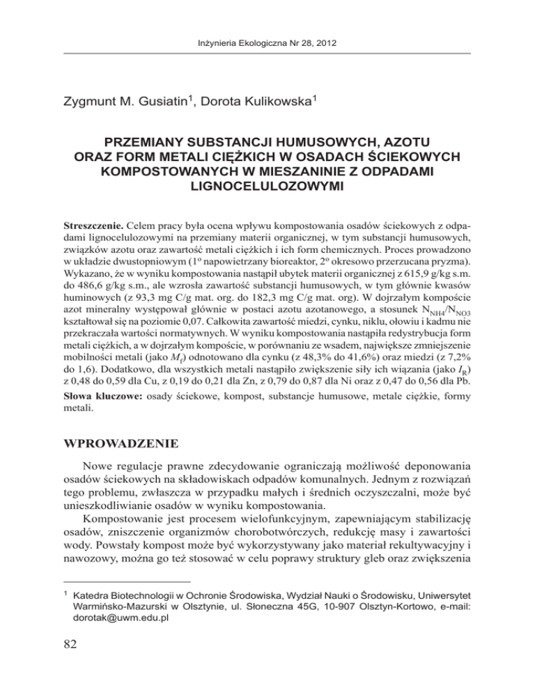 Inżynieria Ekologiczna Nr 28, 2012 Zygmunt M. Gusiatin1, Dorota Kulikowska1 PRZEMIANY SUBSTANCJI HUMUSOWYCH, AZOTU ORAZ FORM METALI CIĘŻKICH W OSADACH ŚCIEKOWYCH KOMPOSTOWANYCH W MIESZANINIE Z ODPADAMI LIGNOCELULOZOWYMI Streszczenie. Celem pracy była ocena wpływu kompostowania osadów ściekowych z odpadami lignocelulozowymi na przemiany materii organicznej, w tym substancji humusowych, związków azotu oraz zawartość metali ciężkich i ich form chemicznych. Proces prowadzono w układzie dwustopniowym (1o napowietrzany bioreaktor, 2o okresowo przerzucana pryzma). Wykazano, że w wyniku kompostowania nastąpił ubytek materii organicznej z 615,9 g/kg s.m. do 486,6 g/kg s.m., ale wzrosła zawartość substancji humusowych, w tym głównie kwasów huminowych (z 93,3 mg C/g mat. org. do 182,3 mg C/g mat. org). W dojrzałym kompoście azot mineralny występował głównie w postaci azotu azotanowego, a stosunek NNH4/NNO3 kształtował się na poziomie 0,07. Całkowita zawartość miedzi, cynku, niklu, ołowiu i kadmu nie przekraczała wartości normatywnych. W wyniku kompostowania nastąpiła redystrybucja form metali ciężkich, a w dojrzałym kompoście, w porównaniu ze wsadem, największe zmniejszenie mobilności metali (jako Mf) odnotowano dla cynku (z 48,3% do 41,6%) oraz miedzi (z 7,2% do 1,6). Dodatkowo, dla wszystkich metali nastąpiło zwiększenie siły ich wiązania (jako IR) z 0,48 do 0,59 dla Cu, z 0,19 do 0,21 dla Zn, z 0,79 do 0,87 dla Ni oraz z 0,47 do 0,56 dla Pb. Słowa kluczowe: osady ściekowe, kompost, substancje humusowe, metale ciężkie, formy metali. WPROWADZENIE Nowe regulacje prawne zdecydowanie ograniczają możliwość deponowania osadów ściekowych na składowiskach odpadów komunalnych. Jednym z rozwiązań tego problemu, zwłaszcza w przypadku małych i średnich oczyszczalni, może być unieszkodliwianie osadów w wyniku kompostowania. Kompostowanie jest procesem wielofunkcyjnym, zapewniającym stabilizację osadów, zniszczenie organizmów chorobotwórczych, redukcję masy i zawartości wody. Powstały kompost może być wykorzystywany jako materiał rekultywacyjny i nawozowy, można go też stosować w celu poprawy struktury gleb oraz zwiększenia 1 Katedra Biotechnologii w Ochronie Środowiska, Wydział Nauki o Środowisku, Uniwersytet Warmińsko-Mazurski w Olsztynie, ul. Słoneczna 45G, 10-907 Olsztyn-Kortowo, e-mail: [email protected] 82 Inżynieria Ekologiczna Nr 28, 2012 zawartości próchnicy glebowej. Dlatego, z rolniczego punktu widzenia, w kompoście ważna jest nie tylko ogólna zawartość węgla i składników mineralnych, ale też substancji humusowych. Substancje humusowe stanowią jeden z najważniejszych składników gleb i w dużym stopniu wpływają na ich właściwości. W niniejszej pracy określono udział poszczególnych frakcji humusu, tj. substancji humusowych, kwasów fulwowych i huminowych w kompoście, co może dostarczyć informacji o rodzaju egzogennych związków organicznych wprowadzanych do gleb razem z kompostem. Jednym z warunków dopuszczenia kompostu do obrotu jest dotrzymanie normatywnych stężeń metali ciężkich, głównie chromu, kadmu, niklu, ołowiu i rtęci. Jednakże ogólna zawartość metali ciężkich nie jest miarodajnym wskaźnikiem oceny ich biodostępności. Takiej oceny można dokonać przez oszacowanie udziału metali w formach mobilnych lub niemobilnych [5]. Oprócz określenia całkowitej zawartości metali oraz ich form chemicznych, wyznaczono również wskaźniki mobilności Mf i stabilności metali IR, które do tej pory stosowano głównie do oceny stopnia migracji i siły wiązania metali w glebach [3, 18]. Określenie tych wskaźników dla kompostu pozwoli ocenić ryzyko potencjalnego uwalniania metali do środowiska gruntowo-wodnego w przypadku jego stosowania jako materiału nawozowego i strukturotwórczego. METODYKA BADAŃ Charakterystyka wsadu Kompostowano osady odwodnione na prasie filtracyjnej z oczyszczalni ścieków komunalnych pracującej w systemie SBR. Ze względu na małą porowatość, wysoką zawartość wody (89%) oraz zawężony stosunek C/N (11,2), osady mieszano z odpadami lignocelulozowymi w proporcjach (w/w): osady ściekowe 60%, zaszczepienie 5% (dojrzały kompost z poprzedniej serii badawczej), zrębki drewniane 20%, słoma rzepakowa 15%. Wprowadzenie wymienionych materiałów umożliwiło uzyskanie odpowiedniej struktury kompostowanej masy, obniżenie zawartości wody do ok. 70% oraz rozszerzenie stosunku C/N do 21. W analizowanych osadach ściekowych, nie stwierdzono obecności bakterii chorobotwórczych z rodzaju Salmonella oraz żywych jaj pasożytów jelitowych (Ascarsis sp., Trichuris sp., Toxocara sp.). Charakterystyka urządzeń do kompostowania Kompostowanie prowadzono w układzie dwustopniowym, gdzie 1o stanowił napowietrzany bioreaktor, a 2o – okresowo przerzucana pryzma. Bioreaktor, o objętości 1 m3, wyposażony był w system napowietrzający, składający się ze skrzyni napowietrzającej, wentylatora oraz rotametru. Intensywność napowietrzania regulowano za pomocą falownika sprzężonego z napędem wentylatora. W bioreaktorze zamontowano 83 Inżynieria Ekologiczna Nr 28, 2012 3 czujniki temperaturowe, co umożliwiało odczyt temperatury z dokładnością do 0,1oC. Zawartość bioreaktora była przykryta 10 cm warstwą dojrzałego kompostu oraz folią, co ograniczało parowanie wody oraz emisję odorów. Szczegółowy opis bioreaktora przedstawiono w pracy Kulikowskiej i Klimiuk [7]. Świeży kompost, o niskim stopniu humifikacji, kierowano do drugiego układu (pryzmy), w którym następowało dojrzewanie kompostu i humifikacja materii organicznej. Warunki kompostowania Kompostowanie trwało 170 dni, w tym faza mineralizacji oraz higienizacji w napowietrzanym reaktorze 10 dni i dojrzewania na pryzmie 160 dni. Zgodnie z założeniami ilość wprowadzanego do bioreaktora powietrza utrzymywano na poziomie 0,5–1 dm3/kg.min i regulowano w zależn
