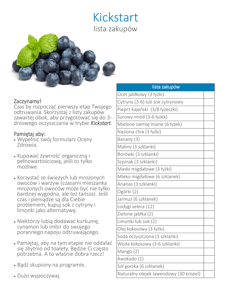 Kickstart lista zakupów lista zakupów Ocet jabłkowy (3 łyżki) Zaczynamy! Cytryny (3-6) lub sok cytrynowy Czas by rozpocząć pierwszy etap Twojego Pieprz kajeński (3/8 łyżeczki) odtruwania. Skorzystaj z listy zakupów zawartej obok, aby przygotować się do 3- Surowy miód (3-6 łyżek) dniowego oczyszczania w trybie Kickstart. Mielone siemię lniane (6 łyżek) Nasiona chia (3 łyżki) Pamiętaj aby: Banany (3) Wypełnić swój formularz Oceny Zdrowia. Maliny (3 szklanki) Borówki (3 szklanki) Kupować żywność organiczną i pełnowartościową, jeśli to tylko Szpinak (3 szklanki) możliwe. Masło migdałowe (3 łyżki) Mleko migdałowe (6 szklanek) Korzystać ze świeżych lub mrożonych owoców i warzyw (czasami mieszanka Ananas (3 szklanki) mrożonych owoców może być nie tylko Ogórki (2) bardziej wygodna, ale też tańsza). Jeśli Jarmuż (6 szklanek) czas i pieniądze są dla Ciebie problemem, kupuj sok z cytryny i Łodygi selera (12) limonki jako alternatywę. Zielone jabłka (2) Niektórzy lubią dodawać kurkumę, Limonki lub sok (2) cynamon lub imbir do swojego Olej kokosowy (3 łyżki) porannego napoju odtruwającego. Soda oczyszczona (3 szklanki) Pamiętaj, aby na tym etapie nie oddalać Woda kokosowa (3-6 szklanki) się zbytnio od toalety. Będzie Ci często Mango (2) potrzebna. A to właśnie dobra rzecz! Awokado (1) Bądź skupiony na programie. Sól gorzka (6 szklanek) Naturalny olejek lawendowy (30 kropel) Dużo wypoczywaj.