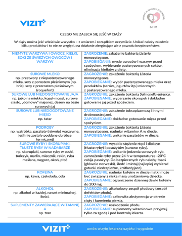 CZEGO NIE ZALECA SIĘ JEŚĆ W CIĄŻY W ciąży można jeść właściwie wszystko – z umiarem i rozsądkiem oczywiście. Unikać należy zaledwie kilku produktów i to nie ze względu na działanie alergizujące ale z powodu bezpieczeństwa. NIEMYTE WARZYWA I OWOCE, KIEŁKI, SOKI ZE ŚWIEŻYCH OWOCÓW I WARZYW SUROWE MLEKO np. przetwory z niepasteryzowanego mleka, sery z porostem pleśniowym (np. brie), sery z przerostem pleśniowym (roquefort) SUROWE LUB NIEDOGOTOWANE JAJA np. jajko na miękko, kogel-mogel, surowe ciasto, „domowy” majonez, desery na bazie surowych jaj SUROWE LUB NIEDOGOTOWANE MIĘSO np. tatar PODROBY np. wątróbka, pasztety (również warzywne, jeśli nie zostały poddane obróbce termicznej) SUROWE RYBY I SKORUPIAKI, TŁUSTE RYBY W NADMIARZE np. skorupiaki, surowe ryby w sushi, tuńczyk, marlin, miecznik, rekin, ryba maślana, węgorz, okoń, płoć KOFEINA np. kawa, czekolada, cola ALKOHOL np. alkohol w każdej, nawet minimalnej, ilości. SUPLEMENTY ZAWIERAJĄCE WITAMINĘ A np. tran ZAGROŻENIE: zakażenie bakterią Listeria monocytogenes. ZAPOBIEGANIE: mycie owoców i warzyw przed spożyciem, wybieranie pasteryzowanych soków, eliminacja kiełków z diety. ZAGROŻENIE: zakażenie bakterią Listeria monocytogenes. ZAPOBIEGANIE: wybór pasteryzowanego mleka oraz produktów (serów, jogurtów itp.) mlecznych z pasteryzowanego mleka. ZAGROŻENIE: zakażenie bakterią Salmonella enterica. ZAPOBIEGANIE: wyparzanie skorupek i dokładne gotowanie jaj przed spożyciem. ZAGROŻENIE: zakażenie toksoplazmozą i innymi drobnoustrojami. ZAPOBIEGANIE: dokładne gotowanie mięsa przed spożyciem. ZAGROŻENIE: zakażenie bakterią Listeria monocytogenes, nadmiar witaminy A w diecie. ZAPOBIEGANIE: unikanie pasztetów w diecie. ZAGROŻENIE: wysokie stężenie rtęci i dioksyn (tłuste ryby) i pasożytów (surowe ryby). ZAPOBIEGANIE: unikanie jedzenia surowych ryb, zamrożenie ryby przez 24 h w temperaturze -20oC zabija pasożyty. Do bezpiecznych ryb należą: łosoś (głównie norweski), śledź i mintaj (najlepiej wybierać gatunki niedrapieżne, krótkożyjace). ZAGROŻENIE: nadmiar kofeiny w diecie matki może być związany z niską masą urodzeniową dziecka. ZAPOBIEGANIE: ograniczenie dziennej dawki kofeiny do 200 mg. ZAGROŻENIE: alkoholowy zespół płodowy (zespół defektów płodu). ZAPOBIEGANIE: całkowita abstynencja w okresie ciąży i karmienia piersią. ZAGROŻENIE: uszkodzenie płodu. ZAPOBIEGANIE: suplementy witaminowe przyjmuj tylko za zgodą i pod kontrolą lekarza.