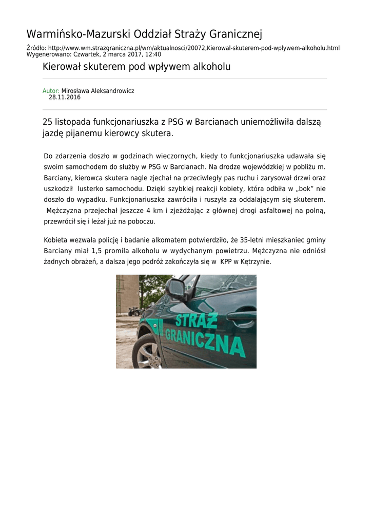 Warmińsko-Mazurski Oddział Straży Granicznej Źródło: http://www.wm.strazgraniczna.pl/wm/aktualnosci/20072,Kierowal-skuterem-pod-wplywem-alkoholu.html Wygenerowano: Czwartek, 2 marca 2017, 12:40 Kierował skuterem pod wpływem alkoholu Autor: Mirosława Aleksandrowicz 28.11.2016 25 listopada funkcjonariuszka z PSG w Barcianach uniemożliwiła dalszą jazdę pijanemu kierowcy skutera. Do zdarzenia doszło w godzinach wieczornych, kiedy to funkcjonariuszka udawała się swoim samochodem do służby w PSG w Barcianach. Na drodze wojewódzkiej w pobliżu m. Barciany, kierowca skutera nagle zjechał na przeciwległy pas ruchu i zarysował drzwi oraz uszkodził lusterko samochodu. Dzięki szybkiej reakcji kobiety, która odbiła w „bok” nie doszło do wypadku. Funkcjonariuszka zawróciła i ruszyła za oddalającym się skuterem. Mężczyzna przejechał jeszcze 4 km i zjeżdżając z głównej drogi asfaltowej na polną, przewrócił się i leżał już na poboczu. Kobieta wezwała policję i badanie alkomatem potwierdziło, że 35-letni mieszkaniec gminy Barciany miał 1,5 promila alkoholu w wydychanym powietrzu. Mężczyzna nie odniósł żadnych obrażeń, a dalsza jego podróż zakończyła się w KPP w Kętrzynie.