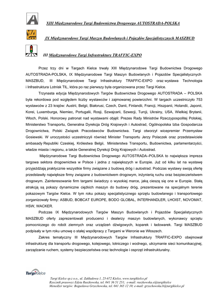XIII Międzynarodowe Targi Budownictwa Drogowego AUTOSTRADA-POLSKA IX Międzynarodowe Targi Maszyn Budowlanych i Pojazdów Specjalistycznych MASZBUD III Międzynarodowe Targi Infrastruktury TRAFFIC-EXPO Przez trzy dni w Targach Kielce trwały XIII Międzynarodowe Targi Budownictwa Drogowego AUTOSTRADA-POLSKA, IX Międzynarodowe Targi Maszyn Budowlanych i Pojazdów Specjalistycznych MASZBUD, III Międzynarodowe Targi Infrastruktury TRAFFIC-EXPO oraz wystawa Technologia i Infrastruktura Lotnisk TIL, która po raz pierwszy była organizowana przez Targi Kielce. Trzynasta edycja Międzynarodowych Targów Budownictwa Drogowego AUTOSTRADA – POLSKA była rekordowa pod względem liczby wystawców i zajmowanej powierzchni. W targach uczestniczyło 753 wystawców z 23 krajów: Austrii, Belgii, Białorusi, Czech, Danii, Finlandii, Francji, Hiszpanii, Holandii, Japonii, Korei, Luxemburga, Niemiec, Portugalii, Rosji, Szwajcarii, Szwecji, Turcji, Ukrainy, USA, Wielkiej Brytanii, Włoch, Polski. Honorowy patronat nad wystawami objęli: Prezes Rady Ministrów Rzeczypospolitej Polskiej, Ministerstwo Transportu, Generalna Dyrekcja Dróg Krajowych i Autostrad, Ogólnopolska Izba Gospodarcza Drogownictwa, Polski Związek Pracodawców Budownictwa. Targi otworzył wicepremier Przemysław Gosiewski. W uroczystości uczestniczyli również Minister Transportu Jerzy Polaczek oraz przedstawiciele ambasady Republiki Czeskiej, Królestwa Belgii, Ministerstwa Transportu, Budownictwa, parlamentarzyści, władze miasta i regionu, a także Generalnej Dyrekcji Dróg Krajowych i Autostrad. Międzynarodowe Targi Budownictwa Drogowego AUTOSTRADA–POLSKA to największa impreza targowa sektora drogownictwa w Polsce i jedna z największych w Europie. Już od kilku lat na wystawę przyjeżdżają praktycznie wszystkie firmy związane z budową dróg i autostrad. Podczas wystawy swoją ofertę przedstawiły największe firmy związane z budownictwem drogowym, inżynierią ruchu oraz bezpieczeństwem drogowym. Zainteresowanie firm targami świadczy o wysokiej marce, jaką cieszą się one w Europie. Stałą atrakcją są pokazy dynamiczne ciężkich maszyn do budowy dróg, prezentowane na specjalnym terenie pokazowym Targów Kielce. W tym roku pokazy specjalistycznego sprzętu budowlanego i transportowego zorganizowały firmy: ASBUD, BOBCAT EUROPE, BODO GLOBAL, INTERHANDLER, LHOIST, NOVOMAT, HSW, WACKER. Podczas IX Międzynarodowych Targów Maszyn Budowlanych i Pojazdów Specjalistycznych MASZBUD oferty zaprezentowali producenci i dealerzy maszyn budowlanych, wykonawcy sprzętu pomocniczego do robót ziemnych oraz urządzeń dźwigowych, koparek i ładowarek. Targi MASZBUD podpisały w tym roku umowę o stałej współpracy z Targami w Weronie we Włoszech. Zakres tematyczny III Międzynarodowych Targów Infrastruktury TRAFFIC-EXPO obejmował infrastrukturę dla transportu drogowego, kolejowego, lotniczego i wodnego, utrzymanie sieci komunikacyjnej, zarządzanie ruchem, systemy bezpieczeństwa oraz technologie i osprzęt infrastrukturalny. Targi Kielce sp.z o.o., ul. Zakładowa 1, 25-672 Kielce, www.targikielce.pl Rzecznik prasowy: Edyta Ruszkowska, tel. 041 36 51 251; e-mail: ruszkowska.e@targikielce Menedżer targów: Bogusława Grzechowska, tel. 041 365 12 10; e-mail: [email protected] XIII Międzynarodowe Targi Budownictwa Drogowego AUTOSTRADA-POLSKA IX Międzynarodowe Targi Maszyn Budowlanych i Pojazdów Specjalistycznych MASZBUD III Międzynarodowe Targi Infrastruktury TRAFFIC-EXPO Tegorocznym targom towarzyszyły konferencje i seminaria branżowe, m. in.: "Przyśpieszenie budowy dróg ekspresowych w programie rządowym "Infrastruktura i środowisko", "Rozwój infrastruktury transportowej w kraju szansą dla regionów". Podczas targów akredytowało się 132 dziennikarzy z kraju i zagranicy. Targi Kielce sp.z o.o., ul. Zakładowa 1, 25-672 Kielce, www.targikielce.pl Rzecznik prasowy: Edyta Ruszkowska, tel. 041 36 51 251; e-mail: ruszkowska.e@targikielce Menedżer targów: Bogusława Grzechowska, tel. 041 365 12 10; e-mail: [email protected]