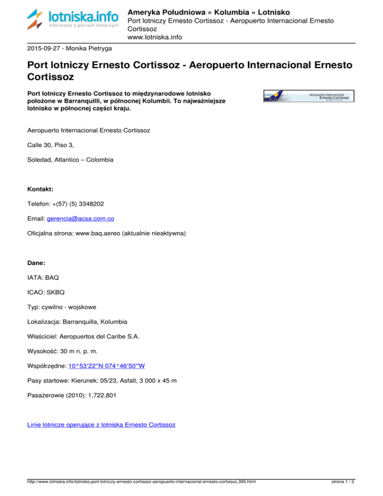 Ameryka Południowa » Kolumbia » Lotnisko Port lotniczy Ernesto Cortissoz - Aeropuerto Internacional Ernesto Cortissoz www.lotniska.info 2015-09-27 - Monika Pietryga Port lotniczy Ernesto Cortissoz - Aeropuerto Internacional Ernesto Cortissoz Port lotniczy Ernesto Cortissoz to międzynarodowe lotnisko położone w Barranquilli, w północnej Kolumbii. To najważniejsze lotnisko w północnej części kraju. Aeropuerto Internacional Ernesto Cortissoz Calle 30, Piso 3, Soledad, Atlantico – Colombia Kontakt: Telefon: +(57) (5) 3348202 Email: [email protected] Oficjalna strona: www.baq.aereo (aktualnie nieaktywna) Dane: IATA: BAQ ICAO: SKBQ Typ: cywilno - wojskowe Lokalizacja: Barranquilla, Kolumbia Właściciel: Aeropuertos del Caribe S.A. Wysokość: 30 m n. p. m. Współrzędne: 10°53′22″N 074°46′50″W Pasy startowe: Kierunek: 05/23, Asfalt, 3 000 x 45 m Pasażerowie (2010): 1,722,801 Linie lotnicze operujące z lotniska Ernesto Cortissoz http://www.lotniska.info/lotnisko,port-lotniczy-ernesto-cortissoz-aeropuerto-internacional-ernesto-cortissoz,395.html strona 1 / 2 Ameryka Południowa » Kolumbia » Lotnisko Port lotniczy Ernesto Cortissoz - Aeropuerto Internacional Ernesto Cortissoz www.lotniska.info Tablica lotów - Odloty Tablica lotów - Przyloty Zobacz lądowanie na lotnisku w Barranquilli (wideo): Opis: Międzynarodowe lotnisko Ernesto Cortissoz, zwane także lotniskiem Barranquilla to najważniejszy port lotniczy w północnej części kraju i pierwszy pod względem ruchu cargo. Znajduje się w gminie Soledad, 12 km od centrum miasta Barranquilla w Kolumbii. Swą nazwę zawdzięcza jednemu z pionierów lotnictwa kolumbijskiego - Ernesto Cortissoz. Posiada dwa terminale: krajowy (bramki 6-13) i międzynarodowy (bramki 1-5 i 5A). Jest zdolny do obsługi samolotów szerokokadłubowych typu Boeing 747, McDonnell Douglas DC-10 i Airbus A340. Niegdyś największe lotnisko w Kolumbii, obecnie jest na piątym miejscu w kraju. DOJAZD Wypożyczenie samochodu Najszybszym rozwiązaniem jest wypożyczenie samochodu zjedną z firm, których punkty znajdują się na lotnisku. Są to następujące firmy: - hertz tel. +57-5-3425205 / 3426410, email: [email protected] - Localiza , tel. +57-5-3425554 - National Car Rental, tel. +57-5-3348187 - Premier tel. 57-5-3348267 Źródło: (wikipedia, aeropuertos.net) http://www.lotniska.info/lotnisko,port-lotniczy-ernesto-cortissoz-aeropuerto-internacional-ernesto-cortissoz,395.html http://www.lotniska.info/lotnisko,port-lotniczy-ernesto-cortissoz-aeropuerto-internacional-ernesto-cortissoz,395.html Powered by TCPDF (www.tcpdf.org) strona 2 / 2