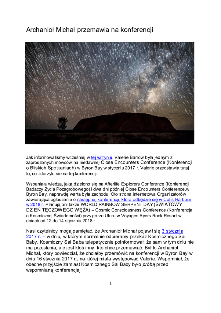 Archanioł Michał przemawia na konferencji Jak informowaliśmy wcześniej w tej witrynie, Valerie Barrow była jednym z zaproszonych mówców na niedawnej Close Encounters Conference (Konferencji o Bliskich Spotkaniach) w Byron Bay w styczniu 2017 r. Valerie przedstawia tutaj to, co zdarzyło sie na tej konferencji. Wspaniała wiedza, jaką dzielono się na Afterlife Explorers Conference (Konferencji Badaczy Życia Pozagrobowego) i dwa dni później Close Encounters Conference,w Byron Bay, naprawdę warta była zachodu. Oto strona internetowa Organizatorów zawierająca ogłoszenie o następnej konferencji, która odbędzie się w Coffs Harbour w 2018 r. Planują oni także WORLD RAINBOW SERPENT DAY (ŚWIATOWY DZIEŃ TĘCZOW EGO WĘŻA) – Cosmic Consciousness Conference (Konferencja o Kosmicznej Świadomości) przy górze Uluru w Voyages Ayers Rock Resort w dniach od 12 do 14 stycznia 2018 r. Nasi czytelnicy mogą pamiętać, że Archanioł Michał pojawił się 3 stycznia 2017 r. – w dniu, w którym normalnie odbieramy przekaz Kosmicznego Sai Baby. Kosmiczny Sai Baba telepatycznie poinformował, że sam w tym dniu nie ma przesłania, ale jest ktoś inny, kto chce przemawiać. Był to Archanioł Michał, który powiedział, że chciałby przemówić na konferencji w Byron Bay w dniu 16 stycznia 2017 r., na której miała występować Valerie. Wspomniał, że obecne przyjście zamiast Kosmicznego Sai Baby było próbą przed wspomnianą konferencją. 1 Wystąpienie na konferencji Valerie zaczęła od przedstawienia swojego związku z Sathya Sai Babą, Kosmicznym Sai Babą i Alcheringą – duchem opiekuńczym Aborygenów, rdzennych mieszkańców Australii. Po tym nastąpiła sesja channelingu z Alcheringą (która będzie udostępniona po przygotowaniu wideo). Następnie mówił Archanioł Michał. Zanim wysłuchacie Archanioła Michała – link do zapisu audio znajduje się poniżej – możecie odnieść korzyść z zapoznania się z tym, co Alcheringa powiedział Valerie podczas jej odwiedzin góry Uluru (pokazanej na załączonym tu zdjęciu) z przyjaciółmi w roku 1994. Oto wyjątek z książki The Book of Love, by a Medium (Księga miłości napisana przez medium) autorstwa Valerie. To Wydarzenie – w tym miejscu mój głos zaczął się zmieniać. – Tak, tym to jest. Będzie to Wydarzenie, które stanie się wydarzeniem światowym i odbije się echem w innych światach – wszystkie światy usłyszą o nim. Bedzie to początek podobnych zdarzeń na całej Ziemi, ale na Uluru będzie to jak otwarcie drzwi. Będzie to grupowe pojawienie się Gwiezdnych Statków i wszyscy obecni przy tej górze doświadczą obecności Istot Pozaziemskich. (Głębokie westchnienie.) Będzie to krótka wizyta, ale nie pozostawi u nikogo żadnych wątpliwości. Ty, moja droga, będziesz naszym rzecznikiem. Nie zamierzamy lądować, ani zabierać cię na pokład. Będzie intensywna komunikacja i Czarny człowiek (Aborygen) i Biały człowiek wiele zrozumieją. Tą informacją będziecie się dzielić. To będzie pomocne w nawiązaniu więzi między tymi dwoma rasami. Mówi Alcheringa. Archanioł Michał Oryginał i transkrypcja zapisu audio przekazu Archanioła Michała znajduje się w witrynie Valerie Barrow, a polskie tłumaczenie i oryginalne audio w witrynie Kosmicznego Sai Baby. Przekaz Archanioła Michała przypomniał Valerie, że o Wydarzeniu tym była mowa w roku 1994, kiedy trzymała Kamień Alcheringi – który był zawinięty w łykowy papier i przewiązany sznurkiem (nigdy go nie otworzyła). Opisała to „Wydarzenie” na stronie 105 swojej książki „The Book of Love, by a Medium,” której rękopis został osobiście pobłogosławiony przez Awatara Śri Sathya Sai Babę w 1995 r. Wracając pamięcią wstecz, rozumiem teraz, że gwiezdni ludzie uznali, że nie są mile widziani, dlatego wtedy odłożyli swoj ą grupową wizytę na Uluru. 2 Obecnie będą oceniać nastawienie wszystkich DUSZ na ziemi do ich GRUPOW EGO pojawienia się w styczniu 2018 r. Mamy oczywiście nadzieję, że stanie się to podczas Cosmic Consciousness Conference (Konferencji Kosmicznej Świadomości), która odbędzie się przy Uluru w dniach 12 – 14 stycznia 2018 r. Dnia 16 stycznia 2017 r. Archanioł przejawił się na Close Encounters Conference, która odbyła się w BYRON BAY. Czekamy na wideo pokazujące, jak on przychodzi w tę ziemską atmosferę i bardzo głośno „grzmi” swoje przesłanie. Mamy nadzieję, że wkrótce będziemy mogli umieścić na Youtube wideo, czego zażyczył sobie Archanioł Michał. Nota bene: Valerie wyjaśnia, że gdy Archanioł Michał wstępuje w nią: „Jego obecność przejmuje moje ciało – wtedy sprawia, że siedząc na krześle, pochylam się do przodu; czuję ‘bardzo silne parcie energii’, która jest wpompowywana w mój kręgosłup (szczególnie w okolice serca) i wówczas czuję i słyszę, jak jego głos wchodzi do mojej krtani i powoli podnosi moje ciało do pozycji wyprostowanej i wtedy on rozpościera swoje skrzydła i bardzo głośno zwraca się do wszystkich... Jest to, oczywiście, aktorstwo, ale mój mąż John powiedział mi, że to oczarowało całą widownię. Z pewnością w tym oczarowaniu nie utrzymuje ich głos Valerie – zauważa mąż. Jak powiedziała Valerie, była to najsilni ejsza energia przechodząca kiedykolwiek przeze mnie – i był to dla mnie prawdziwy wstrząs – myślałam, że to uniesie mnie w powietrze. Ledwo mogłam ustać. Gdy Kathryn Hand i Mike Turner (organizatorzy) weszli na scenę podczas zadawania pytań z publiczności, oboje stali po obu jej stronach i trzymali jej ręce. To naprawdę pomogło jej znów utrzymywać się na ziemi. Valerie była im za to szczerze wdzięczna.” W planach jest WORLD RAINBOW SERPENT DAY (ŚWIATOW Y DZIEŃ TĘCZOW EGO WĘŻA) podczas międzynarodowej Cosmic Consciousness Conference przy Uluru w schronisku Voyages Ayers Rock Resort w dniach 12 – 14 stycznia 2018 r. Miejsce