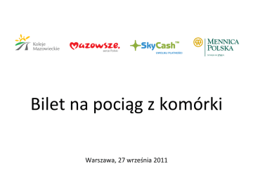 Bilet na pociąg z komórki Warszawa, 27 września 2011 Projekt realizowany przez Koleje Mazowieckie we współpracy z Mennicą Polską oraz SkyCash Poland (partner technologiczny) SkyCash Uniwersalna plaForma płatności mobilnych – wielość zastosowań Powszechność Powszechność • Niezależność od operatorów GSM • Wszystkie telefony z dostępem do Internetu (> 95% rynku) • Łatwe wdrożenie • Stale rozbudowywana sieć partnerów BILET NA POCIĄG Z KOMÓRKI Innowacyjność usługi • Możliwość wykonania wszystkich czynności związanych z zakupem biletu z poziomu komórki • Bilety dostępne wszędzie, przez 24 godziny na dobę, bez pośpiechu, kolejek czy odliczania drobnych JAK TO DZIAŁA? Proces zakupu biletu Wybór opcji zakupu biletu kolejowego Proces zakupu biletu Wybór rodzaju biletu Proces zakupu biletu Wprowadzenie szczegółów: -‐ wybór ulgi -‐ określenie godziny wyjazdu -‐ wprowadzenie danych osobowych (jednorazowo) Proces zakupu biletu Zatwierdzenie zakupu indywidualnym, 4-‐cyfrowym kodem PIN KONTROLA BILETU Proces kontroli Wejście do zakładki „Kontrola biletów” Proces kontroli Ekran komórki z zakupionym biletem Proces kontroli Ekran komórki z zakupionym biletem Film Podsumowanie
