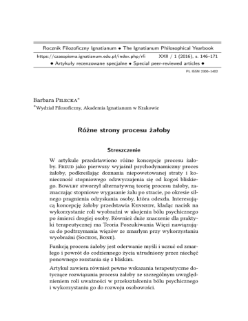 Rocznik Filozoficzny Ignatianum • The Ignatianum Philosophical Yearbook https://czasopisma.ignatianum.edu.pl/index.php/rfi XXII / 1 (2016), s. 146–171 • Artykuły recenzowane specjalne • Special peer-reviewed articles • PL ISSN 2300–1402 Barbara P∗ ∗ Wydział Filozoficzny, Akademia Ignatianum w Krakowie Różne strony procesu żałoby Streszczenie W artykule przedstawiono różne koncepcje procesu żałoby. F jako pierwszy wyjaśnił psychodynamiczny proces żałoby, podkreślając doznania niepowetowanej straty i konieczność stopniowego odzwyczajenia się od kogoś bliskiego. B stworzył alternatywną teorię procesu żałoby, zaznaczając stopniowe wygasanie żalu po stracie, po okresie silnego pragnienia odzyskania osoby, która odeszła. Interesującą koncepcję żałoby przedstawia K, kładąc nacisk na wykorzystanie roli wyobraźni w ukojeniu bólu psychicznego po śmierci drogiej osoby. Również duże znaczenie dla praktyki terapeutycznej ma Teoria Poszukiwania Więzi nawiązująca do podtrzymania więzów ze zmarłym przy wykorzystaniu wyobraźni (S, B). Funkcją procesu żałoby jest oderwanie myśli i uczuć od zmarłego i powrót do codziennego życia utrudniony przez niechęć ponownego rozstania się z bliskim. Artykuł zawiera również pewne wskazania terapeutyczne dotyczące rozwiązania procesu żałoby ze szczególnym uwzględnieniem roli uważności w przekształceniu bólu psychicznego i wykorzystaniu go do rozwoju osobowości. Różne strony procesu żałoby 147 Słowa kluczowe: proces żałoby — kryzys psychiczny — uważność — traumatyczne doświadczenia — świadomość uczuć Freudowskie koncepcje żałoby Przez całe życie dotykają nas straty; szczególnie bolesne są te, spowodowane śmiercią kogoś bliskiego. Niektórym osobom starszym życie przedstawia się jako seria strat, jako jeden łańcuch rozstań. Różne kierunki psychologiczne wskazują odmienne sposoby traktowania żalu po stracie. Wiele dla zrozumienia procesu żałoby wniósł Zygmunt F, który w 1917 roku opublikował krótki artykuł pt. „Żałoba i melancholia”1 . Przedstawił w nim psychoanalityczne wyjaśnienie straty, żalu i procesu żałoby. To wyjaśnienie okazało się jednym z najważniejszych przyczynków psychoanalizy do zrozumienia cierpienia. Angażujemy wiele psychicznej energii w innych ludzi i w związki z nimi. Energia zostaje zainwestowana nie tylko w związki z osobami znaczącymi, ale również we wspomnienia, powiązania, skojarzenia. Id przywiera do danego obiektu lub idei; ten związek go zaspokaja, spełnia. Patrioci kochają swój kraj, rodzice nie przestają kochać własnego dziecka, nawet gdy odejdzie z domu rodzinnego. Im związek jest ważniejszy, tym więcej energii psychicznej jest zaangażowanej. Odejście osoby ważnej dla nas zazwyczaj powoduje stratę zainteresowania otaczającym światem i innymi ludźmi. Poraża żalem. Intensywność żalu jest wyznacznikiem wagi związku. Im związek ważniejszy, tym strata jest bardziej bolesna. Strata ma charakter uniwersalny; wszyscy ludzie doświadczają strat. Właściwie całe życie możemy być w procesie żałoby, bo straty zdarzają się często2 . Straty dotykają nas już w okresie wczesnego dzieciństwa. Ale wspomnienia z dzieciństwa są zniekształcone. F, twórca psychoanalizy3 , wierzył, iż ludzie zmieniają historie swojego życia dzięki pamięci i nawet nie wiedzą o tym. Nasze wspomnienia nie 1 2 3 Por. F, Żałoba i melancholia, s. 147–159. Por. Ibid. s. 147–159. Por. V U, Freud’s Requiem. 148 Barbara Pilecka są wiarygodnymi archiwami, tak jak nam się wydaje, przechowującymi wiernie i szczegółowo doświadczenia życia. Nie są to fotografie lub filmy dokumentalne rzetelnie oddające ówczesną rzeczywistość. Psychiczne mechanizmy obronne nie dopuszczają do świadomości tego, co jest zbyt trudne lub niewygodne, i dlatego wspomnienia mogą się zniekształcać. Powszechna trudność odtwarzania przykrych doświadczeń najwcześniejszego dzieciństwa jest skutkiem amnezji, którą przynosi represja. Jest to też związane z chaosem panującym w pierwszych latach życia dziecka. Szczególną rolę odgrywają tutaj doświadczenia związane z kompleksem Edypa4 . Nieświadomie piszemy jeszcze raz historię naszego życia, mieszając rzeczywistość przeszłości z fantazjami, pragnieniami, żalem. Zatem również wspomnienia wczesnych strat są w pewnym stopniu zniekształcone poprzez działanie mechanizmów obronnych. Nie ma jednak wątpliwości, iż odejście osoby znaczącej jest bolesne, staje się źródłem dotkliwego cierpienia. Proces żałoby odnawia się przy wspomnieniach i skojarzeniach ze zmarłym. Ból psychiczny jednak słabnie w miarę trwania procesu żałoby. Zakończenie procesu żałoby wymaga „odwrócenia się plecami do świata realnego” i podjęcia żmudnej pracy, aby uwolnić się od bólu rozstania. Testowanie rzeczywistości wskazuje, że ukochany obiekt już nie istnieje. Rodzi się pragnienie wycofania całego libido z przywiązania do obiektu. To żądanie wywołuje sprzeciw. Jak wynika z ogólnej obserwacji, ludzie nigdy chętnie nie wycofują się z libidalnej pozycji. Sprzeciw jest tak silny, że człowiek może odwrócić się od rzeczywistości. Przywiera wtedy do obiektu za pośrednictwem marzeń na jawie, a niekiedy halucynacji związanych z osobą zmarłą, która zza grobu roztacza opiekę nad swoim bliskim lub go odwiedza. Proces żałoby czy też praca żałoby wymagają czasu i psychicznej energii. Każde pojedyncze wspomnienie i oczekiwanie, za pomocą których libido jest związane z obiektem, musi być wydobyte: intensywnie analizowane5 . 4 5 Por. F za S, Nieznany ląd. Por. F za K, Basic Freud. Różne strony procesu żałoby 149 U ludzi w procesie żalu po stracie występuje konflikt pomiędzy pragnieniem zatrzymania zmarłego a chęcią wyrażenia zgody, aby już odszedł. Wtedy ujawnia się poczucie winy