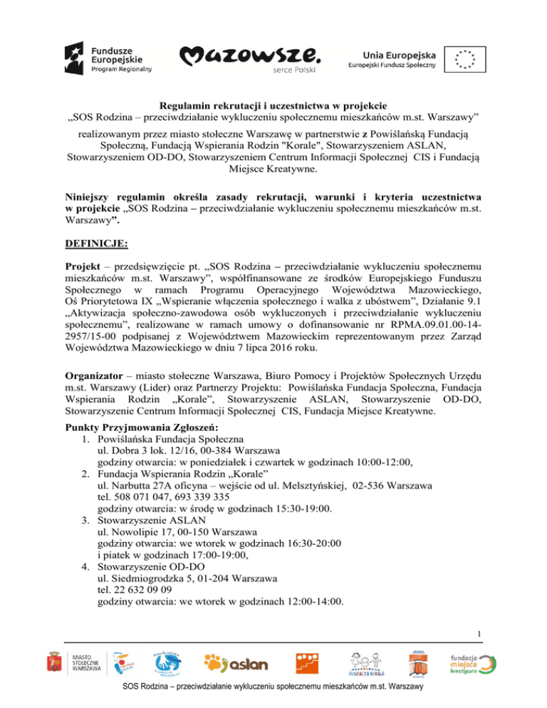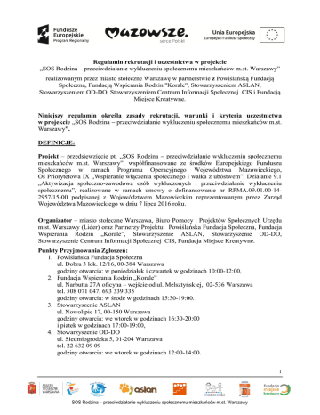 Regulamin rekrutacji i uczestnictwa w projekcie „SOS Rodzina – przeciwdziałanie wykluczeniu społecznemu mieszkańców m.st. Warszawy” realizowanym przez miasto stołeczne Warszawę w partnerstwie z Powiślańską Fundacją Społeczną, Fundacją Wspierania Rodzin "Korale", Stowarzyszeniem ASLAN, Stowarzyszeniem OD-DO, Stowarzyszeniem Centrum Informacji Społecznej CIS i Fundacją Miejsce Kreatywne. Niniejszy regulamin określa zasady rekrutacji, warunki i kryteria uczestnictwa w projekcie „SOS Rodzina – przeciwdziałanie wykluczeniu społecznemu mieszkańców m.st. Warszawy”. DEFINICJE: Projekt – przedsięwzięcie pt. „SOS Rodzina – przeciwdziałanie wykluczeniu społecznemu mieszkańców m.st. Warszawy”, współfinansowane ze środków Europejskiego Funduszu Społecznego w ramach Programu Operacyjnego Województwa Mazowieckiego, Oś Priorytetowa IX „Wspieranie włączenia społecznego i walka z ubóstwem”, Działanie 9.1 „Aktywizacja społeczno-zawodowa osób wykluczonych i przeciwdziałanie wykluczeniu społecznemu”, realizowane w ramach umowy o dofinansowanie nr RPMA.09.01.00-142957/15-00 podpisanej z Województwem Mazowieckim reprezentowanym przez Zarząd Województwa Mazowieckiego w dniu 7 lipca 2016 roku. Organizator – miasto stołeczne Warszawa, Biuro Pomocy i Projektów Społecznych Urzędu m.st. Warszawy (Lider) oraz Partnerzy Projektu: Powiślańska Fundacja Społeczna, Fundacja Wspierania Rodzin „Korale”, Stowarzyszenie ASLAN, Stowarzyszenie OD-DO, Stowarzyszenie Centrum Informacji Społecznej CIS, Fundacja Miejsce Kreatywne. Punkty Przyjmowania Zgłoszeń: 1. Powiślańska Fundacja Społeczna ul. Dobra 3 lok. 12/16, 00-384 Warszawa godziny otwarcia: w poniedziałek i czwartek w godzinach 10:00-12:00, 2. Fundacja Wspierania Rodzin „Korale” ul. Narbutta 27A oficyna – wejście od ul. Melsztyńskiej, 02-536 Warszawa tel. 508 071 047, 693 339 335 godziny otwarcia: w środę w godzinach 15:30-19:00. 3. Stowarzyszenie ASLAN ul. Nowolipie 17, 00-150 Warszawa godziny otwarcia: we wtorek w godzinach 16:30-20:00 i piatek w godzinach 17:00-19:00, 4. Stowarzyszenie OD-DO ul. Siedmiogrodzka 5, 01-204 Warszawa tel. 22 632 09 09 godziny otwarcia: we wtorek w godzinach 12:00-14:00. 1 SOS Rodzina – przeciwdziałanie wykluczeniu społecznemu mieszkańców m.st. Warszawy Definicje Osoby korzystające ze świadczeń z pomocy społecznej - osoby, które korzystają ze świadczeń z pomocy społecznej na podstawie ustawy z dnia 12 marca 2004 r. o pomocy społecznej (tj. Dz.U. 2016 poz. 930 z późn. zm.). Osoby kwalifikujące się do objęcia wsparciem z pomocy społecznej - osoby, które spełniają co najmniej jedną z przesłanek określonych w art. 7 ustawy z dnia 12 marca 2004 r. o pomocy społecznej, tj. z powodu: 1) ubóstwa; 2) sieroctwa; 3) bezdomności; 4) bezrobocia; 5) niepełnosprawności; 6) długotrwałej lub ciężkiej choroby; 7) przemocy w rodzinie; 8) potrzeby ochrony ofiar handlu ludźmi; 9) potrzeby ochrony macierzyństwa lub wielodzietności; 10) bezradności w sprawach opiekuńczo-wychowawczych i prowadzenia gospodarstwa domowego, zwłaszcza w rodzinach niepełnych lub wielodzietnych; 11) trudności w integracji cudzoziemców, którzy uzyskali w Rzeczypospolitej Polskiej status uchodźcy, ochronę uzupełniającą lub zezwolenie na pobyt czasowy udzielone w związku z okolicznością, o której mowa w art. 159 ust. 1 pkt 1 lit. c lub d ustawy z dnia 12 grudnia 2013 r. o cudzoziemcach; 12) trudności w przystosowaniu do życia po zwolnieniu z zakładu karnego; 13) alkoholizmu lub narkomanii; 14) zdarzenia losowego i sytuacji kryzysowej; 15) klęski żywiołowej lub ekologicznej. Osoba nieaktywna zawodowo – osoba pozostająca bez zatrudnienia, niewykonująca innej pracy zarobkowej, zdolna i gotowa do podjęcia zatrudnienia lub innej pracy zarobkowej w co najmniej połowie wymiaru czasu pracy, nie zarejestrowana w urzędzie pracy. Osoba bierna zawodowo - osoba, która w danej chwili nie tworzy zasobów siły roboczej tzn. nie pracuje i nie jest bezrobotna (studenci, osoby na urlopach wychowawczych). Kandydat/Kandydatka (dalej kandydat) – osoba lub rodzina zagrożona ubóstwem lub wykluczeniem społecznym, korzystająca ze świadczeń z pomocy społecznej zgodnie z ustawą z dnia 12 marca 2004 r. o pomocy społecznej lub kwalifikująca się do objęcia wsparciem z pomocy społecznej, która złożyła dokumenty rekrutacyjne w Punkcie Przyjmowania Zgłoszeń. Uczestnik/Uczestniczka (dalej Uczestnik) – osoba spełniająca kryteria uczestnictwa w Projekcie zapisane w § 3 Regulaminu, wybrana w procedurze rekrutacyjnej. Przez Uczestnika rozumie się osobę znajdującą się na liście podstawowej, która ma prawo 2 SOS Rodzina – przeciwdziałanie wykluczeniu społecznemu mieszkańców m.st. Warszawy do udziału w Projekcie i podpisze dokumenty wymienione w § 4 ust. 9. Uczestnik rezerwowy – przez Uczestnika rezerwowego rozumie się osobę, znajdującą się na liście rezerwowej Projektu, spełniającą kryteria uczestnictwa w Projekcie zapisane w § 3 Regulaminu. Osoba z listy rezerwowej posiada prawo wejścia na listę podstawową w przypadku zwolnienia się na niej miejsca. Biuro Projektu – miejsce, w którym przechowywana jest dokumentacja Projektu oraz umożliwiony jest kontakt z personelem Projektu ul. Niecała 2, pok. nr 14 00-098 Warszawa tel. 22 443 14 77 e-mail: [email protected] godziny otwarcia: 8:00 – 16:00. Strona internetowa Projektu – www.um.warszawa.pl/sosRodzina Dokumenty rekrutacyjne – formularz zgłoszeniowy, oświadczenie dotyczące spełnienia kryteriów grupy docelowej oraz oświadczenie o korzystaniu/niekorzystaniu z PO PŻ. Formularz zgłoszeniowy – dokument, w oparciu o który prowadzony jest proces rekrutacji Uczestników do Projektu (załącznik nr 1 do Regulaminu). Oświadczenie uczestnika projektu – dokument podpisywany przez Uczestnika z chwilą przystąpienia do Projektu (załącznik nr 