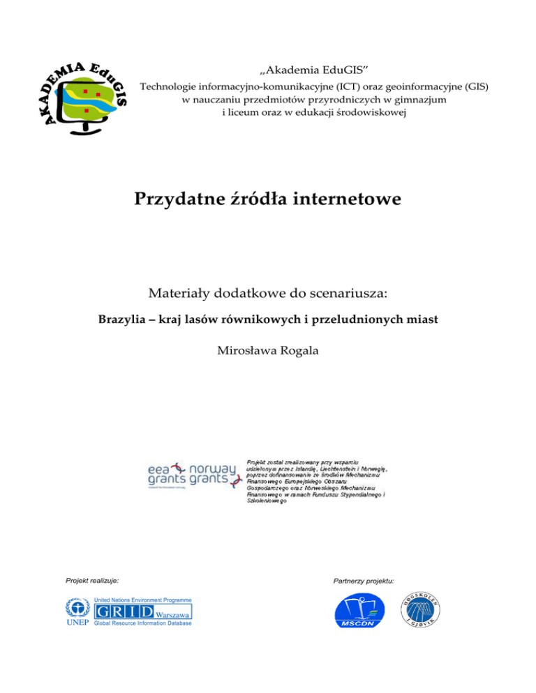 „Akademia EduGIS” Technologie informacyjno-komunikacyjne (ICT) oraz geoinformacyjne (GIS) w nauczaniu przedmiotów przyrodniczych w gimnazjum i liceum oraz w edukacji środowiskowej Przydatne źródła internetowe Materiały dodatkowe do scenariusza: Brazylia – kraj lasów równikowych i przeludnionych miast Mirosława Rogala Projekt realizuje: Partnerzy projektu: Strony polskojęzyczne: • Interaktywny atlas świata (Wydawnictwo Edukacyjne WIKING) http://www.wiking.edu.pl/article.php?id=109 w tym: − mapa fizyczną Ameryki Południowej http://www.wiking.edu.pl/show_image.php?type=animation&f=geografia/animations/ AmerykaPd_mapa_fizyczna.swf − mapa upraw na świecie http://www.wiking.edu.pl/show_image.php?type=animation&f=geografia/animations/s wiat_uprawy.swf − mapa hodowli zwierząt na świecie http://www.wiking.edu.pl/show_image.php?type=animation&f=geografia/animations/s wiat_hodowla.swf − mapa bogactw mineralnych na świecie http://www.wiking.edu.pl/show_image.php?type=animation&f=geografia/animations/s wiat_bogactwa.swf − mapa ludności http://www.wiking.edu.pl/show_image.php?type=image&f=geografia/images/Swiat_ro zmieszczenie_ludnos.jpg • Informacja o kolonizacji Brazylii (portal turystyczny Travel Planet) http://www.travelplanet.pl/przewodnik/brazylia/historia.html Strony anglojęzyczne: • Zdjęcia przedstawiające proces deforestacji na obszarze Brazylii (NASA Earth Observatory) http://earthobservatory.nasa.gov/IOTD/view.php?id=7548 • Deforestacja Amazonii w latach 2001–2010 (NASA Earth Observatory) http://earthobservatory.nasa.gov/Features/WorldOfChange/deforestation.php • Mapa deforestacji regionu Rondonia (Philippe Rekacewicz, Ośrodek GRID-Arendal ) http://maps.grida.no/go/graphic/deforestation-in-rondonia-brazil-in-the-nineties • Zdjęcia faveli w Rio de Janeiro www.jucamartins.com/favelas1/foto03.shtml • Film o deforestacji regionu Rondonia http://www.childrenoftheamazon.com/google-earth-maps/deforestation-video/ 2 Strony hiszpańskojęzyczne: • Ortofotomapa São Paulo (Geoportal krajowy Brazylii) www.geoportal.com.br • Plany miasta São Paulo (oficjalna strona poświęcona turystyce w mieście São Paulo) http://www.sp-turismo.com/capital-sp.htm • Ortofotomapy, plany miasta Brasilia (oficjalna strona poświęcona turystyce w mieście Brasilia) http://www.brasil-turismo.com/distrito-federal/imagens/imagem.htm 3