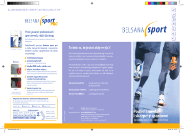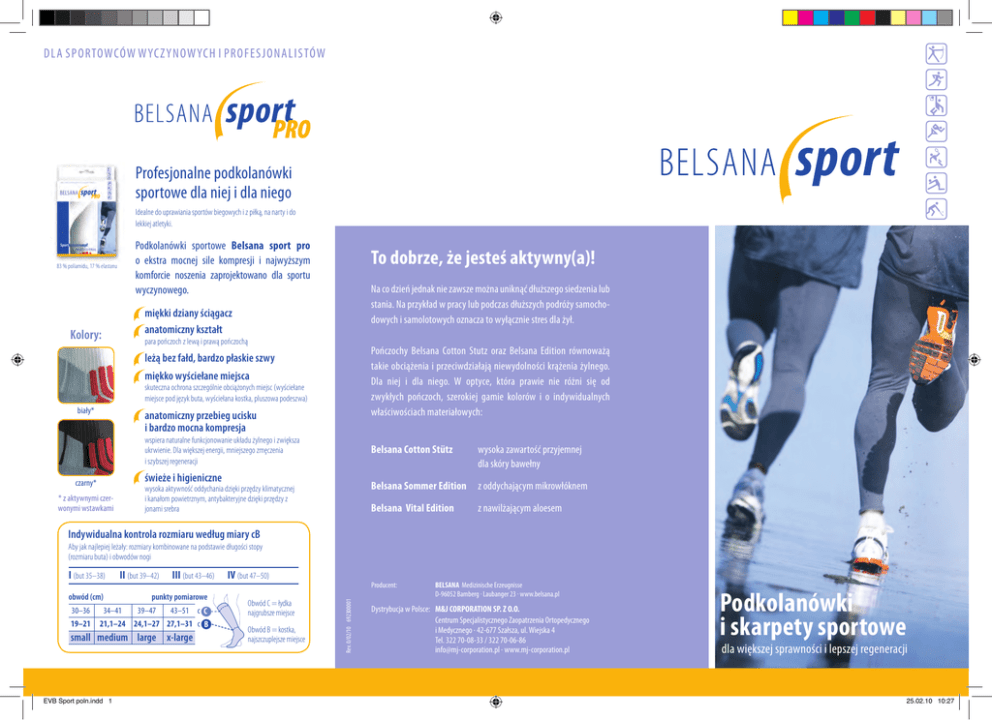 DLA SPORTOWCÓW WYCZ YNOWYCH I PROFESJONALISTÓW Profesjonalne podkolanówki sportowe dla niej i dla niego Idealne do uprawiania sportów biegowych i z piłką, na narty i do lekkiej atletyki. 83 % poliamidu, 17 % elastanu Kolory: Podkolanówki sportowe Belsana sport pro o ekstra mocnej sile kompresji i najwyższym komforcie noszenia zaprojektowano dla sportu wyczynowego. To dobrze, że jesteś aktywny(a)! Na co dzień jednak nie zawsze można uniknąć dłuższego siedzenia lub stania. Na przykład w pracy lub podczas dłuższych podróży samochodowych i samolotowych oznacza to wyłącznie stres dla żył. miękki dziany ściągacz anatomiczny kształt para pończoch z lewą i prawą pończochą Pończochy Belsana Cotton Stutz oraz Belsana Edition równoważą takie obciążenia i przeciwdziałają niewydolności krążenia żylnego. Dla niej i dla niego. W optyce, która prawie nie różni się od zwykłych pończoch, szerokiej gamie kolorów i o indywidualnych właściwościach materiałowych: leżą bez fałd, bardzo płaskie szwy miękko wyściełane miejsca skuteczna ochrona szczególnie obciążonych miejsc (wyściełane miejsce pod język buta, wyściełana kostka, pluszowa podeszwa) biały* anatomiczny przebieg ucisku i bardzo mocna kompresja wspiera naturalne funkcjonowanie układu żylnego i zwiększa czarny* * z aktywnymi czerwonymi wstawkami ukrwienie. Dla większej energii, mniejszego zmęczenia i szybszej regeneracji Belsana Cotton Stütz świeże i higieniczne wysoka aktywność oddychania dzięki przędzy klimatycznej Belsana Sommer Edition z oddychającym mikrowłóknem i kanałom powietrznym, antybakteryjne dzięki przędzy z jonami srebra Belsana Vital Edition wysoka zawartość przyjemnej dla skóry bawełny z nawilżającym aloesem Indywidualna kontrola rozmiaru według miary cB Aby jak najlepiej leżały: rozmiary kombinowane na podstawie długości stopy (rozmiaru buta) i obwodów nogi obwód (cm) II (but 39–42) III (but 43–46) punkty pomiarowe 30–36 34–41 39–47 43–51 c C 19–21 21,1–24 24,1–27 27,1–31 c B small medium large x-large EVB Sport poln.indd 1 IV (but 47–50) Obwód C = łydka najgrubsze miejsce Obwód B = kostka, najszczuplejsze miejsce Rev. 0/02/10 692300001 I (but 35–38) Producent: BELSANA Medizinische Erzeugnisse D-96052 Bamberg . Laubanger 23 . www.belsana.pl Dystrybucja w Polsce: M&J CORPORATION SP. Z O.O. Centrum Specjalistycznego Zaopatrzenia Ortopedycznego i Medycznego . 42-677 Szałsza, ul. Wiejska 4 Tel. 322 70-08-33 / 322 70-06-86 [email protected] . www.mj-corporation.pl Podkolanówki i skarpety sportowe dla większej sprawności i lepszej regeneracji 25.02.10 10:27 Trzy aktualne kolory: Załóż i wystartuj z pełną energią Podkolanówki i skarpety sportowe Belsana biały popielaty/ popielaty-melanż czarny/czarny-melanż Rozmiary BELSANA sport – podkolanówki BELSANA sport – skarpety (58 % poliamidu, 29 % polipropylenu, 13 % elastanu) (70 % poliamidu, 20 % polipropylenu, 10 % elastanu) sport o aktywnej sile kompresji wspomagają I rozmiar buta 36–38 II rozmiar buta 39–41 III rozmiar buta 42–44 IV rozmiar buta 45–47 naturalne funkcjonowanie układu żylnego i sprzyjają odprowadzaniu krwi do serca. Wzmożone ukrwienie sprzyja lepszemu zaopatrzeniu mięśni i tkanek w tlen i substancje odżywcze. Pobudzona przemiana materii powoduje też łatwiejsze odprowadzanie substancji zalegających i produktów miękki dziany ściągacz przemiany materii. przyjemnie trzyma, bezuciskowy Efekt: poprawia się wytrzymałość, maleje aktywne działanie kompresyjne zmęczenie, a mięśnie szybciej się regenerują. Przeciwdziała to bólowi mięśniowemu, a sprawność odczuwalnie rośnie. Dla niej i dla niego. Jako sportowe skarpety lub podkolanówki. EVB Sport poln.indd 2 wspomaga naturalne funkcjonowanie układu żylnego, sprzyja lepszemu ukrwieniu – dla większej sprawności i lepszej regeneracji leżą bez fałd co zapobiega tarciu i tworzeniu się bąbli mocno trzymają co zmniejsza niebezpieczeństwo obrażeń świeże i higieniczne Włókno funkcyjne z polipropylenu zapewnia suchy klimat stopy. Dodatek chlorku srebra działa przeciwbakteryjnie, redukując nieprzyjemny zapach. pluszowa podeszwa amortyzuje, chroniąc stopę i kostkę 25.02.10 10:27