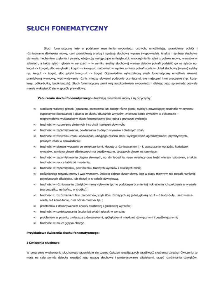 SŁUCH FONEMATYCZNY Słuch fonematyczny leŜy u podstawy rozumienia wypowiedzi ustnych, umoŜliwiając prawidłowy odbiór i róŜnicowanie dźwięków mowy, czyli prawidłową analizę i syntezę słuchową wyrazu (wypowiedzi). Analiza i synteza słuchowa stanowią mechanizm czytania i pisania, obejmują następujące umiejętności: wyodrębnianie zdań z potoku mowy, wyrazów w zdaniach, a takŜe sylab i głosek w wyrazach – w wyniku analizy słuchowej wyrazu dziecko potrafi podzielić go na sylaby np. kogut -> ko-gut, albo na głoski : kogut -> k-o-g-u-t, natomiast w wyniku syntezy potrafi scalić w układ słuchowy (wyraz) sylaby np. ko-gut -> kogut, albo głoski k-o-g-u-t -> kogut. Odpowiednio wykształcony słuch fonematyczny umoŜliwia równieŜ prawidłową wymowę, wychwytywanie róŜnic między słowami podobnie brzmiącymi, ale mającymi inne znaczenie (np. kosykozy, półka-bułka, bucik-budzik). Słuch fonematyczny pełni rolę autokontrolera wypowiedzi i dlatego jego sprawność pozwala mowie wykształcić się w sposób prawidłowy. Zaburzenia słuchu fonematycznego utrudniają rozumienie mowy i są przyczyną: • wadliwej realizacji głosek (opuszcza, przestawia lub dodaje róŜne głoski, sylaby), powodującej trudności w czytaniu (uporczywe literowanie) i pisaniu ze słuchu dłuŜszych wyrazów, zniekształcanie wyrazów w dyktandzie – nieprawidłowo wykształcony słuch fonematyczny jest jedna z przyczyn dysleksji; • trudności w rozumieniu złoŜonych instrukcji i poleceń słownych; • trudności w zapamiętywaniu, powtarzaniu trudnych wyrazów i dłuŜszych zdań; • trudności w tworzeniu zdań i opowiadań, ubogiego zasobu słów, występowania agramatyzmów, prymitywnych, prostych zdań w opowiadaniu; • trudności w pisowni wyrazów ze zmiękczeniami, kłopoty z róŜnicowaniem j - i, opuszczanie wyrazów, końcówek wyrazów, zamiana głosek dźwięcznych na bezdźwięczne, syczących głosek na szumiące; • trudności w zapamiętywaniu ciągów słownych, np. dni tygodnia, nazw miesięcy oraz treści wierszy i piosenek, a takŜe trudności w nauce tabliczki mnoŜenia; • trudności w zapamiętaniu, powtórzeniu trudnych wyrazów i dłuŜszych zdań; • opóźnionego rozwoju mowy i wad wymowy. Dziecko dobrze słyszy słowa, lecz w ciągu mownym nie potrafi rozróŜnić pojedynczych dźwięków, lub złoŜyć je w całość dźwiękową. • trudności w róŜnicowaniu dźwięków mowy (głównie tych o podobnym brzmieniu) i określeniu ich połoŜenia w wyrazie (na początku, na końcu, w środku); • trudności z rozróŜnianiem tzw. paronimów, czyli słów róŜniących się jedną głoską np. t – d budy-buty, sz-Ŝ wieszawieŜa, k-t konie-tonie, n-m nóŜka-muszka itp. ; • problemów z dokonywaniem analizy sylabowej i głoskowej wyrazów; • trudności w syntetyzowaniu (scalaniu) sylab i głosek w wyrazie; • problemów w pisaniu, zwłaszcza z dwuznakami, spółgłoskami miękkimi, dźwięcznymi i bezdźwięcznymi; • trudności w nauce języka obcego Przykładowe ćwiczenia słuchu fonematycznego: I Ćwiczenia słuchowe W programie wychowania słuchowego przewiduje się szereg ćwiczeń rozwijających wraŜliwość słuchową dziecka. Ćwiczenia te mają na celu pomóc dziecku rozwijać jego uwagę słuchową i zainteresowanie dźwiękami, uczyć rozróŜniania dźwięków, reagowania na usłyszane dźwięki i lokalizować ich źródło, a takŜe rozróŜniać natęŜenie, wysokość, czas trwania oraz ilość dźwięków. Rozpoznawanie głosów zwierząt zarejestrowanych na taśmie magnetofonowej. Najpierw będą to głosy zwierząt najbardziej znanych: psa, kota, krowy, kury, koguta, kaczki, gęsi, konia, kurcząt, świni, Ŝaby, gołębia; potem głosy zwierząt, z którymi dzieci stykają się rzadziej, np.: kozy, osła, lwa, mewy, wrony, wróbla, bociana itp.; Młodych miłośników motoryzacji sprawdzić moŜemy przy rozpoznawaniu odgłosów charakterystycznych dla pojazdów: samochodu, traktora, pociągu, motocykla, tramwaju, wozu straŜy poŜarnej, karetki pogotowia, statku, roweru, wrotek, deskorolki, itp.; Dość trudnym, wymagającym duŜego skupienia, jest zadanie odgadnięcia odgłosów docierających zza przysłony (parawanu), albo z sąsiedniego pomieszczenia. MoŜe to być np.: odgłos przelewania wody, rozdzierania papieru, telefonu, przesuwania krzesła, upadku piłki, gwizdu czajnika, brzęku kluczy, itd.; Po powrocie z wycieczki np. do lasu dzieci opowiadają swoje wraŜenia biorąc za podstawę tylko dźwięki, jakie tam słyszały: szelest liści, wycie wiatru, skrzypienie drzew, śpiew ptaków, stukanie dzięcioła, szum strumyka, odgłos przejeŜdŜającego wozu itp.; Zabawa słuchowa, której przebieg związany jest z pytaniem, które ze znanych przedmiotów, wydają takie dźwięki? syczą: czajnik, balonik, z którego spuszczamy powietrze, dzwonią: telefon, budzik, dzwonek u drzwi, dzwonki w kościele, dzwony na dzwonnicy, dzwonek w szkole, itp., warczą: odkurzacz, froterka, kosiarka, tykają: zegar, szumią: wiatr, potok, fale morskie, gwiŜdŜą: czajnik, gwizdek trenera, gwizd lokomotywy, itd.; Do uwaŜnego wsłuchania się w mowę i starannej artykulacji zmusza mówienie szeptem przez tubę (rolka po papierze toaletowym lub ręcznikach jednorazowych), a takŜe wysłuchanie własnej wypowiedzi nagranej uprzednio na taśmę magnetofonową; Udzielanie przez dzieci odpowiedzi na pytanie: co słyszysz? Dziecko z zamkniętymi oczami wsłuchuje się w ciszę Ŝadne dźwięki nie są wytwarzane celowo. Po krótkim czasie wsłuchiwania się określają, co słyszy: stukot butów o bruk, skrzypnięcie drzwi, szczekanie psa, odgłos samochodów, ptaków, rozmowy ludzi itp.; II Ćwiczenia rytmiczne: • Ćwiczenia w rozpoznawaniu melodii piosenek po zaśpiewanym fragmencie (lub z kasety) i wyklaskaniu rytmów piosenek; • Słuchowa analiza podanego rytmu i ruchowe jego odtwarzanie poprzez wyklaskiwanie, wystuk