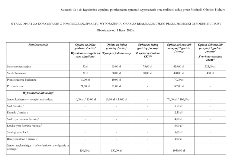 Załącznik Nr 1 do Regulaminu wynajmu pomieszczeń, sprzętu i wyposażenia oraz realizacji usług przez Mosiński Ośrodek Kultury WYKAZ OPŁAT ZA KORZYSTANIE Z POMIESZCZEŃ, SPRZĘTU, WYPOSAŻENIA ORAZ ZA REALIZACJĘ USŁUG PRZEZ MOSIŃSKI OŚRODEK KULTURY Obowiązuje od 1 lipca 2015 r. Pomieszczenia Opłata za jedną godzinę /netto/ Opłata za jedną godzinę /netto/ Wynajem na zajęcia na Wynajem jednorazowy czas określony¹ Opłata za jedną godzinę /netto/ Z wykorzystaniem SKiW² Opłata dobowa lub powyżej 7 godzin /netto/ Opłata dobowa lub powyżej 7 godzin /netto/ Z wykorzystaniem SKiW² Sala reprezentacyjna 32zł 65,00 zł 75,00 zł 455,00 zł 525,00 zł Sala kolumnowa 32zł 60,00 zł 70,00 zł 420,00 zł 490 zł Pomieszczenie kuchenne 10,00 zł 10,00 zł - 70,00 zł - Pozostałe sale 21,00 zł 21,00 zł - 147,00 zł - 10,00 zł / 15,00 zł 10,00 zł / 15,00 zł - 70,00 zł / 100,00 zł - Stół /sztuka / - - - 3,50 zł³ - Krzesło /sztuka / - - - 2,50 zł³ - Stół typu Bawaria /sztuka/ - - - 4,00 zł³ - Ławka typu Bawaria /sztuka/ - - - 3,00 zł³ - Sztalugi /sztuka / - - - 5,00 zł³ - Ramy oszklone / sztuka / - - - 4,00 zł³ - 150,00 zł 150,00 zł - 1050,00 zł - Wyposażenie lub usługi Sprzęt kuchenny – komplet mały/duży Sprzęt nagłaśniający i oświetleniowy /wyłącznie z obsługą/ Sprzęt nagłaśniający lub oświetleniowy /wyłącznie z obsługą/ Sprzęt multimedialny /wyłącznie z obsługą/ Gospodarz obiektu – opłata obowiązkowa przy wynajmie pomieszczeń poza regulaminowymi godzinami urzędowania Ośrodka Pozostałe Stały wynajem powierzchni pomieszczeń – umowa minimum na okres 1 miesiąca Usługi reklamowe - umowa minimum na okres 1 miesiąca 110,00 zł 110,00 zł - 770,00 zł - 150,00 zł 150,00 zł - 1050,00 zł - 280,00 zł - 40,00 zł w skali miesiąca 16,00 zł/m² 40,00 zł/m² powierzchni reklamy ¹ - dotyczy opłaty za wynajem sal na zajęcia cykliczne, prowadzone przez instruktorów z dziedziny kultury i kultury fizycznej ² - dotyczy opłaty z wykorzystaniem Systemu Wentylacji i Klimatyzacji – opłata obowiązkowa w przypadku wynajmu pomieszczeń na uroczystości i spotkania z udziałem powyżej 40 osób ³ - opłata stosowana w przypadku wynajmu poza teren Ośrodka Uwaga: Osoby, które zwracają się o wynajem pomieszczeń, sprzętu i wyposażenia lub o realizację usługi proszone są o zapoznanie się z Regulaminem wynajmu pomieszczeń, sprzętu i wyposażenia oraz realizacji usług przez Mosiński Ośrodek Kultury. Regulamin dostępny jest w pomieszczeniu nr 31, na stronie internetowej Ośrodka – www.kultura.gmina.pl oraz bip Gminy Mosina – www.mosina.pl