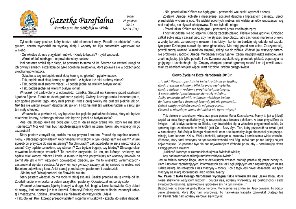 Gazetka Parafialna Parafia p.w. św. Mikołaja w Wielu Wiele 26 grudnia 2010 r. Nr 31 (31) Żył sobie stary pasterz, który bardzo lubił ciemności nocy. Potrafił on objaśniać ruchy gwiazd, często wychodził na wysoką skałę i wsparty na kiju pasterskim wpatrywał się w niebo. - On wkrótce do nas przyjdzie! - mówił. - Kiedy to będzie? - pytał wnuczek. - Wkrótce! Już niedługo! - odpowiadał stary pasterz. Inni pasterze śmiali się z niego, że powtarza to samo od lat. Starzec nie zwracał uwagi na ich drwiny i śmiech. Przeraziła go tylko odrobina zwątpienia, która pojawiła się w oczach jego ukochanego wnuczka. - Dziadku, a czy on będzie miał złotą koronę na głowie? - pytał wnuczek. - Tak, będzie miał złotą koronę na głowie! - A będzie też miał srebrny miecz? - Tak, będzie miał srebrny miecz! - I będzie jechał na wielkim białym koniu? - Tak, będzie jechał na wielkim białym koniu! Wnuczek był zadowolony z odpowiedzi dziadka. Siedział na kamieniu przed szałasem i grał na fujarce. Z dnia na dzień grał coraz piękniej. Ćwiczył każdego ranka i wieczora po to, aby godnie powitać tego, który miał przyjść. Nikt z całej okolicy nie grał tak pięknie jak on. Nikt też nie wierzył słowom dziadka tak, jak on. I nikt nie miał tak wielkiej nadziei w sercu, jak ten mały chłopiec. - Wnuczusiu, a powiedz mi, czy będziesz tak pięknie grał także dla króla, który nie będzie miał złotej korony, srebrnego miecza i nie będzie jechał na białym koniu? -Nie, dla takiego króla nie będę grał! Cóż mi da za moje granie król, który nie ma złota i pieniędzy? Mój król musi być najpotężniejszym królem na ziemi, takim, aby wszyscy mi go zazdrościli! Stary pasterz zamyślił się, zrobiło mu się przykro i smutno. Poczuł się zupełnie osamotniony. - Dlaczego opowiadałem ukochanemu wnuczkowi o tym, czego sam nie wiem? W jaki sposób on przyjdzie do nas na ziemię? Na chmurach? Jak przedostanie się z wieczności do czasu? Czy będzie dzieckiem, czy starcem? Czy będzie bogaty, czy biedny? Dlaczego okłamywałem kochanego wnuczka? To przecież oczywiste, że ten, na którego czekamy, nie będzie miał korony, miecza i konia, a mimo to będzie potężniejszy niż wszyscy królowie na ziemi! Ale jak o tym wszystkim opowiedzieć dziecku, jak mu to wszystko wytłumaczyć? zastanawiał się stary pasterz. Aż pewnej nocy gwiazdy zaczęły jaśniej świecić na niebie, nad Betlejem pojawiła się łuna. Anioł stanął przed starym pasterzem i powiedział: -Nie bój się! Dzisiaj narodził się Zbawiciel świata! Stary pasterz wiedział, co ma robić w takiej sytuacji. Czekał przecież na tę chwilę od lat. Zbudził najpierw wnuczka, a potem wszystkich pasterzy. Opowiedział im, co się stało. Wnuczek zabrał swoją fujarkę i ruszyli w drogę. Szli, biegli w kierunku światła. Gdy dotarli do szopy, inni pasterze już tam klęczeli. Zobaczyli Dziecię złożone w żłobie, zobaczyli kobietę i mężczyznę. Kobieta uśmiechała się nieśmiało do wszystkich. Uklękli. - Tak, oto jest Król, którego przepowiadałem mojemu wnuczkowi! - szeptał do siebie dziadek. - Nie, przed takim Królem nie będę grał! - powiedział wnuczek i wyszedł z szopy. Zostawił Dziecię, kobietę i mężczyznę, zostawił dziadka i klęczących pasterzy. Szedł przed siebie w ciemną noc. Nie widział otwartych niebios, nie widział aniołów unoszących się nad stajenką, nie słyszał ich śpiewów. To nie było dla niego. - Przed takim Królem nie będę grał! - powtarzał przez zaciśnięte zęby. I gdy tak oddalał się od stajenki, Dziecię zaczęło płakać. Płakało coraz głośniej. Chłopiec zatkał sobie uszy i zaczął biec, aby nie słyszeć tego płaczu, aby zachować marzenia o królu w złotej koronie, ze srebrnym mieczem i na białym koniu. Im bardziej się oddalał od szopki, tym płacz Dziecięcia stawał się coraz głośniejszy. Nie mógł przed nim uciec. Zatrzymał się, powoli zaczął wracać. Wszedł do stajenki, zbliżył się do żłóbka. Widział, jak wszyscy daremnie próbowali uspokoić Dziecię. Wyciągnął swoją fujarkę i zagrał najpiękniejszą melodię, jaką znał i najlepiej, jak tylko potrafił. I oto Dziecina uspokoiła się, przestała płakać, popatrzyła na grającego i uśmiechnęła się. Grający chłopiec poczuł ogromną radość i w tej chwili zrozumiał, że uśmiech ten jest więcej wart niż złoto i srebro całego świata. Słowo Życia na Boże Narodzenie 2010 r. ...to taki Wieczór, gdy jaśniej świeci rodzinna gwiazdka, Kiedy życzenia składamy bliskim przez biel opłatka. Kiedy z daleka w rodzinne progi dzieci przybiegną, A serca miłość i przebaczenie zlewa się w jedno. Jakby amnestia zakwitła w blasku wielkiego święta, By innym smutku z doznanej krzywdy już nie pamiętać... Dzieci całują rodziców twarde od pracy ręce... Czemuż w niejednym domu dni takich nie bywa więcej? Tak pięknie o dzisiejszym wieczorze pisze poetka Maria Kozaczkowa. Mamy to już w jakiejś części za sobą kiedy spotkaliśmy się w rodzinach przy łamaniu opłatkiem. A teraz przyszliśmy do świątyni – jak kiedyś pasterze do żłóbka, aby dowiedzieć się, a właściwie przypomnieć sobie, że sprawcą tego „zamieszania w świecie” jest On – Boży Syn. Ten, który przyszedł na świat i jest w nim obecny. Zaś Święta Bożego Narodzenia nam o tej tajemnicy Jego obecności tylko przypominają. Nam ludziom XXI w. Wieku techniki, zabiegania, zakupów i pomieszania wielu wartości. W chaos, który sami tworzymy na tym świecie wchodzi dziś Bóg i mówi nam po raz kolejny co jest najważniejsze. Co powinno być dla nas najważniejsze! Wchodzi po to, aby – parafrazując słowa z księgi proroka Izajasza: „ludzkość krocząca w ciemnościach ujrzała światłość wielką; Aby nad mieszkańcami kraju mroków zabłysło światło.” Jest to światło samego Boga, które w dzisiejsz