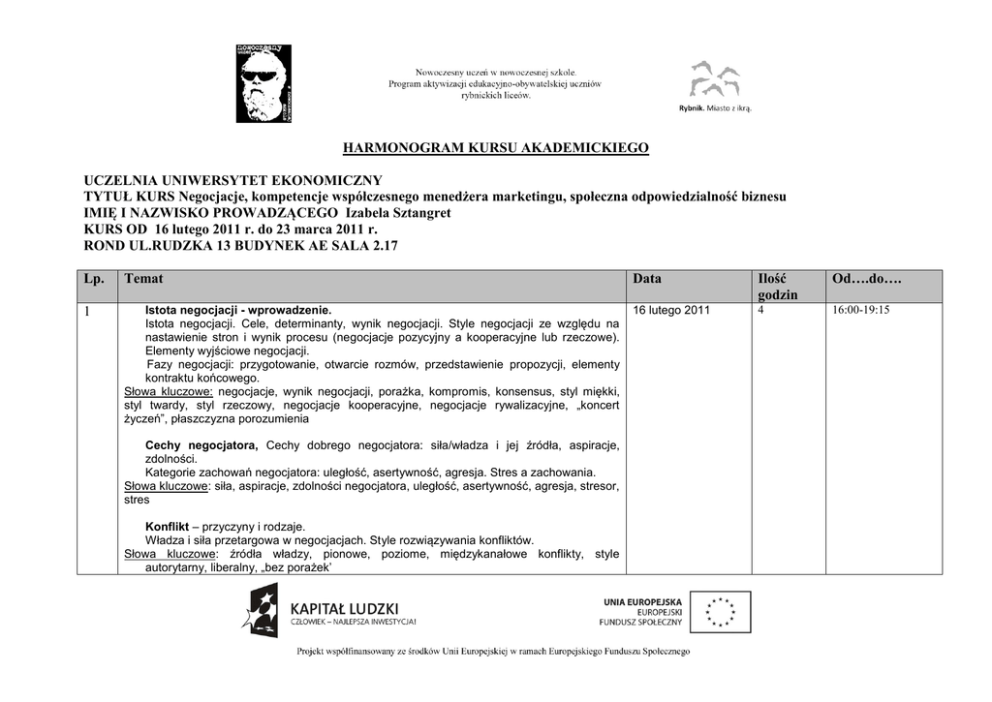 HARMONOGRAM KURSU AKADEMICKIEGO UCZELNIA UNIWERSYTET EKONOMICZNY TYTUŁ KURS Negocjacje, kompetencje współczesnego menedżera marketingu, społeczna odpowiedzialność biznesu IMIĘ I NAZWISKO PROWADZĄCEGO Izabela Sztangret KURS OD 16 lutego 2011 r. do 23 marca 2011 r. ROND UL.RUDZKA 13 BUDYNEK AE SALA 2.17 Lp. Temat Data Ilość godzin Od….do…. 1 Istota negocjacji - wprowadzenie. Istota negocjacji. Cele, determinanty, wynik negocjacji. Style negocjacji ze względu na nastawienie stron i wynik procesu (negocjacje pozycyjny a kooperacyjne lub rzeczowe). Elementy wyjściowe negocjacji. Fazy negocjacji: przygotowanie, otwarcie rozmów, przedstawienie propozycji, elementy kontraktu końcowego. Słowa kluczowe: negocjacje, wynik negocjacji, porażka, kompromis, konsensus, styl miękki, styl twardy, styl rzeczowy, negocjacje kooperacyjne, negocjacje rywalizacyjne, „koncert życzeń”, płaszczyzna porozumienia 16 lutego 2011 4 16:00-19:15 Cechy negocjatora, Cechy dobrego negocjatora: siła/władza i jej źródła, aspiracje, zdolności. Kategorie zachowań negocjatora: uległość, asertywność, agresja. Stres a zachowania. Słowa kluczowe: siła, aspiracje, zdolności negocjatora, uległość, asertywność, agresja, stresor, stres Konflikt – przyczyny i rodzaje. Władza i siła przetargowa w negocjacjach. Style rozwiązywania konfliktów. Słowa kluczowe: źródła władzy, pionowe, poziome, międzykanałowe konflikty, style autorytarny, liberalny, „bez porażek’ 2 3 Techniki negocjacji Techniki negocjacji: kształtowanie sytuacji, sterowanie przebiegiem negocjacji, prezentacja, manipulacja psychologiczna. Trudne sytuacje negocjacyjne. Taktyki rozwiązywania sytuacji trudnych. Technika BATNA. Trudny klient/partner. Techniki nawiązywania i utrzymywania harmonijnego kontaktu z rozmówcą. Sztuka ustępowania. Postawa wobec obiekcji. Techniki zdobywania sympatii Słowa kluczowe: techniki kształtowania sytuacji, techniki sterowania przebiegiem negocjacji, techniki manipulacji psychologicznej, taktyki rozwiązywania sytuacji trudnych, BATNA, techniki nawiązywania i utrzymywania harmonijnego kontaktu z rozmówcą, słowa czynnościowe, system reprezentacji wizualnej, słuchowej, kinestetycznej, techniki zdobywania sympatii, ustępowanie, obiekcje, rola taktyczna. Zespół negocjacyjny. Predyspozycje i role, taktyczne i merytoryczne. Słowa kluczowe: lider, protokolant, słuchacz, krytyk, kontroler Warunki i sposoby skutecznej komunikacji. Podmioty procesu komunikacji i negocjacji. Warunki i sposoby skutecznej komunikacji. Elementy procesu: źródło, przekaz, kanał, odbiorca, sprzężenie zwrotne. Mówienie i jego uwarunkowania. Technika zadawania pytań i argumentacji. Słuchanie a słyszenie. Aktywne słuchanie i jego taktyki. Słowa kluczowe: komunikacja, proces komunikacji, źródło, przekaz, kanał, odbiorca, sprzężenie zwrotne, struktura argumentu, pytania otwarte i zamknięte, argumentacja racjonalna i emocjonalna, argumentacja zwężająca i rozszerzająca, argumentacja jednostronna i dwustronna, słuchanie a słyszenie, taktyki aktywnego słuchania, skupianie, podążanie, parafrazowanie Elementy niewerbalnych aktów komunikacji, Elementy niewerbalnych aktów komunikacji: gestykulacja, mimika, dotyk i kontakt fizyczny, spojrzenie, dystans fizyczny, pozycja ciała, wygląd i ubiór, dźwięki paralingwinistyczne, jakość wypowiedzi, elementy środowiska. Rola komunikacji niewerbalnej w negocjacjach. Słowa kluczowe: gestykulacja, mimika, dotyk i kontakt fizyczny, spojrzenie, dystans fizyczny, 23 lutego 2011 4 16:00-19:15 2 marca 2011 4 16:00-19:15 pozycja ciała, wygląd i ubiór, dźwięki paralingwinistyczne, jakość wypowiedzi, elementy środowiska. Rola komunikacji niewerbalnej w negocjacjach. 4 5 6 Metody inwentyczne (heurystyczne) w negocjacjach Metody inwentyczne (heurystyczne) w negocjacjach: burza mózgów, technika 635, Phillips 66, synektyka Gordona, technika morfologiczna. Słowa kluczowe: metody heurystyczne, metody inwentyczne, techniki oparte na swobodnych skojarzeniach, oparte na skojarzeniach wymuszonych, o charakterze analitycznym, burza mózgów, technika 635, Phillips 66, synektyka Gordona, technika morfologiczna. Negocjacje transakcji globalnej. Uwarunkowania kulturowe negocjacji na przykładach Rynek, jego podmioty i relacje. Elementy analizy ilościowej i jakościowej rynku na potrzeby budowy siły przetargowej negocjatora Słowa kluczowe: rynek, rynek w ujęciu ogólnym, rynek w ujęciu marketingowym, podmioty rynku, otoczenie ogólne i celowe, ilościowa charakterystyka rynku, jakościowa charakterystyka rynku, segmentacja Negocjacje jako podsystem działań marketingowych. Badania rynkowe i marketingowe jako źródło informacji menedżera/negocjatora. Słowa kluczowe: marketing, marketing globalny, strategie marketingowe, narzędzia marketingu, negocjacje a marketing strategiczny i operacyjny, umiejętności menedżera marketingu 9 marca 2011 4 16:00-19:15 16 marca 2011 4 16:00-19:15 Społeczna odpowiedzialność biznesu a wizerunek przedsiębiorstwa i menedżera Słowa kluczowe: marketing społeczny, społeczna odpowiedzialność biznesu, narzędzia marketingu społecznego, kampanie marketingu społecznego, skuteczność kampanii 23 marca 2011 5 16:00-20:00