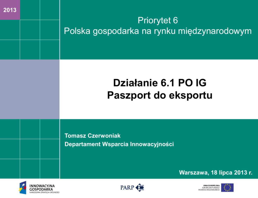 2013 Priorytet 6 Polska gospodarka na rynku międzynarodowym Działanie 6.1 PO IG Paszport do eksportu Tomasz Czerwoniak Departament Wsparcia Innowacyjności Warszawa, 18 lipca 2013 r. Działanie 6.1 Najważniejsze akty prawne, na podstawie których udzielane jest wsparcie w ramach działania 6.1 POIG Rozporządzenie Ministra Rozwoju Regionalnego z dnia 2 kwietnia 2012 r. w sprawie udzielania przez Polską Agencję Rozwoju Przedsiębiorczości pomocy finansowej w ramach Programu Operacyjnego Innowacyjna Gospodarka, 2007 – 2013 (Dz. U. z 2012 r., poz. 438, z późn. zm.); Rozporządzenie Komisji (WE) Nr 1998/2006 z dnia 15 grudnia 2006 r. w sprawie stosowania art. 87 i 88 Traktatu do pomocy de minimis (Dz. Urz. WE L 379 z 28.12.2006, str. 5). Działanie 6.1 Cel działania Celem głównym Programu Operacyjnego Innowacyjna Gospodarka jest rozwój polskiej gospodarki w oparciu o innowacyjne przedsiębiorstwa Działanie 6.1 Paszport do eksportu jest elementem 6. Osi priorytetowej: Polska gospodarka na rynku międzynarodowym Celem działania jest umożliwienie przedsiębiorcom: zwiększenie udziału eksportu w całkowitej sprzedaży, zintensyfikowanie powiązań z zagranicznymi partnerami, zwiększenie rozpoznawalności marek handlowych i firmowych na rynkach zagranicznych. Działanie 6.1 Podmioty uprawnione do ubiegania się o dofinansowanie dofinansowanie mogą ubiegać się mikro, mali lub średni przedsiębiorcy (MSP): prowadzący działalność i posiadający siedzibę na terytorium RP; posiadający w okresie trzech ostatnich lat obrotowych poprzedzających rok, w którym złożyli wniosek o udzielenie wsparcia, średni udział eksportu, rozumiany zarówno jako sprzedaż na Jednolitym Rynku Europejskim, jak również do państw spoza tego rynku, w całkowitej sprzedaży nie większy niż 30%, oraz w żadnym z tych trzech lat obrotowych udział eksportu w całkowitej sprzedaży nie przekraczający 60% oraz posiadający plan rozwoju eksportu sporządzony w wyniku usługi doradczej nie wcześniej niż 12 miesięcy przed dniem złożenia wniosku o udzielenie wsparcia albo którym udzielono wsparcia na przygotowanie planu rozwoju eksportu na podstawie przepisów dotychczasowych, jeżeli plan rozwoju eksportu został pozytywnie zweryfikowany przez RIF; przy czym plan ten może być zaktualizowany w wyniku usługi doradczej nie wcześniej niż 12 miesięcy przed dniem złożenia wniosku o udzielenie wsparcia. O Działanie 6.1 Podmioty uprawnione do ubiegania się o dofinansowanie prowadzący działalność gospodarczą we wszystkich sektorach z wyjątkiem: rybołówstwa i akwakultury, w zakresie produkcji pierwotnej produktów rolnych oraz sektora górnictwa węgla; nie podlegający wykluczeniu z ubiegania się o dofinansowanie na podstawie art. 207 ustawy z dnia 27 sierpnia 2009 r. o finansach publicznych; nie podlegający wykluczeniu z ubiegania się o dofinansowanie na podstawie ustawy z dnia 9 listopada 2000 r. o utworzeniu Polskiej Agencji Rozwoju Przedsiębiorczości. Działanie 6.1 Zasady udzielania dofinansowania Dofinansowanie na wdrożenie Planu rozwoju eksportu może być udzielone jeden raz w okresie realizacji Działania 6.1 Paszport do eksportu Dofinansowanie na wdrożenie Planu rozwoju eksportu stanowi pomoc de minimis i jest udzielane zgodnie z warunkami określonymi w rozporządzeniu Komisji (WE) nr 1998/2006 z dnia 15 grudnia 2006 r. w sprawie stosowania art. 87 i 88 Traktatu do pomocy de minimis Działanie 6.1 Plan Rozwoju Eksportu (PRE) Plan rozwoju eksportu powinien zawierać w szczególności: analizę pozycji konkurencyjnej przedsiębiorstwa pod kątem produktów lub usług przedsiębiorcy, opracowanie dot. wybranych rynków docelowych działalności eksportowej, opracowanie dot. badania wybranych rynków docelowych, opis bieżącej sytuacji przedsiębiorstwa w najważniejszych obszarach funkcjonowania i prognozy rozszerzenia działalności przedsiębiorcy ze szczególnym uwzględnieniem rozwoju poprzez eksport, analizę SWOT dla eksportu każdego rodzaju produktu/usługi na każdym z planowanych rynków docelowych, opis celów i strategii eksportowej, rekomendację rozwoju działalności eksportowej, wskazanie i uzasadnienie wyboru działań do realizacji przez przedsiębiorcę, Działanie 6.1 Plan Rozwoju Eksportu (PRE) Plan rozwoju eksportu powinien zawierać w szczególności: szacowaną wielkość kosztów niezbędnych do sfinansowania działań koniecznych do zrealizowania opracowanej strategii, wstępny harmonogram wdrażania strategii eksportowej, datę sporządzenia PRE przez wykonawcę i/lub datę jego aktualizacji, datę zatwierdzenia PRE przez Wnioskodawcę i/lub datę jego aktualizacji, podpis Wnioskodawcy lub osoby upoważnionej do reprezentowania Wnioskodawcy (pełnomocnika) i wykonawcy, Pieczątkę Wnioskodawcy lub osoby upoważnionej do reprezentowania Wnioskodawcy (pełnomocnika) i wykonawcy oraz pieczątkę firmową Wnioskodawcy i wykonawcy. Weryfikacji podlega czy PRE w sposób kompleksowy określa strategię eksportową do realizacji w kolejnych dwóch latach Działanie 6.1 Kategorie wydatków objętych wsparciem na wdrożenie PRE Wsparcie na wdrożenie planu rozwoju eksportu jest udzielane z przeznaczeniem na realizację co najmniej dwóch z następujących działań, w tym obligatoryjnie co najmniej jednego z działań wskazanych w lit. c. – f.: a. udział w zagranicznych imprezach targowo-wystawienniczych w charakterze wystawcy, b. organizacja i udział w misjach gospodarczych za granicą, c. wyszukiwanie i dobór partnerów na rynkach docelowych, d. uzyskanie niezbędnych dokumentów uprawniających do wprowadzenia produktów lub usług przedsiębiorcy na wybrane rynki docelowe, Działanie 6.1 Kategorie wydatków objętych wsparciem na wdrożenie PRE e. doradztwo w zakresie strategii finansowania przedsięwzięć eksportowych i działalności eksportowej, f. doradztwo w zakresie opracowania koncepcji wizerunku przedsiębiorcy na wybranych rynka