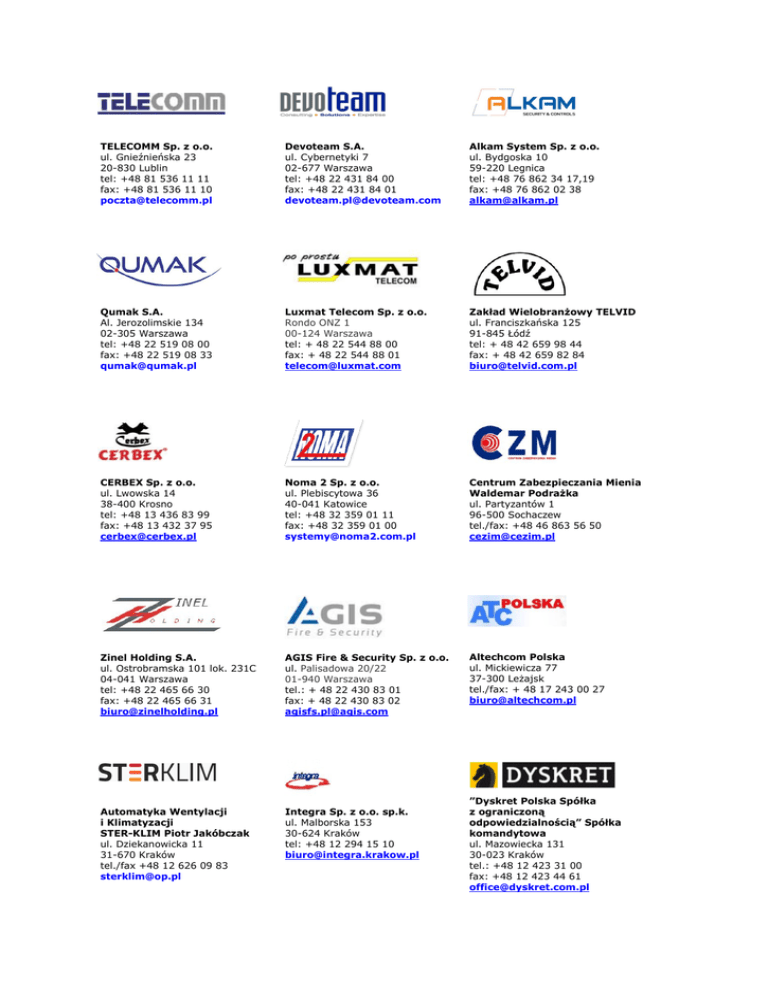 TELECOMM Sp. z o.o. ul. Gnieźnieńska 23 20-830 Lublin tel: +48 81 536 11 11 fax: +48 81 536 11 10 [email protected] Devoteam S.A. ul. Cybernetyki 7 02-677 Warszawa tel: +48 22 431 84 00 fax: +48 22 431 84 01 [email protected] Alkam System Sp. z o.o. ul. Bydgoska 10 59-220 Legnica tel: +48 76 862 34 17,19 fax: +48 76 862 02 38 [email protected] Qumak S.A. Al. Jerozolimskie 134 02-305 Warszawa tel: +48 22 519 08 00 fax: +48 22 519 08 33 [email protected] Luxmat Telecom Sp. z o.o. Rondo ONZ 1 00-124 Warszawa tel: + 48 22 544 88 00 fax: + 48 22 544 88 01 [email protected] Zakład Wielobranżowy TELVID ul. Franciszkańska 125 91-845 Łódź tel: + 48 42 659 98 44 fax: + 48 42 659 82 84 [email protected] CERBEX Sp. z o.o. ul. Lwowska 14 38-400 Krosno tel: +48 13 436 83 99 fax: +48 13 432 37 95 [email protected] Noma 2 Sp. z o.o. ul. Plebiscytowa 36 40-041 Katowice tel: +48 32 359 01 11 fax: +48 32 359 01 00 [email protected] Centrum Zabezpieczania Mienia Waldemar Podrażka ul. Partyzantów 1 96-500 Sochaczew tel./fax: +48 46 863 56 50 [email protected] Zinel Holding S.A. ul. Ostrobramska 101 lok. 231C 04-041 Warszawa tel: +48 22 465 66 30 fax: +48 22 465 66 31 [email protected] AGIS Fire & Security Sp. z o.o. ul. Palisadowa 20/22 01-940 Warszawa tel.: + 48 22 430 83 01 fax: + 48 22 430 83 02 [email protected] Altechcom Polska ul. Mickiewicza 77 37-300 Leżajsk tel./fax: + 48 17 243 00 27 [email protected] Automatyka Wentylacji i Klimatyzacji STER-KLIM Piotr Jakóbczak ul. Dziekanowicka 11 31-670 Kraków tel./fax +48 12 626 09 83 [email protected] Integra Sp. z o.o. sp.k. ul. Malborska 153 30-624 Kraków tel: +48 12 294 15 10 [email protected] ”Dyskret Polska Spółka z ograniczoną odpowiedzialnością” Spółka komandytowa ul. Mazowiecka 131 30-023 Kraków tel.: +48 12 423 31 00 fax: +48 12 423 44 61 [email protected] LTEC Sp. z o.o. ul. Okulickiego 7/9 05-500 Piaseczno tel.: +48 22 392 69 39 fax: +48 22 244 24 80 [email protected] Total Solutions Management Sp. "Mar-Aut" Grzywacz Marcin z o.o. ul. Wyki 8/40 ul. Biedronki 35 01-318 Warszawa 02-959 Warszawa tel.: +48 22 478 20 22 tel: +48 607365855 fax: +48 22 478 20 23 [email protected] [email protected] Automatica Karol Cienciała ul. Wita Stwosza 73/3 25-453 Kielce tel: +48 41 241 24 01 fax: +48 41 362 40 40 [email protected] Zakład Elektroniki „COMPAS” ul. Modlińska 17B 05-110 Jabłonna k. Warszawy tel: +48 22 782 43 15 fax: +48 22 782 40 64 [email protected] Unima 2000 Systemy Teleinformatyczne S.A. ul. Skarżyńskiego 14 31-866 Kraków tel: +48 12 298 05 11 fax: +48 12 298 05 12 [email protected] Przedsiębiorstwo Robót Elektrycznych i Handlu „PREK” Spółka Jawna ul. Żwirowa 2 31-226 Kraków tel: +48 12 632 46 70 fax: +48 12 632 49 22 [email protected] DG Elpro Sp.J. ul. Wadowicka 6 30-415 Kraków tel: +48 12 263 93 85 fax: +48 12 263 93 85 [email protected] Centrum Informatyki „ZETO” S.A. ul. Skorupska 9 15-048 Białystok tel: +48 85 748 32 00 fax: +48 85 748 33 03 [email protected] UNICARD S.A. ul. Łagiewnicka 54 30-417 Kraków tel: +48 12 398 99 00 fax: +48 12 398 99 01 [email protected] Tech4 Sp. z o.o. ul. Modlińska 61 03-199 Warszawa tel: +48 505005607 [email protected] ELNEA Kamil Łysak Szewce, ul. Dewońska 86 26-052 Nowiny tel: +48 502398297 [email protected] Integrity Systems Sp. z o.o. ul. Grzybowska 37A 00-855 Warszawa tel: +48 694426596 [email protected] Signum Project Sp. z o.o. ul. Zawiła 69 30-390 Kraków tel: +48 501675483 grzegorz.augustyn@ signumproject.pl Skynet Polska Sp. z o.o. ul. Trmbity 22B 02-850 Warszawa tel: +48 22 465 55 40 fax: +48 22 465 55 41 [email protected] Oderon Sp. z o.o. ul. Budryka 8 41-200 Sosnowiec tel: +48 881964318 [email protected] CPD System Sp. z o.o. Al. Jana Pawła II 34 00-141 Warszawa tel: +48 22 6547068 [email protected] GEO-KAT Sp. z o.o. ul. Taneczna 7 02-829 Warszawa tel: +48 22 8770880 [email protected] Combo-tech Z. Dusza Marszowice 161A 32-420 Gdów tel: +48 690951618 [email protected] IB Systems Sp. z o.o. ul. Dąbrowskiego 290 60-406 Poznań tel: +48 61 6468500 fax: +48 61 6468501 [email protected]
