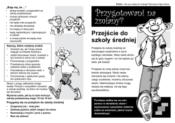 „Boję się, że ...” • • • • • • • stracę kontakt z przyjaciółmi ze szkoły podstawowej; muszę zdobywać nowych przyjaciół; nie będę mieć przyjaciół; nie zdobędę akceptacji; inni będą mi dokuczać; będę najmłodszy/a i najmniejszy/a w szkole; w nowej szkole nie będę znać nauczycieli. Rzeczy, które możesz zrobić • Dowiedz się, jak Twoja szkoła reaguje na kwestie bullying’u. • Jeżeli odczuwasz strach, powiedz o tym komuś w domu lub w szkole. • Porozmawiaj z przyjaciółmi. • Przedyskutuj różne sposoby radzenia sobie z problemem. • Pozostawaj w otoczeniu osób, z którymi dobrze się czujesz. • Porozmawiaj z opiekunem grupy lub opiekunem roku. Stoisz u progu całkowicie innego świata. Pomyśl o wszystkich rzeczach w szkole średniej, na które nie możesz się doczekać. Wyobraź sobie, jak by to było kończyć szkołę podstawową mając 16 lub 18 lat? Przygotuj się na przejście do szkoły średniej • • • • Zorganizuj się – miej plan Zadawaj pytania, jeżeli czegoś nie wiesz Rozmawiaj z innymi i proś o pomoc Baw się dobrze! Polish - Are you ready for change? Moving to high school Przejście do szkoły średniej Przejście do szkoły średniej do ekscytujące wydarzenie w życiu każdego człowieka. Wasz świat obróci się do góry nogami i nic nie będzie już takie, jak kiedyś! Przejście do innej szkoły może być bardzo stresujące. Kiedy nasze otoczenie się zmienia i nie wiemy, czego oczekiwać, możemy odczuwać strach. Nadchodzące zmiany mogą okazać się większe, niż się tego spodziewaliśmy. Poniższa ulotka ma na celu pomoc w określeniu obaw i wyznaczeniu sposobów radzenia sobie ze zmianami, jakich macie doświadczyć. „To zupełnie inny świat...” • Każdego przedmiotu uczy inny nauczyciel. • Po każdej lekcji muszę przejść do innej klasy. • Jestem w innej grupie na każdej lekcji. • Pojawiły się nowe przedmioty, jak chemia, fizyka, język hiszpański i inne. • W szkole znajduje się wiele przyrządów i pracowni, z których nigdy wcześniej nie korzystaliśmy (pracownia naukowa, sala gimnastyczna, itd). • Nauka jest o wiele cięższa niż w szkole podstawowej. • Dostajemy bardzo dużo pracy domowej. Co możesz zrobić? • Zrób listę rzeczy, które wzbudzają Twój niepokój w związku z nauką w szkole średniej. • Zadawaj pytania i staraj się uzyskać jak najwięcej informacji. • W szkole, do której będziesz uczęszczać, poznaj opiekuna grupy i jemu również zadawaj pytania. • Jeżeli nadal odczuwasz strach, porozmawiaj z osobą dorosłą, która będzie mogła Ci pomóc: z nauczycielem, rodzicami, wszystkimi, którzy Cię wysłuchają. „O tylu rzeczach trzeba pamiętać...” • Na każdą lekcję trzeba przynosić tyle różnych rzeczy. Ciągle zapominam o stroju na w-f. • Jeżeli na czas nie oddasz pracy domowej, możesz mieć kłopoty. Przydatne wskazówki • Przygotowuj się, planując wszystko z wyprzedzeniem. • W domu trzymaj kopię planu lekcji, aby nie zapomnieć, co musisz przygotować na następny dzień. • Zapakuj plecak dzień wcześniej. • Opracuj plan prac domowych i trzymaj się go. • Jeżeli o czymś zapomnisz, powiedz nauczycielowi i przeproś. Każdy od czasu do czasu czegoś zapomina. JA KC LE 1 2 3 ka F W- ematy i k t Ma ancus r J. F „Boję się, że się zgubię. Moja szkoła jest OGROMNA, nigdy nie znajdę drogi.” Co możesz zrobić? • Na początku wszystko wydaje się trudne, jednak wkrótce zdziwisz się, jak szybko udało Ci się przyzwyczaić do nowej szkoły. • Czy szkoła zapewnia Ci mapkę? • Zapytaj starszych uczniów o drogę • Trzymaj się w grupie z innymi uczniami i wspólnie odszukajcie drogę. „Boję się drogi do szkoły.” • • • Zaplanuj drogę do szkoły przed rozpoczęciem pierwszego dnia nauki. Na tydzień przed rozpoczęciem roku szkolnego lub nowego semestru sprawdź wyznaczoną trasę. Zaplanuj podróżowanie do szkoły z uczniem, który mieszka blisko Ciebie. „Nie jestem już dzieckiem... Cieszę się z większej niezależności i swobody, ale martwi mnie to:” • jak zmienia się moje ciało; • jak wyglądam; • jak zdobyć sympatię otoczenia; • jak nie zostać odrzuconym, • jak będą układały się moje relacje z chłopakiem/dziewczyną/ przyjaciółmi. Chociaż może Ci się wydawać inaczej, wszyscy przechodzą przez dokładnie to samo i towarzyszą im podobne obawy. • W lokalnym centrum zdrowia lub od nauczyciela (PSHE) możesz otrzymać ulotki informacyjne. • Porozmawiaj o swoich obawach z zaufaną osobą w szkole lub w domu. • Bądź optymistą i myśl o swoich mocnych stronach, nie skupiaj się na słabościach.