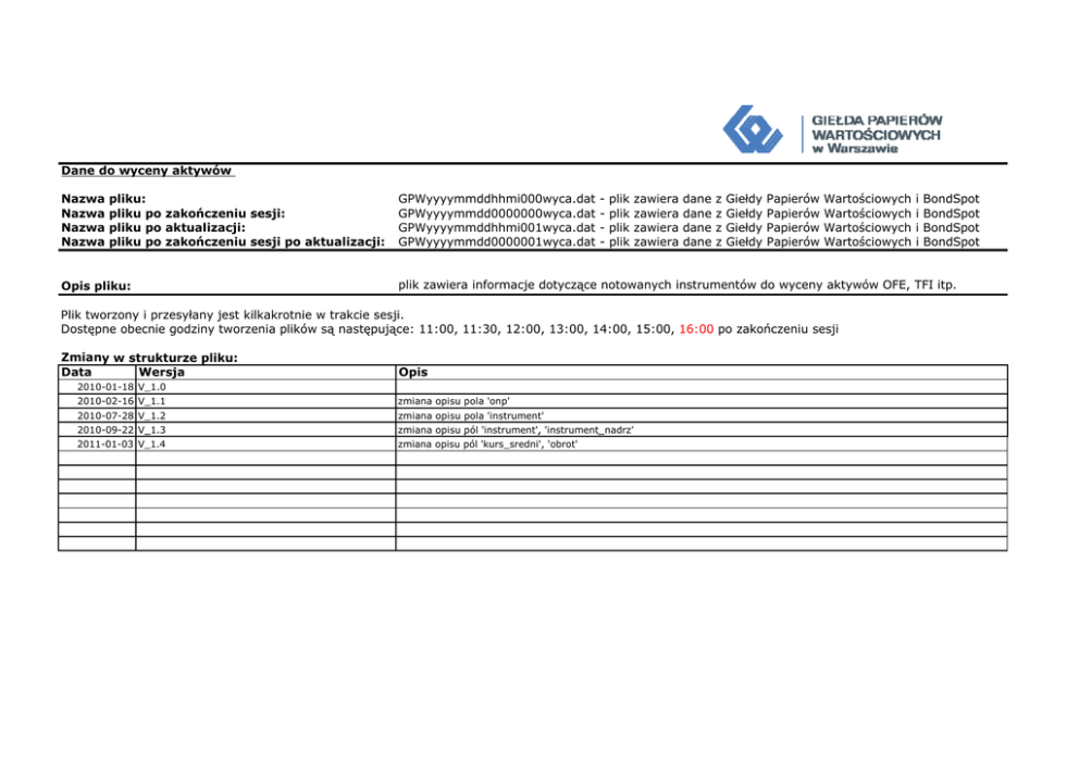 Dane do wyceny aktywów Nazwa Nazwa Nazwa Nazwa pliku: pliku po zakończeniu sesji: pliku po aktualizacji: pliku po zakończeniu sesji po aktualizacji: Opis pliku: GPWyyyymmddhhmi000wyca.dat GPWyyyymmdd0000000wyca.dat GPWyyyymmddhhmi001wyca.dat GPWyyyymmdd0000001wyca.dat - plik plik plik plik zawiera zawiera zawiera zawiera dane dane dane dane z z z z Giełdy Giełdy Giełdy Giełdy Papierów Papierów Papierów Papierów Wartościowych Wartościowych Wartościowych Wartościowych Opis 2010-01-18 V_1.0 2010-02-16 V_1.1 BondSpot BondSpot BondSpot BondSpot plik zawiera informacje dotyczące notowanych instrumentów do wyceny aktywów OFE, TFI itp. Plik tworzony i przesyłany jest kilkakrotnie w trakcie sesji. Dostępne obecnie godziny tworzenia plików są następujące: 11:00, 11:30, 12:00, 13:00, 14:00, 15:00, 16:00 po zakończeniu sesji Zmiany w strukturze pliku: Data Wersja i i i i zmiana opisu pola 'onp' 2010-07-28 V_1.2 zmiana opisu pola 'instrument' _ 2010-09-22 V_1.3 p p _ zmiana opisu pól 'instrument',, 'instrument_nadrz' 2011-01-03 V_1.4 zmiana opisu pól 'kurs_sredni', 'obrot' Dane do wyceny aktywów Wersja 1.4 Lp. Nazwa pola Typ Długość 1 data C 8 2 czas C 6 3 kod_gieldy C 3 Format Opis YYYYMMDD Data sesji, z której pochodzą dane. Data generacji zbioru. Pole zawsze wypełniane. HHMISS Czas, z którego pochodzą dane. Czas generacji zbioru. Pole zawsze wypełniane. 3 Kod giełdy. Pole zawsze wypełniane. Pole może przyjmować następujące wartości: 243 - Giełda Papierów Wartościowych w Warszawie 986 - BondSpot - rynek detaliczny 987 - BondSpot - rynek hurtowy 989 - BondSpot ASO 4 miejsce_obrotu C 1 1 Miejsce obrotu. Pole zawsze wypełniane. Pole może przyjmować następujące wartości: 1 - Główny Rynek GPW 2 - NewConnect 3 - Catalyst 4 - BondSpot 5 isin C 12 6 nazwa C 25 7 instrument_nadrz C 20 12 Kod ISIN instrumentu. Pole zawsze wypełniane. 25 Nazwa instrumentu. Pole zawsze wypełniane. Typ instrumentu nadrzędnego. Pole zawsze wypełniane. Pole może przyjmować 20 następujące wartości: AKCJA - akcja PNE - prawo poboru PDA - prawo do akcji OBL - obligacja LZS - list zastawny CER - certyfikat inwestycyjny WAR - warrant PP - warrant subskrypcyjny PRSTR - produkt strukturyzowany FUT - kontrakt terminowy OPCJA - opcja JIND - jednostka indeksowa IND - indeks ETF - ETF 8 instrument C 20 20 Typ instrumentu. Pole zawsze wypełniane. Pole może przyjmować następujące wartości: AKCJA - akcja PPP - prawo poboru platne PPB - prawo poboru bezplatne Uwagi PDA - prawo do akcji OBL_S - obligacja Skarbu Państwa o stałym oprocentowaniu OBL_Z - obligacja Skarbu Państwa o zmiennym oprocentowaniu OBL_0 - obligacja Skarbu Państwa zerokuponowa OBL_I - obligacja Skarbu Państwa indeksowana OBL_KS - obligacja korporacyjna o stałym oprocentowaniu OBL_KZ - obligacja korporacyjna o zmiennym oprocentowaniu OBL_K0 - obligacja korporacyjna zerokuponowa OBL_KI - obligacja korporacyjna indeksowana OBL_MS - obligacja komunalna o stałym oprocentowaniu OBL_MZ - obligacja komunalna o zmiennym oprocentowaniu OBL_M0 - obligacja komunalna zerokuponowa OBL_MI - obligacja komunalna indeksowana OBL_PS - obligacja spółdzielcza o stałym oprocentowaniu OBL_PZ - obligacja spółdzielcza o zmiennym oprocentowaniu OBL_P0 - obligacja spółdzielcza zerokuponowa OBL_PI - obligacja spółdzielcza indeksowana LZH_HS - list zastawny hipoteczny o stałym oprocentowaniu LZH_HZ - list zastawny hipoteczny o zmiennym oprocentowaniu LZH_PS - list zastawny publiczny o stałym oprocentowaniu LZH_HS - list zastawny publiczny o zmiennym oprocentowaniu WARE - warrant europejski WARA - warrant amerykański CERIND - certyfikat strukturyzowany OBL_KT - obligacja strukturyzowana FUTI - kontrakt terminowy indeksowy FUTW - kontrakt terminowy walutowy FUTA - kontrakt terminowy akcyjny FUTO - kontrakt terminowy obligacyjny OPCEU - opcja europejska indeksowa OPCEUA - opcja europejska indeksowa OPCAM - opcja amerykańska JIND - jednostka indeksowa IND - indeks 9 kurs_otwarcia N 20 10 data_kotwarcia C 8 11 czas_kotwarcia C 6 ETF - ETF Ostatni kurs otwarcia w całej historii notowania instrumentu. Dla instrumentow w notowaniach jednolitych kurs z pierwszego fixingu. Dla instrumentów w notowaniach ciagłych kurs pierwszej transakcji. Pole nie jest wypełniane, jeśli dla instrumentu nie 17.2 został ustalony kurs otwarcia. Data ustalenia ostatniego kursu otwarcia. Pole nie jest wypełniane, jeśli dla instrumentu YYYYMMDD nie został ustalony kurs otwarcia. Czas ustalenia ostatniego kursu otwarcia. Pole nie jest wypełniane, jeśli dla instrumentu HHMISS nie został ustalony kurs otwarcia. Dla indeksów wartość otwarcia. 12 kurs_ostatni N 20 13 data_kostatni C 8 14 czas_kostatni C 6 15 kurs_sredni N 20 16 kurs_zamkniecia N 20 17 data_kzamkniecia C 8 18 typ_zamkniecia C 1 Kurs ostatniej transakcji w całej historii notowania instrumentu. Dla instrumentow w notowaniach jednolitych kurs z pierwszego lub drugiego fixingu. Dla instrumentów w notowaniach ciagłych kurs ustalony na otwarciu, w fazie notowań ciągłych lub w fazie zamknięcia. Pole nie jest wypełniane, jeśli dla instrumentu nie została zawarta żadna 17.2 transakcja. Data ustalenia kursu ostatniej transakcji. Pole nie jest wypełniane, jeśli dla instrumentu YYYYMMDD nie została zawarta żadna transakcja. Czas ustalenia kursu ostatniej transakcji. Pole nie jest wypełniane, jeśli dla instrumentu HHMISS nie została zawarta żadna transakcja. Kurs średni ze wszystkich transakcji zawartych na danej sesji ważony wolumenem tych 17.2 transakcji. Kurs wyliczany jest wg wzoru: suma obrotów/suma wolumenu Ostatni ustalony kurs zamknięcia na sesji. Kursem zamknięcia jest kurs ostatniej transakcji na sesji, w przypadku braku transakcji kursem zamknięcia staje się kurs odniesienia z danej sesji. W przypadku ustalenia kursu nietransakcyjnego pole zawiera kurs nietransakcyjny. Dla kontraktów terminowych pole zawiera dzienny lub ostateczny kurs rozliczeniowy