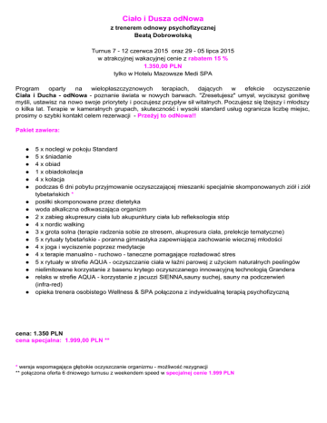 Ciało i Dusza odNowa z trenerem odnowy psychofizycznej Beatą Dobrowolską Turnus 7 12 czerwca 2015 oraz 29 05 lipca 2015 w atrakcyjnej wakacyjnej cenie z rabatem 15 % 1.350,00 PLN tylko w Hotelu Mazowsze Medi SPA Program oparty na wielopłaszczyznowych terapiach, dających w efekcie oczyszczenie Ciała i Ducha odNowa poznanie świata w nowych barwach. "Zresetujesz" umysł, wyciszysz gonitwę myśli, ustawisz na nowo swoje priorytety i poczujesz przypływ sił witalnych. Poczujesz się lżejszy i młodszy o kilka lat. Terapie w kameralnych grupach, skuteczność i wysoki standard usług ogranicza liczbę miejsc, prosimy o szybki kontakt celem rezerwacji Przeżyj to odNowa!! Pakiet zawiera: ● ● ● ● ● ● ● ● ● ● ● ● ● ● ● ● ● ● 5 x noclegi w pokoju Standard 5 x śniadanie 4 x obiad 1 x obiadokolacja 4 x kolacja podczas 6 dni pobytu przyjmowanie oczyszczającej mieszanki specjalnie skomponowanych ziół i ziół tybetańskich * posiłki skomponowane przez dietetyka woda alkaliczna odkwaszająca organizm 2 x zabieg akupresury ciała lub akupunktury ciała lub refleksologia stóp 4 x nordic walking 3 x grota solna (terapie radzenia sobie ze stresem, akupresura ciała, prelekcje tematyczne) 5 x rytuały tybetańskie poranna gimnastyka zapewniająca zachowanie wiecznej młodości 4 x joga i wyciszenie poprzez medytacje 4 x terapie manualno ruchowo taneczne pomagające rozładować stres 5 x rytuały w strefie AQUA oczyszczanie ciała w łaźni parowej z użyciem naturalnych peelingów nielimitowane korzystanie z basenu krytego oczyszczanego innowacyjną technologią Grandera relaks w strefie AQUA korzystanie z jacuzzi SIENNA,sauny suchej, sauny na podczerwień (infrared) opieka trenera osobistego Wellness & SPA połączona z indywidualną terapią psychofizyczną cena: 1.350 PLN cena specjalna: 1.999,00 PLN ** * wersja wspomagająca głębokie oczyszczanie organizmu możliwoś ć rezygnacji ** połączona oferta 6 dniowego turnusu z weekendem speed w specjalnej cenie 1.999 PLN