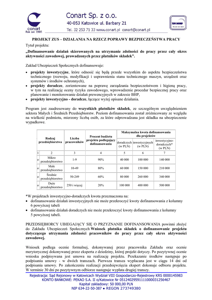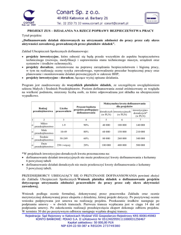 PROJEKT ZUS – DZIAŁANIA NA RZECZ POPRAWY BEZPIECZEŃSTWA PRACY Tytuł projektu: „Dofinansowanie działań skierowanych na utrzymanie zdolności do pracy przez cały okres aktywności zawodowej, prowadzonych przez płatników składek”. Zakład Ubezpieczeń Społecznych dofinansowuje: projekty inwestycyjne, które odnosić się będą przede wszystkim do aspektu bezpieczeństwa technicznego (rozwoju, modyfikacji i usprawnienia stanu technicznego maszyn, urządzeń oraz systemów i środków ochronnych), projekty doradcze, zorientowane na poprawę zarządzania bezpieczeństwem i higieną pracy, w tym na realizację oceny ryzyka zawodowego, wprowadzenie procedur bezpiecznej pracy oraz planowanie i monitorowanie działań prewencyjnych w zakresie BHP, projekty inwestycyjno - doradcze, łączące wyżej opisane działania. Program jest zaadresowany do wszystkich płatników składek, ze szczególnym uwzględnieniem sektora Małych i Średnich Przedsiębiorstw. Poziom dofinansowania został zróżnicowany ze względu na wielkość podmiotu, mierzony liczbą osób, za które odprowadzana jest składka na ubezpieczenie wypadkowe. Rodzaj przedsiębiorstwa 1 2 Mikro o przedsiębiorstwo Maksymalna kwota dofinansowania dla projektów Procent budżetu Liczba projektu podlegający inwestycyjnopracowników doradczych inwestycyjnych dofinansowaniu doradczych* (w PLN) (w PLN) (w PLN) 3 4 5 6 7 1-9 90% 40 000 100 000 140 000 o Małe przedsiębiorstwo 10-49 80% 60 000 150 000 210 000 o Średnie przedsiębiorstwo 50-249 60% 80 000 260 000 340 000 o Duże przedsiębiorstwo 250 i więcej 20% 100 000 400 000 500 000 *W projektach inwestycyjno-doradczych kwota przeznaczona na: dofinansowanie działań inwestycyjnych nie może przekroczyć kwoty dofinansowania z kolumny 6 powyższej tabeli dofinansowanie działań doradczych nie może przekroczyć kwoty dofinansowania z kolumny 5 powyższej tabeli. PRZEDSIĘBIORCY UBIEGAJĄCY SIĘ O PRZYZNANIE DOFINANSOWANIA powinni złożyć do Zakładu Ubezpieczeń Społecznych Wniosek płatnika składek o dofinansowanie projektu dotyczącego utrzymania zdolności pracowników do pracy przez cały okres aktywności zawodowej. Wniosek podlega ocenie formalnej, dokonywanej przez pracownika Zakładu oraz ocenie merytorycznej dokonywanej przez eksperta z dziedziny, której projekt dotyczy. Po pozytywnej ocenie wniosku podpisywana jest umowa na realizację projektu. Przekazanie środków następuje po podpisaniu umowy - w dwóch transzach. Pierwsza transza wypłacana jest w ciągu 14 dni od podpisania umowy. Po zakończeniu realizacji przedsięwzięcia ekspert dokonuje odbioru projektu. W terminie 30 dni po pozytywnym odbiorze następuje wypłata drugiej transzy. Rejestracja: Sąd Rejonowy w Katowicach Wydział VIII Gospodarczo-Rejestrowy KRS 0000145983 KONTO BANKOWE: PEKAO S.A. II o/Katowice Nr 05124029591111000031256467 Kapitał zakładowy: 50 000,00 PLN NIP 634-22-50-387 ● REGON 273749380 I. DZIAŁANIA, NA KTÓRE MOŻNA OTRZYMAĆ DOFINANSOWANIE W PRZYPADKU PROJEKTÓW DORADCZYCH ORAZ INWESTYCYJNO-DORADCZYCH 1. Identyfikacja zagrożeń z tymi zagrożeniami, w miejscu pracy i ocena ryzyka zawodowego związanego 2. Wykonanie pomiarów stężeń i natężeń czynników szkodliwych i uciążliwych, występujących w miejscu pracy, takich jak: o czynniki chemiczne i pyły, o czynniki biologiczne, o czynniki fizyczne (hałas, ogólne i miejscowe drgania, pole i promieniowanie elektromagnetyczne, promieniowanie optyczne, mikroklimat, itp.), o czynniki uciążliwe (oświetlenie, nadmierne obciążenie wysiłkiem fizycznym dynamicznym i/lub statycznym, itp.). Powyższe pomiary mogą być wykonywane wyłącznie jako element innych działań przewidzianych wnioskiem, np. ocena skuteczności działań inwestycyjnych, ocena ryzyka zawodowego, dokonanie doboru środków ochrony indywidualnej, itp., (w przypadku czynników szkodliwych pomiary powinny być wykonywane przez akredytowane laboratoria). 3. Dokonanie doboru środków ochrony indywidualnej do zidentyfikowanych zagrożeń (bez uwzględniania kosztów zakupu tych środków), 4. Przeprowadzenie analizy i oceny ergonomiczności miejsc pracy, które muszą oddziaływać na poprawę ergonomii stanowisk pracy, 5. Wykonanie oceny bezpieczeństwa maszyn i instalacji technicznych, 6. Opracowanie projektów technicznych środków ochrony zbiorowej, 7. Opracowanie projektów technicznych instalacji sprzętu ochronnego na stanowiskach pracy. II. DZIAŁANIA, NA KTÓRE MOŻNA OTRZYMAĆ DOFINANSOWANIE W PRZYPADKU PROJEKTÓW INWESTYCYJNYCH ORAZ INWESTYCYJNO-DORADCZYCH 1. Zakup i instalacja a) osłon do niebezpiecznych stref maszyn i urządzeń (stałych, ruchomych, blokujących i blokujących z urządzeniem ryglującym, sterujących, itp.), b) optoelektrycznych urządzeń ochronnych (kurtyn świetlnych, skanerów laserowych, itp.), c) urządzeń ochronnych czułych na nacisk (mat, podłóg, obrzeży, krawędzi, itp., odnoszących się bezpośrednio do maszyn), d) elementów systemów sterowania realizujących funkcje bezpieczeństwa (oburęcznych urządzeń sterujących, urządzeń blokujących zezwalających, wyłączników krańcowych, urządzeń sterujących krokowych, urządzeń wyłączania awaryjnego, itp., odnoszących się bezpośrednio do maszyn), e) urządzeń i elementów sygnalizacji, ostrzegania i informacji o zagrożeniach, f) obudów, osłon i ekranów chroniących przed promieniowaniem optycznym, hałasem oraz polami elektromagnetycznymi, itp., g) kabin i obudów dźwiękoizolacyjnych, lub dżwiękochłonno-izolacyjnych, tłumików akustycznych oraz materiałów i ustrojów dźwiękochłonnych, h) wyrobów i ustrojów przeciw-drganiowych (wibroizolatorów, amortyzatorów itp.), i) neutralizatorów elektryczności statycznej, j) urządzeń oczyszczających i uzdatniających powietrze (np.: filtrów, filtropochłaniaczy, itp.), Rejestracja: Sąd Rejonowy w Katowicach Wydział VIII Gospodarczo-Rejestrowy KRS 0000145983 KONTO BANKO