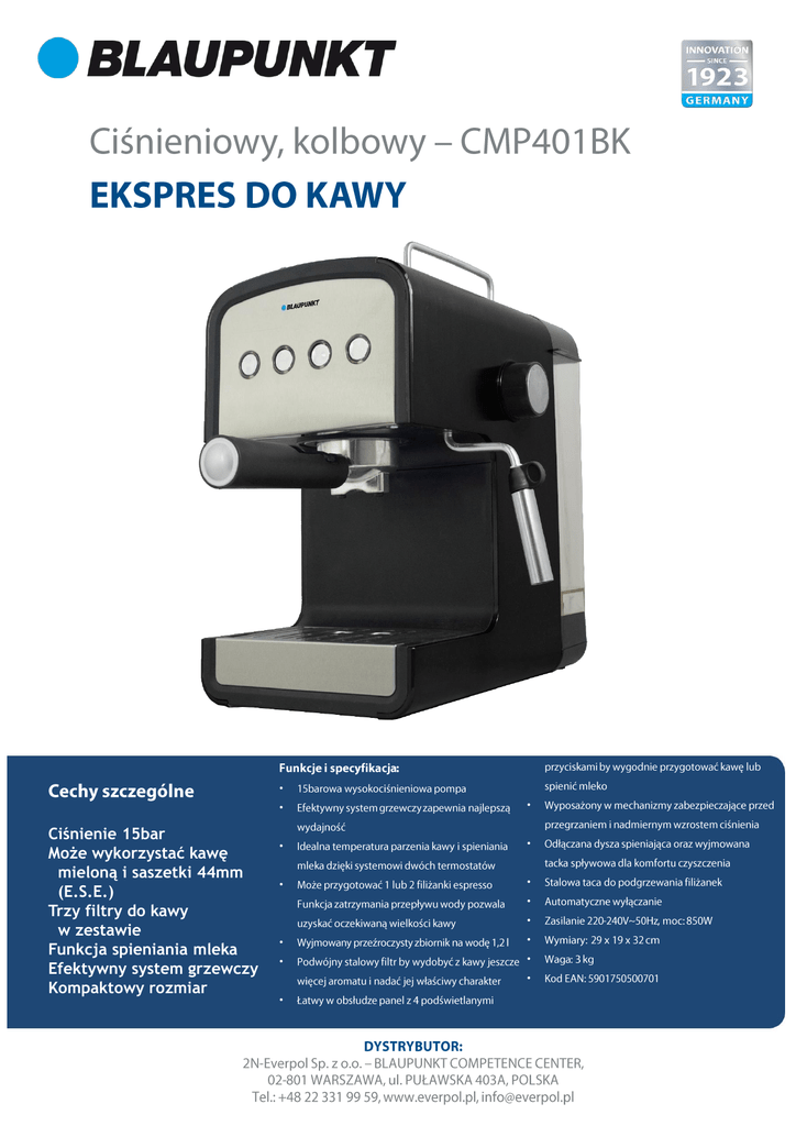 • Ciśnienie 15bar Może wykorzystać kawę mieloną i saszetki 44mm (E.S.E.) Trzy filtry do kawy w zestawie Funkcja spieniania mleka Efektywny system grzewczy Kompaktowy rozmiar • • • • • • • • • • • • • •
