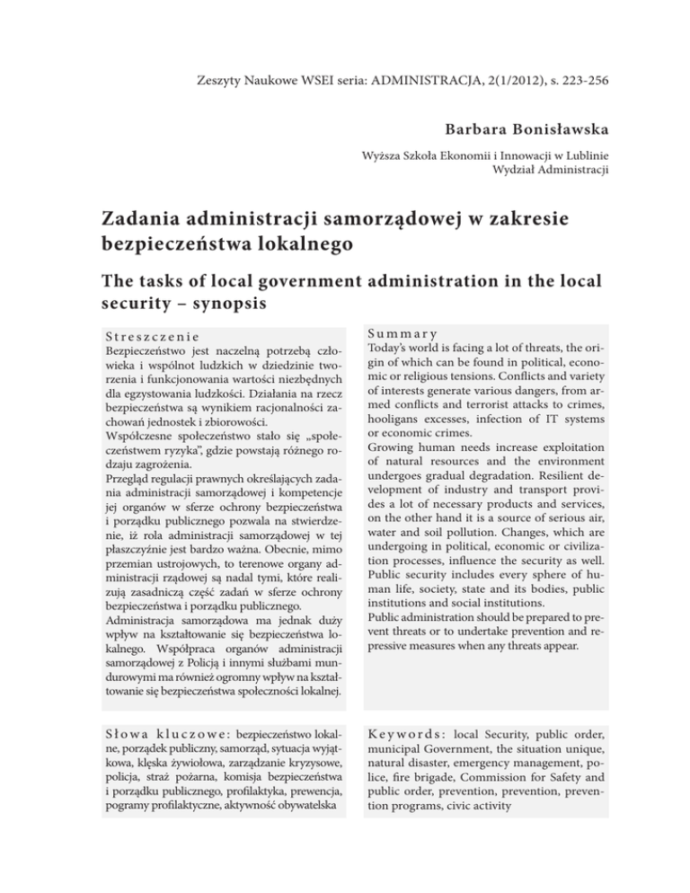 Zeszyty Naukowe WSEI seria: ADMINISTRACJA, 2(1/2012), s. 223-256 Barbara Bonisławska Wyższa Szkoła Ekonomii i Innowacji w Lublinie Wydział Administracji Zadania administracji samorządowej w zakresie bezpieczeństwa lokalnego The tasks of local government administration in the local security – synopsis Streszczenie Summar y Bezpieczeństwo jest naczelną potrzebą człowieka i wspólnot ludzkich w dziedzinie tworzenia i funkcjonowania wartości niezbędnych dla egzystowania ludzkości. Działania na rzecz bezpieczeństwa są wynikiem racjonalności zachowań jednostek i zbiorowości. Współczesne społeczeństwo stało się „społeczeństwem ryzyka”, gdzie powstają różnego rodzaju zagrożenia. Przegląd regulacji prawnych określających zadania administracji samorządowej i kompetencje jej organów w sferze ochrony bezpieczeństwa i porządku publicznego pozwala na stwierdzenie, iż rola administracji samorządowej w tej płaszczyźnie jest bardzo ważna. Obecnie, mimo przemian ustrojowych, to terenowe organy administracji rządowej są nadal tymi, które realizują zasadniczą część zadań w sferze ochrony bezpieczeństwa i porządku publicznego. Administracja samorządowa ma jednak duży wpływ na kształtowanie się bezpieczeństwa lokalnego. Współpraca organów administracji samorządowej z Policją i innymi służbami mundurowymi ma również ogromny wpływ na kształtowanie się bezpieczeństwa społeczności lokalnej. Today’s world is facing a lot of threats, the origin of which can be found in political, economic or religious tensions. Conflicts and variety of interests generate various dangers, from armed conflicts and terrorist attacks to crimes, hooligans excesses, infection of IT systems or economic crimes. Growing human needs increase exploitation of natural resources and the environment undergoes gradual degradation. Resilient development of industry and transport provides a lot of necessary products and services, on the other hand it is a source of serious air, water and soil pollution. Changes, which are undergoing in political, economic or civilization processes, influence the security as well. Public security includes every sphere of human life, society, state and its bodies, public institutions and social institutions. Public administration should be prepared to prevent threats or to undertake prevention and repressive measures when any threats appear. S ł o w a k l u c z o w e : bezpieczeństwo lokal- K e y w o r d s : local Security, public order, ne, porządek publiczny, samorząd, sytuacja wyjątkowa, klęska żywiołowa, zarządzanie kryzysowe, policja, straż pożarna, komisja bezpieczeństwa i porządku publicznego, profilaktyka, prewencja, pogramy profilaktyczne, aktywność obywatelska municipal Government, the situation unique, natural disaster, emergency management, police, fire brigade, Commission for Safety and public order, prevention, prevention, prevention programs, civic activity Zeszyty Naukowe WSEI seria: ADMINISTRACJA, 2(1/2012) 224 Barbara Bonisławska, Zadania administracji samorządowej w zakresie... Do podstawowych zadań współczesnego prawnego i demokratycznego państwa narodowego należy zapewnienie bezpieczeństwa i wolności jego obywateli. Konstytucja, jako najwyższe prawo Rzeczypospolitej Polskiej w artykule 5 stanowi, że państwo stoi na straży niepodległości i nienaruszalności swojego terytorium, strzeże dziedzictwa narodowego, zapewnia ochronę środowiska, kierując się zasadą zrównoważonego rozwoju oraz zapewnia wolności i prawa człowieka i obywatela oraz bezpieczeństwo obywateli1. Bezpieczeństwo obok porządku, życia i zdrowia, jest jedną z nadrzędnych wartości w skali oczekiwań społecznych i osobistych społeczeństwa. Na jego bazie człowiek buduje przyszłość dla siebie i swojej rodziny. Jest również naczelną potrzebą państw i systemów międzynarodowych. Jest dobrem podstawowym, gwarantującym prawidłowy rozwój życia indywidualnego każdej jednostki, jak również stabilizację i rozwój życia politycznego, ekonomicznego i społecznego. Pojęcie „bezpieczeństwa” jako terminu, zmieniało się równorzędnie do rozwoju cywilizacji, od czasów prehistorycznych poprzez starożytność do teraźniejszości. Nie bez znaczenia dla jego rozumienia były również różne ustroje państwowe, jak też czasy historyczne. Pomimo tego, że pojęcie „bezpieczeństwa” zmieniało się na przestrzeni wieków, to do dziś aktualna pozostała sentencja, wypowiedziana kilka tysięcy lat temu w starożytnej Grecji przez Tukidydesa z Aten, że sprawiedliwość zamieszka w Atenach dopiero wtedy, kiedy każdy obywatel, którego nie dotknęło przestępstwo, będzie tak samo oburzony tym faktem jak ten, który został pokrzywdzony w wyniku przestępstwa2. W dobie rozwoju cywilizacji i postępu technicznego termin „bezpieczeństwo” rozpatrywane jest w dwóch kategoriach. Pierwsza to bezpieczeństwo w skali makro, odnosząca się do spraw o zasięgu globalnym – całego świata, państwa czy kontynentu. Druga to bezpieczeństwo w skali mikro, odnosząca się do spraw osobistych każdego człowieka, czy też określonych społeczności lokalnych zamieszkujących np. osiedla, gminy, miasta, wsie, województwa. We współczesnej literaturze naukowej występuje wieloznaczność i złożoność pojęcia „bezpieczeństwa”, choć jednocześnie znajdujemy w niej również próby sprecyzowania tego terminu, rozpatrując wszelkie jego aspekty. Pojawia się w związku z tym wiele pojęć pokrewnych, takich jak „bezpieczeństwo publiczne”, „bezpieczeństwo państwa”, bezpieczeństwo narodowe”, czy „bezpieczeństwo wewnętrzne”, które występują w różnych przepisach prawnych, Andrzej Misiuk, po przeanalizowaniu opracowań związanych z definiowaniem „bezpieczeństwa”, rozważając poglądy różnych autorów, zauważył, że reguły języ1 2 Konstytucja Rzeczypospolitej Pol