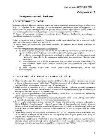 znak sprawy: ATT/19/KO/2016 Załącznik nr 2 Szczegółowe warunki konkursu I. OPIS PRZEDMIOTU NAJMU Konkurs obejmuje wynajem lokalu w budynku Centrum Sportowo-Rehabilitacyjnego w Warszawie przy ul. Trojdena 2C-G znajdującego się na poziomie pierwszego piętra (kondygnacja 2) o powierzchni 240,25 m2, składający się z sali głównej wraz z barkiem o powierzchni łącznej 179,68 m2 oraz pomieszczeń pomocniczych, zaplecza i kuchni o łącznej powierzchni 60,57 m2. W lokalu Wynajmujący zastrzega prowadzenie przez Najemcę działalności gospodarczej o charakterze restauracji z kawiarnią. Lokal, wyposażony jest w instalacje: elektryczną, wodociągowo-kanalizacyjną z dostawą ciepłej wody, centralnego ogrzewania oraz wentylację. Do lokalu może być dostęp poza godzinami otwarcia CRS poprzez boczną klatkę schodowa od ul. Trojdena. Lokal wymaga poniesienia nakładów na koszt Najemcy: 1. na koszt Najemcy przystosowanie lokalu do prowadzonej działalności gastronomicznej w oparciu o złożony przez Najemcę a zatwierdzony przez Wynajmującego projekt: a) uzyskanie wymaganej dokumentacji, uzgodnień wynikających z obowiązujących zasad i przepisów niezbędnych do rozpoczęcia działalności gastronomicznej (Sanepid oraz, p-poż, itd.), b) przeprowadzenia prac w lokalu polegających na wewnętrznej aranżacji ścian działowych, oraz uzyskanie wymaganych prawem zezwoleń na przeprowadzenie prac objętych projektem. 2. na koszt Najemcy wyposażenie kuchni, pomieszczeń pomocniczych, bufetu, sali konsumpcyjnej. II. OPIS WYMAGAŃ STAWIANYCH NAJEMCY LOKALU. 1. Obiekt został oddany do użytkowania w grudniu 2015r., wszelkie elementy znajdujące się obecnie w lokalu podlegają gwarancji budowlanej. Wszelkie ulepszenia lub przebudowa pomieszczeń jest możliwa jedynie po uzyskaniu pisemnej zgody Wynajmującego. 2. Lokal wymaga wyposażenia w sprzęt i meble na koszt Najemcy. Najemca wyposaży restaurację zgodnie złożoną w ofercie i sporządzoną na własny koszt koncepcją aranżacji po wcześniejszym zaakceptowaniu aranżacji przez Wynajmującego. 3. Oferent powinien przedstawić wystrój oraz aranżację dostosowaną do infrastruktury budowlanej opartej na projekcie budowlanym obiektu. 4. Najemca zobowiązany jest do przestrzegania przyjętych ogólnie norm i zasad „dobrego sąsiedztwa” w stosunku do znajdujących się w pobliży instytucji i mieszkańców. 5. W przypadku stwierdzenia przez Najemcę lub władze administracyjne potrzeby wykonania w lokalu dodatkowych zabezpieczeń i ulepszeń poprawiających bezpieczeństwo i komfort klientom lub uczestnikom organizowanych w restauracji imprez oraz mieszkańcom sąsiadujących budynków i instytucjom, wszelkie nakłady związane z dostosowaniem do ww. wymogów leżą po stronie Najemcy. 6. Oczekiwane godziny otwarcia lokalu minimum od 1100 do 2200 od poniedziałku do niedzieli plus dni świąteczne w których działa obiekt CSR. Szczegółowy harmonogram godzin i dni pracy do uzgodnienia z Administratorem CSR. 7. Oczekiwana współpraca z Warszawskim Uniwersytetem Medycznym zakresie organizowania i obsłudze części gastronomicznej imprez okolicznościowych i bankietów wraz z udostępnieniem lokalu przy wcześniejszym ustaleniu szczegółów z przedstawicielem WUM. 1 znak sprawy: ATT/19/KO/2016 Załącznik nr 2 Działalność gastronomiczna Najemca powinien zapewnić zestawy śniadaniowe, zestawy obiadowe, dania typu Fast-food, gorące i zimne napoje, desery, przekąski oraz drinki bezalkoholowe. W trakcie dnia pracy restauracji w sali konsumpcyjnej dopuszczalna jest jako tło muzyka nie przeszkadzająca w rozmowie i nauce. Oferent powinien wykazać się również doświadczeniem w obsłudze zamówień specjalnych np. bankiety i inne imprezy okolicznościowe. W szczególności: 1. Ceny powinny być przystępne dla studentów. 2. Oferent wyposaży pomieszczenia kuchni w niezbędny sprzęt techniczny i użytkowy. 3. Oferent wyposaży salę restauracyjną w niezbędne meble i sprzęt. 4. Oferent przedstawi w ofercie przykładowe menu. 5. Oferent powinien udokumentować minimum 3 letnie doświadczenie w prowadzeniu działalności restauracyjnej. 6. Najemca musi spełniać wszystkie wymogi do uzyskania niezbędnych zezwoleń i koncesji. 7. Oferent zapewnieni sprzęt nagłaśniający w odpowiednich pomieszczeniach lokalu. OCZEKIWANIA WYNAJMUJĄCEGO WOBEC CHARAKTERU DZIAŁALNOŚCI LOKALU GASTRONOMICZNEGO W CSR. CHARAKTER LOKALU GASTRONOMICZNEGO połączenie restauracji „casual dining” z systemem samoobsługowym z restauracją EXCLUSIVE z daniami przygotowywanymi na zamówienie i obsługą kelnerską 1. „CASUAL DINING” - menu: swobodny nieformalny posiłek dla trenujących indywidualnie i grupowo, - możliwość zjedzenia posiłku „singlom” bez konieczności dosiadania się do stolika. POSIŁKI: Posiłki oferowane to posiłkami ciepłe, zapewniające szeroki zakres menu: - przystawki, zupy, dania mięsne i dania wegetariańskie. - W dużym stopniu są to produkty mało skomplikowane w przygotowaniu – pizza, makarony, pierogi, naleśniki, dodatki w postaci surówek, sosów, warzyw, desery. - W menu można znaleźć zarówno dania dietetyczne, jak ekologiczne. - Oferta obejmuje napoje zimne i gorące. ----------------------------------------2. restauracja EXCLUSIVE - Doskonale przygotowana (zarówno z względu na zaplecze, jaki i ofertę gastronomiczną) do organizacji różnego rodzaju imprez okolicznościowych. - Restauracja z obsługą kelnerską i daniami z karty, odpowiadająca zapotrzebowaniu na spotkania grup sportowców, kibiców i sympatyków sportu. POSIŁKI: Wszystkie dania przyrządzone są ze świeżych, najwyższej jakości składników, dzięki czemu zaspokoją nawet najbardziej wyrafinowane gusta, również dla miłośników zdrowego jedzenia. ----------------------------------------- 2 znak sprawy: ATT/19/KO/2016 Załącznik nr 2 CHARAKTER WNĘTRZA - ZAŁOŻENIA - wnętrze odpowiadające aktualnym tre
