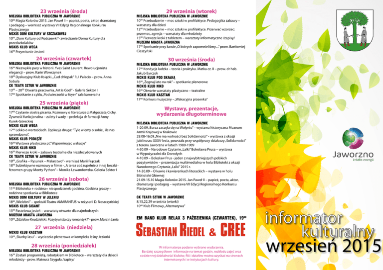 23 września (środa) Miejska Biblioteka Publiczna w Jaworznie 1000 Magia Kolorów 2015. Jan Paweł II – papież, poeta, aktor, dramaturg i pedagog – wernisaż wystawy VII Edycji Regionalnego Konkursu Plastycznego MCKiS Dom Kultury w Szczakowej 1000 „Dom Kultury od Podszewki”- zwiedzanie Domu Kultury dla przedszkolaków MCKiS Klub Wega 1600 Przywitanie Jesieni 24 września (czwartek) Miejska Biblioteka Publiczna w Jaworznie 1600 Niezwykłe pary w historii. Yves Saint Laurent. Rewolucjonista elegancji – prow. Karin Wawrzynek 1800 Dyskusyjny Klub Książki. „Cud chłopak” R.J. Palacio – prow. Anna Sobula CK Teatr Sztuk w Jaworznie 1300 – 2000 Otwarta pracownia „Art is Cool” - Galeria Sektor I 1700 Spotkanie z cyklu „Podwieczorki w foyer” sala kameralna 25 września (piątek) Miejska Biblioteka Publiczna w Jaworznie 1700 Czytanie siostrą pisania. Rozmowy o literaturze z Małgorzatą Cichy. Żywność funkcjonalna – zalety i wady – prelekcja dr farmacji Anny Kurek-Góreckiej MCKiS Klub Wega 1700 Lekko o wartościach. Dyskusja druga: ”Tyle wiemy o sobie , ile nas sprawdzono”. MCKiS Klub Podłęże 1600 Wystawa plastyczna pt.” Wspominając wakacje” MCKiS Klub Niko 1600 Pierwsze kroki – zabawy teatralne dla niezdecydowanych CK Teatr Sztuk w Jaworznie 1800 „Grafika – Rysunek – Malarstwo” - wernisaż Marii Frączak 1800 Subiektywne rozmowy o filmie - „A teraz coś zupełnie z innej beczki fenomen grupy Monty Python” – Monika Lewandowska. Galeria Sektor I 26 września (sobota) Miejska Biblioteka Publiczna w Jaworznie 1100 Biblioteka + rodzina= niespodzianek godzina. Godzina graczy – rodzinne spotkania w Bibliotece MCKiS Dom Kultury w Jeleniu 1800 „Wielebni” – spektakl Teatru AMARANTUS w reżyserii D. Noszczyńskiej MCKiS Klub Gigant 1300 Pastelowa jesień – warsztaty otwarte dla najmłodszych Muzeum Miasta Jaworzna 1000„Zdzisław Krudzielski. Pozytywista czy romantyk?” - prow. Marcin Jania 29 września (wtorek) Miejska Biblioteka Publiczna w Jaworznie 1000 Przebudzenie – moc sztuki w profilaktyce. Pedagogika zabawy – warsztaty dla dzieci 1200 Przebudzenie – moc sztuki w profilaktyce. Przerwać wzorzec: przemoc, agresja – warsztaty dla młodzieży 1500 Pierwsze kroki z tabletem – warsztaty informatyczne /zapisy/ Muzeum Miasta Jaworzna 1700 Spotkanie przy kawie „O których zapomnieliśmy....” prow. Bartłomiej Cieszyński 30 września (środa) Miejska Biblioteka Publiczna w Jaworznie 1700 Kondycja ludzka – teoria i praktyka. Matka cz. II – prow. dr hab. Jakub Byrczek MCKiS Klub Pod Skałką 1600 „Żegnaj lato na rok” – spotkanie plenerowe MCKiS Klub Niko 1600 Otwarte warsztaty plastyczno – teatralne MCKiS Klub Kasztan 1700 Konkurs muzyczny – „Wakacyjna piosenka” Wystawy, prezentacje, wydarzenia długoterminowe Miejska Biblioteka Publiczna w Jaworznie 1-20.09 „Burza zaczęła się na Wołyniu” – wystawa historyczna Muzeum Armii Krajowej w Krakowie 28.08-16.09 „Nie ma wolności bez Solidarności” - wystawa z okazji jubileuszu XXXV-lecia, powstała przy współpracy działaczy „Solidarności” z terenu Jaworzna w latach 1980-1989 4-30.09 – Narodowe Czytanie „Lalki” Bolesława Prusa – wystawa w Wypożyczalni dla Dorosłych 4-10.09 – Bolesław Prus - jeden z najwybitniejszych polskich pozytywistów – prezentacja multimedialna w holu Biblioteki z okazji Narodowego Czytania „Lalki” 2015 r. 14-30.09 – O kawie i kawiarenkach literackich – wystawa w holu Biblioteki Głównej 21.09-15.10 Magia Kolorów 2015. Jan Paweł II – papież, poeta, aktor, dramaturg i pedagog – wystawa VII Edycji Regionalnego Konkursu Plastycznego CK Teatr Sztuk w Jaworznie 8,15,22,29 września (wtorki) 1000 Klub Filmowy „Alternatywa” eM Band Klub Relax 3 paździenika (czwartek), 1900 27 września (niedziela) MCKiS Klub Kasztan 1030 „Skarby lasu” – wycieczka plenerowa w kompleks leśny Jeziorki 28 września (poniedziałek) Miejska Biblioteka Publiczna w Jaworznie 1630 Zostań programistą, robotykiem w Bibliotece – warsztaty dla dzieci i młodzieży - prow. Mateusz Szyguła /zapisy/ W informatorze podano wybrane wydarzenia. Bardziej szczegółowe informacje na temat godzin, rozkładu zajęć oraz codziennej działalności klubów, filii i działów można uzyskać na stronach internetowych i w instytucjach kultury. wrzesień 2015 2 września (środa) 1700 Czwartki z historią. Gawędy o Jaworznie Marii Leś-Runickiej. Reforma agrarna w Jaworznie w XIX w. MCKiS Klub Strażak 1600 Lekcja biblioteczna „Wrzesień 1939” – przypomnienie wydarzeń związanych z wybuchem wojny 11 września (piątek) 3 września (czwartek) Miejska Biblioteka Publiczna w Jaworznie 1630 Klub Filmowy. Kino z historią w tle – prow. Joanna Gatermajer 4 września (piątek) 5 września (sobota) Miejska Biblioteka Publiczna w Jaworznie 1100 Narodowe Czytanie „Lalki” Bolesława Prusa na jaworznickim Rynku. Zapraszamy mieszkańców do wspólnego czytania 6 września (niedziela) CK Teatr Sztuk w Jaworznie 1630 „O milczeniu trudno opowiadać...” - koncert z okazji XXXV – lecia Solidarności MCKiS - Park Osiedle Podłęże 900 V Letni Turniej Rycerski MCKiS Klub Dobra 1700 Jubileusz 30-lecia zespołu śpiewaczego Dobrzanki Muzeum Miasta Jaworzna 1000 Warsztat „Wycinanka żydowska”, pokaz filmu pt.: „Pozostały po nich fotografie...” - prow. Barbara Stanek 7 września (poniedziałek) Miejska Biblioteka Publiczna w Jaworznie 1630 Zostań programistą, robotykiem w Bibliotece – warsztaty dla dzieci i młodzieży - prow. Mateusz Szyguła /zapisy/ 8 września (wtorek) Miejska Biblioteka Publiczna w Jaworznie 1000 Klub Książki. Powakacyjne lektury – prow. Anna Sobula MCKiS Klub Gigant 1530 Tkany świat – warsztaty otwarte dla dzieci 9 września (środa) Miejska Biblioteka Publiczna w Jaworznie 1600 Bobas w Bibliotece. Jak i kiedy zacząć pływać? – prow. Marek Dziubek – instruktor pływania MC