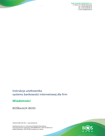 BANK OCHRONY ŚRODOWISKA S.A. ul. Żelazna 32 / 00-832 Warszawa tel.: (+48 22) 850 87 35 faks: (+48 22) 850 88 91 e-mail: [email protected] Instrukcja użytkownika systemu bankowości internetowej dla firm Wiadomości BOŚBank24 iBOSS infolinia 0 801 355 455 | www.bosbank.pl Sąd Rejonowy dla m.st. Warszawy XII Wydział Gospodarczy Krajowego Rejestru Sądowego I KRS 0000015525 | NIP 527 020 33 13 Kapitał zakładowy: 228 732 450 zł wpłacony w całości. WIADOMOŚCI 1. Informacje ogólne: W aplikacji BOŚBank24 iBOSS z głównym Menu widnieje ikona: Kliknięcie w nią przenosi Użytkownika Klienta do zakładki Wiadomości. Zakładka prezentuje listę wszystkich odebranych i wysłanych wiadomości: Najnowsze wiadomości prezentowane są również na ekranie głównym (pierwszy ekran po zalogowaniu) w sekcji Wiadomości: Uwaga: ekran główny zawiera sekcję Wiadomości. Jednak klient ma możliwość usunięcia tej sekcji z ekranu głównego i wówczas jedynym sposobem wejścia modułu Wiadomości pozostanie ikona Instrukcja użytkownika systemu bankowości internetowej dla firm BOŚBank24 iBOSS Strona 2 Użytkownik Klienta ma możliwość prowadzenia korespondencji z Bankiem na ogólnie znanych zasadach obsługi skrzynek pocztowych: Przeglądania/Wyszukiwania, Wysyłania/Odpowiadania, Odbierania, Archiwizacji wiadomości. 2. Wyszukiwanie wiadomości: Użytkownik ma możliwość wyszukania wiadomości wg wyszukiwanej frazy w temacie oraz treści wiadomości. Dodatkowo użytkownik może skorzystać z sekcji Więcej opcji wyszukiwania: Funkcja Więcej opcji wyszukiwania pozwala na wyszukiwanie wiadomości korzystając z filtrów: Kierunek – lista rozwijalna: wszystkie, przychodząca, wychodząca, Status – lista rozwijalna: wszystkie, wysłane, przeczytane, nieprzeczytane, archiwalne, Ułożone – lista rozwijalna: statusu, tematu, kierunku, daty wysłania, daty przeczytania, Pola Data wysłania od Data wysłania do – zakres dat otrzymanych wiadomości, dla pól dostępne są ikonki z podpowiedzią kalendarza, Pola Data przeczytania od/ Data przeczytania do - zakres dat przeczytanych wiadomości, dla pól dostępne są ikonki z podpowiedzią kalendarza, Wysłane w ostatnich dniach – lista wiadomości wysłanych w ostatnich dniach określonych przez Użytkownika, Przeczytane w ostatnich dniach – lista wiadomości przeczytanych w ostatnich dniach określonych przez Użytkownika, Lista rekordów – pozwala na ograniczenie liczby wiadomości wyświetlonych na stronie, Instrukcja użytkownika systemu bankowości internetowej dla firm BOŚBank24 iBOSS Strona 3 Przeglądanie wiadomości wszystkich lub wg zadanych kryteriów jest możliwe po użyciu przycisku Pokaż. Wybór sekcji Mniej opcji wyszukiwania skutkuje wyczyszczeniem i ukryciem dodatkowych pól umożliwiających wyszukiwanie zaawansowane - przełączenie trybu wyszukiwania oznaczające rezygnację z wyszukiwania wg kryteriów zadanych w Lista Wiadomości. Lista wiadomości prezentuje następujące dane: pole służące do zaznaczenia wiadomości z listy w celu wykonania akcji np. archiwizacji, Status - status wiadomości, Temat - temat wiadomości, Kierunek wiadomości - przychodząca/wychodząca, Nadawca/Odbiorca - dane nadawcy/odbiorcy, Data wysłania - data oraz godzina wysłania wiadomości, Data przeczytania - data przeczytania wiadomości. Nad listą wiadomości dostępne są następujące przyciski funkcyjne: Zapis do PDF - umożliwia zapis treści wiadomości w formacie dokumentu pdf o wskazanej przez Użytkownika nazwie i we wskazanej lokalizacji pliku. W przypadku wiadomości z historią konwersacji, zapisana do pliku pdf jest również cała historia konwersacji dotycząca tej wiadomości (w postaci szczegółowej z treścią wiadomości historycznych). Załączniki nie są zapisywane do pliku pdf. W pliku wiadomości ułożone są wg daty, najnowsza na początku najstarsza na końcu, dla każdej wiadomości jest sekcja nagłówka zawierająca temat, datę wysłania i informację o tym, kto wysłał wiadomość. Pod nagłówkiem prezentowana jest treść wiadomości. Odpowiedz - umożliwia odpowiedź na otrzymaną wiadomość, odpowiedź będzie tworzona na bazie formatki nowej wiadomości. Archiwizuj - po wybraniu wiadomości (jednej lub wielu) akcja przenosi je do archiwum. Uwaga: Jeżeli klient korzysta usługi Multiuser, Użytkownik widzi tylko swoje wiadomości. Nie widzi wiadomości wysłanych do klientów, których obsługuje. Podgląd wiadomości wysyłanych do klientów, których obsługuje możliwy jest tylko po zalogowaniu się na tego klienta. Instrukcja użytkownika systemu bankowości internetowej dla firm BOŚBank24 iBOSS Strona 4 3. Szczegóły wiadomości: Wybór wiadomości z listy możliwy jest po kliknięciu w temat wiadomości, co powoduje przejście do formatki ze szczegółami wiadomości: Formatka ze szczegółami wiadomości prezentuje następujące dane: Status, Temat, Kierunek - kierunek wiadomości (Przychodząca/Wychodząca), Nadawca/Odbiorca - dane uzależniona od kierunku Wiadomości, w przypadku Przychodzącej pojawia się Odbiorca, w przypadku Wychodzącej Nadawca. Data wysłania, Data przeczytania, Treść wiadomości. Jeżeli do wiadomości dołączono plik, będzie on dostępny w sekcji Załączniki. Z poziomu formatki możliwe jest skorzystanie z następujących akcji: Zapis do PDF - umożliwia te same akcje, co przycisk na formatce z listą wiadomości. Podgląd historii - umożliwia podgląd historii konwersacji dla danej wiadomości, formularz prezentuje "drzewo" historii konwersacji dla wiadomości. Poszczególne wiadomości w Instrukcja użytkownika systemu bankowości internetowej dla firm BOŚBank24 iBOSS Strona 5 drzewie są reprezentowane przez Użytkownika, datę wysłania/otrzymania wiadomości oraz jej temat i status (wysłana/otrzymana) z możliwością przejścia do szczegółów wiadomości historycznych Odpowiedz - umożliwia odpowiedź na otrzymaną wiadomość,