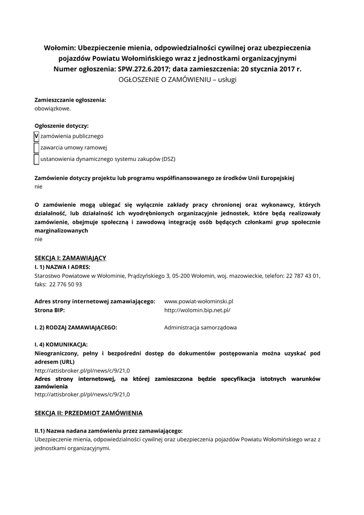 Wołomin: Ubezpieczenie mienia, odpowiedzialności cywilnej oraz ubezpieczenia pojazdów Powiatu Wołomińskiego wraz z jednostkami organizacyjnymi Numer ogłoszenia: SPW.272.6.2017; data zamieszczenia: 20 stycznia 2017 r. OGŁOSZENIE O ZAMÓWIENIU – usługi Zamieszczanie ogłoszenia: obowiązkowe. Ogłoszenie dotyczy: V zamówienia publicznego zawarcia umowy ramowej ustanowienia dynamicznego systemu zakupów (DSZ) Zamówienie dotyczy projektu lub programu współfinansowanego ze środków Unii Europejskiej nie O zamówienie mogą ubiegać się wyłącznie zakłady pracy chronionej oraz wykonawcy, których działalność, lub działalność ich wyodrębnionych organizacyjnie jednostek, które będą realizowały zamówienie, obejmuje społeczną i zawodową integrację osób będących członkami grup społecznie marginalizowanych nie SEKCJA I: ZAMAWIAJĄCY I. 1) NAZWA I ADRES: Starostwo Powiatowe w Wołominie, Prądzyńskiego 3, 05-200 Wołomin, woj. mazowieckie, telefon: 22 787 43 01, faks: 22 776 50 93 Adres strony internetowej zamawiającego: www.powiat-wołominski.pl Strona BIP: http://wolomin.bip.net.pl/ I. 2) RODZAJ ZAMAWIAJĄCEGO: Administracja samorządowa I. 4) KOMUNIKACJA: Nieograniczony, pełny i bezpośredni dostęp do dokumentów postępowania można uzyskać pod adresem (URL) http://attisbroker.pl/pl/news/c/9/21,0 Adres strony internetowej, na której zamieszczona będzie specyfikacja istotnych warunków zamówienia http://attisbroker.pl/pl/news/c/9/21,0 SEKCJA II: PRZEDMIOT ZAMÓWIENIA II.1) Nazwa nadana zamówieniu przez zamawiającego: Ubezpieczenie mienia, odpowiedzialności cywilnej oraz ubezpieczenia pojazdów Powiatu Wołomińskiego wraz z jednostkami organizacyjnymi. II.2) Rodzaj zamówienia: usługi II.3) Informacja o możliwości składania ofert częściowych: Zamówienie podzielone jest na części: tak Oferty lub wnioski o dopuszczenie do udziału w postępowaniu można składać w odniesieniu do: wszystkich części II.4) Określenie przedmiotu oraz wielkości lub zakresu zamówienia: Przedmiot zamówienia obejmuje ubezpieczenie mienia i odpowiedzialności cywilnej zamawiającego w zakresie ubezpieczenia mienia od wszystkich ryzyk z uwzględnieniem ryzyka kradzieży z włamaniem i rabunku oraz kradzieży zwykłej, ubezpieczenia szyb od stłuczenia, ubezpieczenia sprzętu elektronicznego od wszystkich ryzyk, ubezpieczenia odpowiedzialności cywilnej, ubezpieczeń pojazdów (ubezpieczenie odpowiedzialności cywilnej posiadaczy pojazdów mechanicznych, ubezpieczenia autocasco, ubezpieczenia następstw nieszczęśliwych wypadków, kierowców i pasażerów, ubezpieczenie assistance). II.5) Główny kod CPV: 1. CPV: 66.51.00.00-8 Nazewnictwo wg CPV: usługi ubezpieczeniowe Dodatkowe kody CPV: 1. CPV: 66.51.41.10-0 Nazewnictwo wg CPV: usługi ubezpieczeń pojazdów mechanicznych 2. CPV: 66.51.54.00-7 Nazewnictwo wg CPV: usługi ubezpieczenia mienia od wszystkich ryzyk 3. CPV: 66.51.60.00-0 Nazewnictwo wg CPV: usługi ubezpieczenia od odpowiedzialności cywilnej 4. CPV: 66.51.50.00-3 Nazewnictwo wg CPV: ubezpieczenie sprzętu elektronicznego 5. CPV: 66.51.61.00-1 Nazewnictwo wg CPV: usługi ubezpieczenia pojazdów mechanicznych od odpowiedzialności cywilnej 6. 7. CPV: 66.51.41.10-0 Nazewnictwo wg CPV: usługi ubezpieczeń pojazdów mechanicznych (autocasco) CPV: 66.51.21.00-3 Nazewnictwo wg CPV: usługi ubezpieczenia następstw nieszczęśliwych wypadków kierowcy i pasażerów w związku z ruchem pojazdów 8. CPV: 66.51.41.10-0 Nazewnictwo wg CPV: ubezpieczenie assistance II.7) Czy przewiduje się udzielenie zamówień, o których mowa w art. 67 ust. 1 pkt 6 i 7 lub w art. 134 ust. 6 pkt 3 ustawy Pzp: nie SEKCJA III: INFORMACJE O CHARAKTERZE PRAWNYM, EKONOMICZNYM, FINANSOWYM I TECHNICZNYM III.1) WARUNKI UDZIAŁU W POSTĘPOWANIU III. 1.1) Kompetencje lub uprawnienia do prowadzenia określonej działalności zawodowej, o ile wynika to z odrębnych przepisów. Zamawiający w odniesieniu do tego warunku oczekuje przedstawienia dokumentów potwierdzających posiadanie przez Wykonawcę zezwolenia lub innego równoważnego uprawnienia, od którego uzależnione jest prawo świadczenia usług ubezpieczeniowych objętych przedmiotem zamówienia. III. 1.2) Sytuacja finansowa lub ekonomiczna Zamawiający w odniesieniu do tego warunku nie określa minimalnego poziomu zdolności Wykonawcy do należytego wykonania zamówienia. III. 1.3) Zdolność techniczna lub zawodowa Zamawiający w odniesieniu do tego warunku nie określa minimalnego poziomu zdolności Wykonawcy do należytego wykonania zamówienia. Zgodnie z art. 36b ust. 1 ustawy PZP Zamawiający żąda wskazania przez Wykonawcę jakichkolwiek części zamówienia, których wykonanie zamierza powierzyć podwykonawcom i podania przez Wykonawcę firm podwykonawców. III.2) PODSTAWY WYKLUCZENIA III.2.1) Podstawy wykluczenia określone w art. 24 ust. 1 ustawy PZP tak III.2.2) Zamawiający przewiduje możliwość wykluczenia z postępowania o udzielenie niniejszego zamówienia Wykonawcy, który nie spełnia wymogów określonych w art. 24 ust. 5 ustawy PZP (podstawa wykluczenia określona w art. 24 ust.5 pkt. 1) tak III.3) WYKAZ OŚWIADCZEŃ SKŁADANYCH PRZEZ WYKONAWCĘ W CELU WSTĘPNEGO POTWIERDZENIA, ŻE NIE PODLEGA ON WYKLUCZENIU ORAZ SPEŁNIA WARUNKI UDZIAŁU W POSTĘPOWANIU ORAZ SPEŁNIA KRYTERIA SELEKCJI Oświadczenie o niepodleganiu wykluczeniu oraz spełnianiu warunków udziału w postępowaniu tak Oświadczenie o spełnianiu kryteriów selekcji nie III.4) WYKAZ OŚWIADCZEŃ LUB DOKUMENTÓW, SKŁADANYCH PRZEZ WYKONAWCĘ W POSTĘPOWANIU NA WEZWANIE ZAMAWIAJACEGO W CELU POTWIERDZENIA OKOLICZNOŚCI, O KTÓRYCH MOWA W ART. 25 UST.1 PKT. 3 USTAWY PZP: Oświadczenie o niepodleganiu wykluczeniu oraz spełnianiu warunków udziału w postępowaniu, wg wzoru określonego w załączniku nr 6 do SIWZ. III.5) WYKAZ OŚWIADCZEŃ LUB DOKUMENTÓW SKŁADANYCH PRZEZ WYKONAWCĘ W POSTĘPOWANIU NA WEZWANIE ZAMAWIAJACEGO W CELU POTWIERDZEN