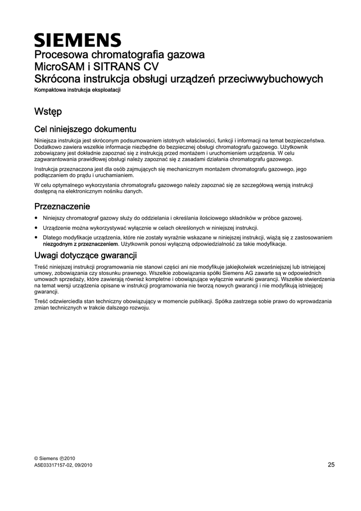 Procesowa chromatografia gazowa MicroSAM i SITRANS CV Skrócona instrukcja obsługi urządzeń przeciwwybuchowych Kompaktowa instrukcja eksploatacji Wstęp Cel niniejszego dokumentu Niniejsza instrukcja jest skróconym podsumowaniem istotnych właściwości, funkcji i informacji na temat bezpieczeństwa. Dodatkowo zawiera wszelkie informacje niezbędne do bezpiecznej obsługi chromatografu gazowego. Użytkownik zobowiązany jest dokładnie zapoznać się z instrukcją przed montażem i uruchomieniem urządzenia. W celu zagwarantowania prawidłowej obsługi należy zapoznać się z zasadami działania chromatografu gazowego. Instrukcja przeznaczona jest dla osób zajmujących się mechanicznym montażem chromatografu gazowego, jego podłączaniem do prądu i uruchamianiem. W celu optymalnego wykorzystania chromatografu gazowego należy zapoznać się ze szczegółową wersją instrukcji dostępną na elektronicznym nośniku danych. Przeznaczenie ● Niniejszy chromatograf gazowy służy do oddzielania i określania ilościowego składników w próbce gazowej. ● Urządzenie można wykorzystywać wyłącznie w celach określonych w niniejszej instrukcji. ● Dlatego modyfikacje urządzenia, które nie zostały wyraźnie wskazane w niniejszej instrukcji, wiążą się z zastosowaniem niezgodnym z przeznaczeniem. Użytkownik ponosi wyłączną odpowiedzialność za takie modyfikacje. Uwagi dotyczące gwarancji Treść niniejszej instrukcji programowania nie stanowi części ani nie modyfikuje jakiejkolwiek wcześniejszej lub istniejącej umowy, zobowiązania czy stosunku prawnego. Wszelkie zobowiązania spółki Siemens AG zawarte są w odpowiednich umowach sprzedaży, które zawierają również kompletne i obowiązujące wyłącznie warunki gwarancji. Wszelkie stwierdzenia na temat wersji urządzenia opisane w instrukcji programowania nie tworzą nowych gwarancji i nie modyfikują istniejącej gwarancji. Treść odzwierciedla stan techniczny obowiązujący w momencie publikacji. Spółka zastrzega sobie prawo do wprowadzania zmian technicznych w trakcie dalszego rozwoju. © Siemens Ⓟ2010 A5E03317157-02, 09/2010 25 Instrukcje dotyczące bezpieczeństwa Chromatograf gazowy spełnia obowiązujące normy bezpieczeństwa. W przypadku przestrzegania instrukcji obsługi i informacji dotyczących bezpieczeństwa, podczas obsługi urządzenia nie istnieje żadne niebezpieczeństwo, które mogłoby zagrażać zdrowiu personelu lub powodować uszkodzenie mienia. Informacje na temat bezpieczeństwa znajdują się: ● W niniejszej instrukcji obsługi i podręczniku ● Na chromatografie gazowym ● Na elementach chromatografu OSTRZEŻENIE Wyłącznie odpowiednio wykwalifikowane osoby mogą serwisować niniejsze urządzenie. Osoby te muszą być dobrze zaznajomione ze wszystkimi źródłami zagrożeń i działaniami serwisowymi, zgodnie z niniejszą instrukcją obsługi. Bezproblemowa i bezpieczna obsługa niniejszego urządzenia jest możliwa, jeżeli spełnione zostaną następujące wymagania: ● Transport zgodny z odpowiednimi procedurami ● Prawidłowe magazynowanie ● Prawidłowa instalacja i montaż ● Ostrożna obsługa i konserwacja W celu uniknięcia obrażeń ciała i uszkodzenia urządzenia należy przestrzegać informacji zawartych w instrukcji. OSTRZEŻENIE Niebezpieczne gazy ● Chromatograf gazowy wymaga do działania różnych gazów, które charakteryzują się różnym potencjałem zagrożenia. ● Do pracy chromatografu gazowego mogą być wymagane gazy, które tworzą wybuchową mieszankę z powietrzem. ● Wszystkie gazy wylotowe, łącznie z gazami z urządzenia oddechowego, należy odprowadzać z chromatografu gazowego i z dala od miejsca eksploatacji za pomocą wspólnego przewodu. ● Należy zawsze zapewnić odpowiednią wentylację, gdy tylko uruchomiony zostanie pusty przewód z gazem próbnym, a gaz ten zawiera elementy korozyjne i toksyczne. OSTROŻNIE Zagrożenie korozją Obudowa i orurowanie są odporne na rozpuszczalniki oraz słabe alkalia i kwasy. Należy sprawdzić odporność obudowy i orurowania w przypadku stosowania urządzenia w środowisku z silnymi alkaliami lub kwasami i/lub w wysokich temperaturach. Uniknięcie korozji i uszkodzenia przewodów łączących w wyniku trwałego kontaktu z następującymi substancjami: ● Kwasem azotowym ● Kwasem chlorowodorowym ● Dwusiarczkiem węgla ● Etanolem ● Kwasem metanowym ● Benzyną lakową ● Olejem hydraulicznym ● Izopropanolem 26 Skrócona instrukcja obsługi urządzeń przeciwwybuchowych A5E03317157-02, 09/2010 OSTROŻNIE Urządzenia wrażliwe na wyładowania elektrostatyczne Niniejsze urządzenie zawiera komponenty wrażliwe na wyładowania elektrostatyczne. Urządzenia wrażliwe na wyładowania elektrostatyczne mogą ulec uszkodzeniu w wyniku działania napięcia niewykrywalnego dla człowieka. Napięcie tego typu występuje gdy tylko element lub zespół zostanie dotknięty przez osobę, która nie posiada uziemienia zabezpieczającego przed elektrycznością statyczną. Uszkodzenie modułu na skutek przepięcia nie jest zazwyczaj natychmiast wykrywane. Może zostać zauważone dopiero po dłuższym okresie pracy. Środki zabezpieczające przed wyładowaniem elektryczności statycznej: ● Przed rozpoczęciem pracy z modułami należy najpierw rozładować ładunki nagromadzone na powierzchni ciała, na przykład przez dotknięcie uziemionego przedmiotu. ● Stosowane urządzenia i narzędzia muszą być wolne od ładunków statycznych. ● Przed podłączaniem lub odłączaniem modułów należy zawsze wyciągnąć wtyczkę zasilającą i odłączyć baterię. ● Moduły należy trzymać dotykając wyłącznie ich krawędzi. Nie należy dotykać pinów ani obwodów drukowanych. Wykwalifikowany personel OSTROŻNIE Wykwalifikowany personel ● Wyłącznie wykwalifikowany personel jest uprawniony do instalacji i eksploatacji procesowego chromatografu gazowego. ● Niewystarczająca znajomoś