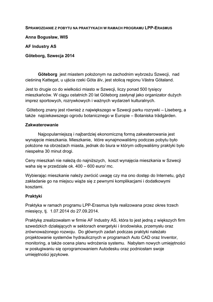 SPRAWOZDANIE Z POBYTU NA PRAKTYKACH W RAMACH PROGRAMU LPP-ERASMUS Anna Bogusław, WIS AF Industry AS Göteborg, Szwecja 2014 Göteborg jest miastem położonym na zachodnim wybrzeżu Szwecji, nad cieśniną Kattegat, u ujścia rzeki Göta älv, jest stolicą regionu Västra Götaland. Jest to drugie co do wielkości miasto w Szwecji, liczy ponad 500 tysięcy mieszkańców. W ciągu ostatnich 20 lat Göteborg zasłynął jako organizator dużych imprez sportowych, rozrywkowych i ważnych wydarzeń kulturalnych. Göteborg znany jest również z największego w Szwecji parku rozrywki – Liseberg, a także najciekawszego ogrodu botanicznego w Europie – Botaniska trädgården. Zakwaterowanie Najpopularniejszą i najbardziej ekonomiczną formą zakwaterowania jest wynajęcie mieszkania. Mieszkanie, które wynajmowaliśmy podczas pobytu było położone na obrzeżach miasta, jednak do biura w którym odbywaliśmy praktyki było niespełna 30 minut drogi. Ceny mieszkań nie należą do najniższych, koszt wynajęcia mieszkania w Szwecji waha się w przedziale ok. 400 – 600 euro/ mc. Wybierając mieszkanie należy zwrócić uwagę czy ma ono dostęp do Internetu, gdyż zakładanie go na miejscu wiąże się z pewnymi komplikacjami i dodatkowymi kosztami. Praktyki Praktyka w ramach programu LPP-Erasmus była realizowana przez okres trzech miesięcy, tj. 1.07.2014 do 27.09.2014. Praktykę zrealizowałam w firmie AF Industry AS, która to jest jedną z większych firm szwedzkich działających w sektorach energetyki i środowiska, przemysłu oraz zrównoważonego rozwoju. Do głównych zadań podczas praktyki należało projektowanie systemów hydraulicznych w programach Auto CAD oraz Inventor, monitoring, a także ocena planu wdrożenia systemu. Nabyłam nowych umiejętności w posługiwaniu się oprogramowaniem Autodesku oraz podniosłam swoje umiejętności językowe. Podsumowanie Polecam każdemu wyjazd na praktykę do Szwecji, gdyż można poznać nową kulturę, w wolnym czasie zwiedzić ciekawy kraj, ale przede wszystkim nabyć niezbędnego doświadczenia w renomowanej firmie z perspektywą na dalszy rozwój. Należy jednak pamiętać, że Szwecja jest dość drogim krajem i wyjeżdżając na praktykę warto poszukać instytucji świadczącej płatne praktyki.