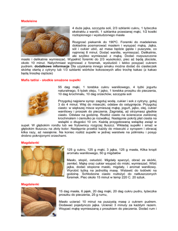 Madeleine 4 duże jajka, szczypta soli, 2/3 szklanki cukru, 1 łyżeczka ekstraktu z wanilii, 1 szklanka przesianej mąki, 1/2 kostki roztopionego i wystudzonego masła Rozgrzać piekarnik do 190ºC. Foremki do madeleines dokładnie posmarować masłem i wysypać mąką. Jajka, sól i cukier ubić, aż masa będzie gęsta i puszysta, co najmniej 8 minut. Dodać wanilie, wymieszać. Delikatnie, ale szybko wymieszać z mąką. Dodać rozpuszczone masło i delikatnie wymieszać. Wypełnić foremki do 2/3 wysokości, piec aż będą złociste, około 10 minut. Natychmiast wyjmować z foremek, wystudzić i lekko posypać cukrem pudrem. dodatkowe informacje Dla uzyskania innego smaku można dodać do ciasteczek skórkę otartą z cytryny lub 1/3 szklanki wiórków kokosowych albo trochę kakao (z kakao będą troszkę cięższe) Mafis tatlisi - słodkie smażone supełki 55 dag mąki, 1 torebka cukru waniliowego, 4 łyżki jogurtu naturalnego, 5 łyżek oleju, 1 jajko, 1 torebka proszku do pieczenia, 10 dag krochmalu, 10 dag orzechów, szczypta soli Przygotuj najpierw syrop: zagotuj wodę, cukier i sok z cytryny, gotuj 3 do 4 minut. Wlej do miseczki, odstaw do ostygnięcia. Przygotuj ciasto: w większej misce wymieszaj mąkę, jogurt, jajko, olej, cukier waniliowy i proszek do pieczenia. Zagniataj, aż otrzymasz gładkie ciasto. Odstaw na godzinę. Rozłóż ciasto na ściereczce zwilżonej krochmalem i cieniutko je rozwałkuj. Następnie pokrój płat ciasta na wstążki o długości 10 cm. Każdą przygotowaną wstążkę zwiąż w supeł. W głębokim rondlu lub we frytownicy rozgrzej tłuszcz. Wkładaj supełki i smaż w głębokim tłuszczu na złoty kolor. Następnie przełóż każdy do miseczki z syropem i obracaj kilka razy, aż nasiąknie. Na koniec rozłóż supełki w jednej warstwie na półmisku i posyp drobno pokrojonymi orzechami. Magdalenki 125 g cukru, 125 g mąki, 3 jajka, 125 g masła, Kilka kropli aromatu waniliowego, 50 g migdałów Masło, stopić, ostudzić. Migdały sparzyć, obrać ze skórki, zemleć. Mąkę oraz cukier wsypać do miski, wymieszać. Wbić jajka, dodać stopione masło, migdały, i aromat waniliowy. Wyrobić łyżką na jednolitą masę. Wstawić do lodówki na godzinę. Schłodzone ciasto rozłożyć do natłuszczonych foremek. Piec około 15 minut w temp 220 C. 20 sztuk. Magdalenki 15 dag masła, 6 jajek, 20 dag mąki, 20 dag cukru pudru, łyżeczka proszku do pieczenia, 25 g rumu, Masło ucierać 10 minut na puszystą masę z cukrem pudrem. Dodawać pojedynczo jajka. Ucierać 3 minuty za każdym razem. Wsypać mąkę wymieszaną z proszkiem do pieczenia. Dodać rum i wymieszać. Przygotowane ciasto nakładać do wysmarowanych masłem i posypanych mąką foremek w kształcie małych, prążkowanych muszelek. Wypełnić foremki do 3/4 wysokości. Piec 10-15 minut w gorącym piekarniku. Magdalenki czekoladowe 10 dag masła, 4 dag czekolady, 1/3 szklanki mąki, 1/3 szklanki cukru pudru, 1 łyżeczka miodu, 3 białka Masło i czekoladę rozpuścić. Odstawić do ostygnięcia. Dodać miód, wymieszać. W misce połączyć mąkę z pudrem. Białka ubić na sztywną pianę. Białka, masło z czekoladą i mąkę z pudrem wymieszać delikatnie. Nałożyć do papierowych foremek. Chłodzić w lodówce przez godzinę. Piec ok. 15 minut w temperaturze 200°C. Magdalenki dubeltowo karmelowe 80 g roztopionego masła, 80 g cukru brązowego jasnego, 2 duże jajka, 1/4 łyżeczki soli, 80 g mąki, 1/2 łyżeczki proszku do pieczenia, 3 łyżki płynnego karmelu ze sklepu lub zrobionego w domu z ok. 5 łyżek cukru (można karmel z dobrym efektem zastąpić sosem toffi) Nagrzać piekarnik do 220 stopni. Ubić dobrze mikserem na najwyższych obrotach (i dość długo - minimum 5 min) cale jajka z solą i cukrem, aż powstanie gęsta i puszysta masa. Wmieszać (nie mikserem! -łyżką lub plastikową łopatką) make z proszkiem, a następnie roztopione masło połączone z karmelem (do karmelu wlewamy masło, a potem wszystko razem do mąki). Wlewać masę do pełna do foremek na magdalenki. Ja używam silikonowych, których nie trzeba nawet natłuszczać. W przypadku innych foremek oczywiście natłuszczamy i wysypujemy je mąką. Piec madeleines w 220 stopniach przez 8-12 min lub aż się lekko zezłocą na brzegach. Magdalenki Iwaszkiewiczów 225 g mąki, 175 g cukru, 100 g masła, 2 łyżeczki proszku do pieczenia, 4 jaja, skórka otarta z 1 cytryny (lub 1 opakowanie gotowej sproszkowanej), masło do wysmarowania formy, mąka do oprószenia Stopić 100 g masła, zostawić do przestygnięcia. Wbić całe jajka do cukru, miksować tak długo, aż cukier się rozpuści. Wsypać mąkę, proszek do pieczenia, otartą skórkę z cytryny, wlać przestudzone masło. Dokładnie zmiksować. Każdy z otworów w blaszce na magdalenki dokładnie wysmarować masłem, oprószyć lekko mąką, nakładać ciasto do wysokości 2/3 otworu. Zostawić na 20 minut. Nagrzać piekarnik do 240 stopni. Wkładać blachę do nagrzanego piekarnika, piec ok. 7-10 minut. Zaraz po wyjęciu blachy, po 2-3 minutach wyjmować magdalenki. dodatkowe informacje Jeżeli mamy tylko 1 blaszkę do magdalenek, przed pieczeniem kolejnej porcji ciasteczek, trzeba ją umyć i dokładnie wystudzić i powtórzyć cały proces. Najlepiej jeść ciastka zaraz po lekkim ostudzeniu, ale można przechowywać je w szczelnym metalowym pudełku, długo zachowują świeżość. Magdalenki miodowo-migdałowe 10 dag masła, 1/4 szklanki mąki, 1/2 szklanki cukru pudru, 1/4 szklanki drobno posiekanych migdałów bez skórki, 1 łyżka miodu, 3 białka Masło roztopić. Foremki do babeczek wysmarować masłem przy pomocy pędzelka, posypać cieniutko mąką. Pozostałe masło odstawić do ostygnięcia. Dodać miód, wymieszać. W misce połączyć mąkę z pudrem i migdałami. Białka ubić na sztywną pianę. Białka, masło z miodem i mąkę z pudrem i migdałami wymieszać delikatnie. Nałożyć do foremek zostawiając p