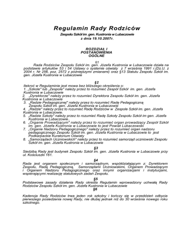 Regulamin Rady Rodziców Zespołu Szkół im .gen. Kustronia w Lubaczowie z dnia 19.10.2007r. ROZDZIAŁ I POSTANOWIENIA OGÓLNE §1 Rada Rodziców Zespołu Szkół im. gen. Józefa Kustronia w Lubaczowie działa na podstawie artykułów 53 i 54 Ustawy o systemie oświaty z 7 września 1991 r.(Dz.U. z 2004 r. Nr 256, poz. 2572 z późniejszymi zmianami) oraz §13 Statutu Zespołu Szkół im. gen. Józefa Kustronia w Lubaczowie §2 Ilekroć w Regulaminie jest mowa bez bliŜszego określenia o: 1. „Szkole" lub „Zespole" naleŜy przez to rozumieć Zespół Szkół im. gen. Józefa Kustronia w Lubaczowie 2. „Dyrektorze" naleŜy przez to rozumieć Dyrektora Zespołu Szkół im. gen. Józefa Kustronia w Lubaczowie 3. „Radzie Pedagogicznej" naleŜy przez to rozumieć Radę Pedagogiczną Zespołu Szkół im. gen. Józefa Kustronia w Lubaczowie 4. „Radzie" naleŜy przez to rozumieć Radę Rodziców w Zespole Szkół im. gen. Józefa Kustronia w Lubaczowie. 5. „Radzie Szkoły" naleŜy przez to rozumieć Radę Szkoły Zespołu Szkół im gen. Józefa Kustronia w Lubaczowie.. 6. „Organie Prowadzącym" naleŜy przez to rozumieć organ prowadzący Zespół Szkół im. gen. Józefa Kustronia w Lubaczowie to jest Powiat Lubaczowski 7. „Organie Nadzoru Pedagogicznego" naleŜy przez to rozumieć organ nadzoru pedagogicznego Zespołu Szkół im. gen. Józefa Kustronia w Lubaczowie to jest Podkarpackie Kuratorium Oświaty 8. „Samorządach Uczniowskich" naleŜy przez to rozumieć samorząd uczniowski Zespołu Szkół im. gen. Józefa Kustronia w Lubaczowie §3 Siedzibą Rady jest budynek Zespołu Szkół im. gen. Józefa Kustronia w Lubaczowie przy ul. Kościuszki 161. §4 Rada jest organem społecznym i samorządnym, współdziałającym z: Dyrektorem Zespołu, Radą Pedagogiczną, Samorządami Uczniowskimi, Organem Prowadzącym i Organem Nadzoru Pedagogicznego oraz innymi organizacjami i instytucjami, wspierającymi realizację statutowych zadań Zespołu. §5 Podstawowe zasady działania Rady określa Regulamin wprowadzony uchwałą Rady Rodziców Zespołu Szkół im. gen. Józefa Kustronia w Lubaczowie §6 Kadencja Rady Rodziców trwa jeden rok szkolny i kończy się w przeddzień odbycia pierwszego posiedzenia nowej Rady, nie dłuŜej jednak niŜ do 30 września nowego roku szkolnego. ROZDZIAŁ II WYBORY RAD ODDZIAŁOWYCH I RADY RODZICÓW §7 1. Rodzice uczniów wszystkich typów szkół wchodzących w skład Zespołu Szkół wybierają swoich przedstawicieli w radach oddziałowych w sposób następujący: 1) W terminie ustalonym przez Dyrektora odbywają się we wrześniu kaŜdego nowego roku szkolnego pierwsze zebrania klasowe rodziców. 2) Na zebraniach klasowych rodzice kaŜdej klasy wybierają rady oddziałowe składające się z trzech rodziców uczniów danego oddziału. 3) W wyborach, o których mowa w punkcie 2, jednego ucznia reprezentuje jeden rodzic. 4) Wychowawca klasy otwiera w danym oddziale część zebrania poświęconą wyborom rady oddziałowej i jej przewodniczy. 5) Do zadań wychowawcy, jako przewodniczącego, naleŜy: a) b) c) d) przyjmowanie zgłoszeń kandydatur na członków rady oddziałowej przygotowanie we współpracy z rodzicami kart do głosowania nadzorowanie przebiegu głosowania obliczenie głosów w obecności rodziców, przy pomocy jednego z nich. Rodzic ten nie moŜe być kandydatem do rady oddziałowej. e) ogłoszenie wyników głosowania. 2. 3. 4. 5. 6. 7. 6) Wychowawca przyjmuje zgłoszenia kandydatów spośród rodziców, którzy przybyli na pierwsze zebranie. 7) Tajne wybory odbywają się przy nieograniczonej liczbie kandydatów zgłoszonych przez rodziców, przy czym liczba kandydatów nie moŜe być mniejsza niŜ trzech. 8) Osoba kandydująca do rady oddziałowej musi wyrazić na to zgodę. 9) W głosowaniu bierze udział tylko jeden rodzic danego ucznia. 10)Głosowanie odbywa się na przygotowanych kartach do głosowania. 11) Na karcie do głosowania umieszcza się w porządku alfabetycznym nazwiska i imiona kandydatów. 12) Rodzic, biorący udział w wyborach, stawia znak „X" obok jednego, dwóch lub trzech nazwisk kandydatów, na których głosuje. 13) Głos uwaŜa się za waŜny, jeŜeli na karcie do głosowania wyborca wskazał znakiem X jedną, dwie lub trzy osoby, na które głosuje. 14) Za wybranych do rady oddziałowej uwaŜa się trzech pierwszych kandydatów, którzy uzyskali największe liczby głosów. W przypadku, gdy trzecia i kolejna osoba lub kolejne osoby uzyskają taką samą liczbę głosów, głosowanie na te osoby zostaje powtórzone. Kolejne tury wyborów przeprowadzane są na tym samym zebraniu, aŜ do ustalenia pełnego składu rady oddziałowej. Przebieg czynności, o których mowa w ust. 1, dokumentuje protokół sporządzony przez wychowawcę lub jednego z rodziców, a podpisany przez wychowawcę i członków wybranej rady oddziałowej w obecności rodziców. JeŜeli w ciągu roku szkolnego skład rady oddziałowej ulegnie zmniejszeniu, przeprowadza się wybory uzupełniające w tym oddziale, na zasadach określonych odpowiednio w ust. 1 w terminie kolejnego spotkania rodziców danego oddziału. Członkowie kaŜdej rady oddziałowej wybierają ze swojego grona przewodniczącego rady oddziałowej oraz osobę, która będzie przedstawicielem rady oddziałowej w Radzie Rodziców. Członkowie rady oddziałowej wypełniają oświadczenie, na którym wskazują swojego przedstawiciela w Radzie Rodziców. Oświadczenie podpisują wszyscy członkowie rady oddziałowej i przekazują za pośrednictwem wychowawcy klasy Dyrektorowi Szkoły. Protokół z wyborów, o których mowa w ust. 2 oraz oświadczenie, o którym mowa w ust. 4, wychowawca danej klasy przekazuje Dyrektorowi, a następnie Dyrektor przekazuje zebrane protokoły oraz oświadczenia Przewodniczącemu nowej Rady Rodziców. Pierwsze posiedzenie Rady Rodziców zwołuje Dyrektor Szkoły w terminie 30 dni od wyboru rad oddziałowych. Dyrektor Szkoły otwiera pierwsz