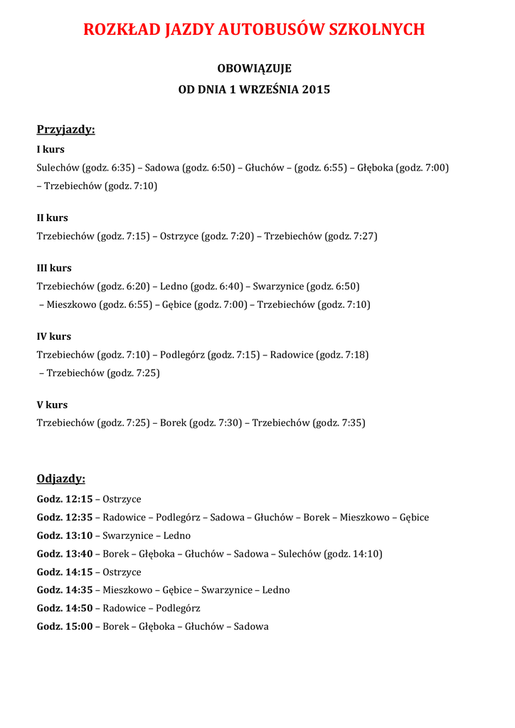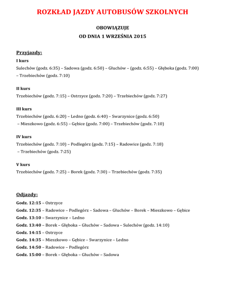 ROZKŁAD JAZDY AUTOBUSÓW SZKOLNYCH OBOWIĄZUJE OD DNIA 1 WRZEŚNIA 2015 Przyjazdy: I kurs Sulechów (godz. 6:35) – Sadowa (godz. 6:50) – Głuchów – (godz. 6:55) – Głęboka (godz. 7:00) – Trzebiechów (godz. 7:10) II kurs Trzebiechów (godz. 7:15) – Ostrzyce (godz. 7:20) – Trzebiechów (godz. 7:27) III kurs Trzebiechów (godz. 6:20) – Ledno (godz. 6:40) – Swarzynice (godz. 6:50) – Mieszkowo (godz. 6:55) – Gębice (godz. 7:00) – Trzebiechów (godz. 7:10) IV kurs Trzebiechów (godz. 7:10) – Podlegórz (godz. 7:15) – Radowice (godz. 7:18) – Trzebiechów (godz. 7:25) V kurs Trzebiechów (godz. 7:25) – Borek (godz. 7:30) – Trzebiechów (godz. 7:35) Odjazdy: Godz. 12:15 – Ostrzyce Godz. 12:35 – Radowice – Podlegórz – Sadowa – Głuchów – Borek – Mieszkowo – Gębice Godz. 13:10 – Swarzynice – Ledno Godz. 13:40 – Borek – Głęboka – Głuchów – Sadowa – Sulechów (godz. 14:10) Godz. 14:15 – Ostrzyce Godz. 14:35 – Mieszkowo – Gębice – Swarzynice – Ledno Godz. 14:50 – Radowice – Podlegórz Godz. 15:00 – Borek – Głęboka – Głuchów – Sadowa